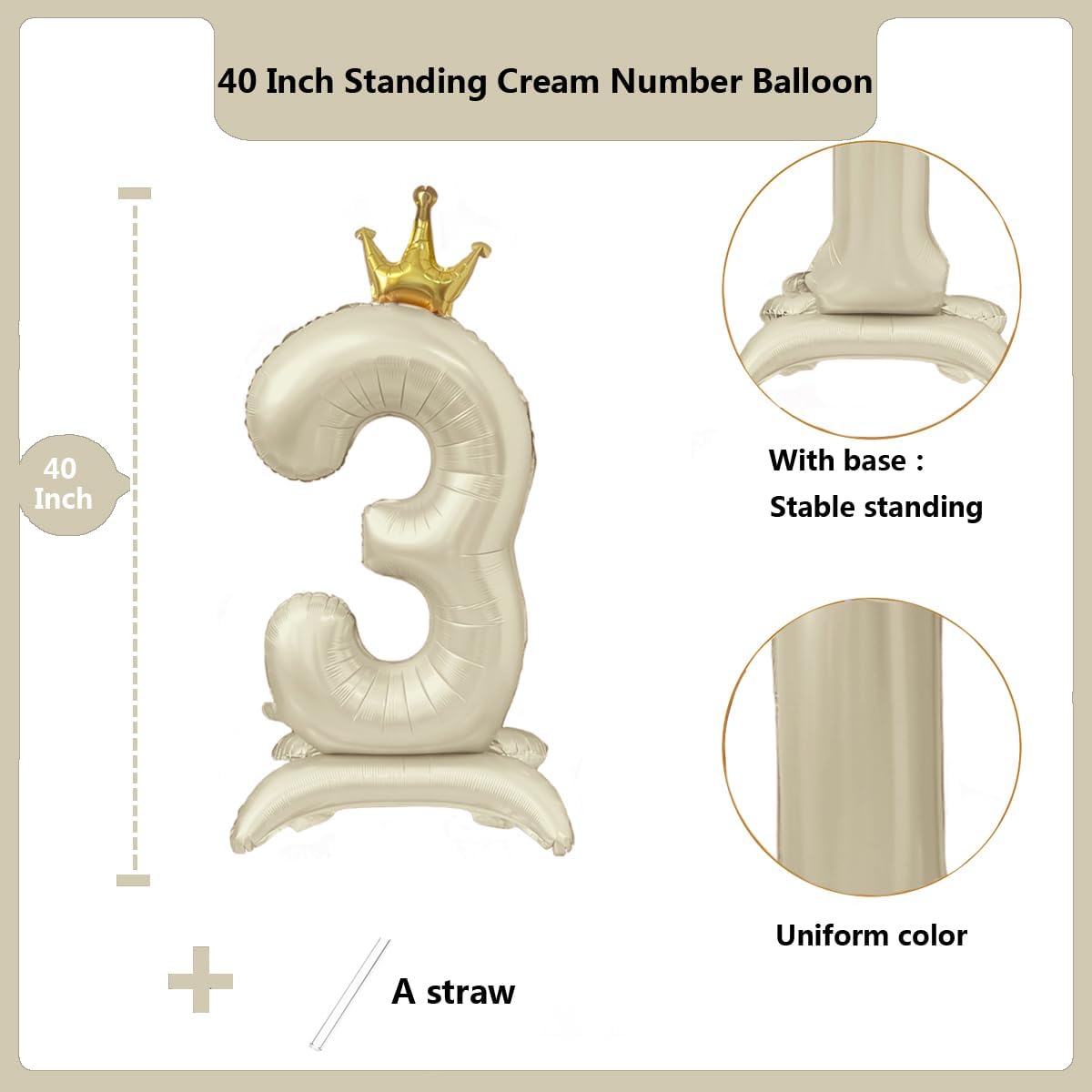 La confezione include: Palloncino numero 3 bianco crema da 42" (non gonfiato) + cannuccia Può essere gonfiato con elio o aria, utilizzare la pompa o la cannuccia per gonfiare il palloncino. Una volta terminato il gonfiaggio, adagiare la palla in piano, la palla uscirà automaticamente dalla colla sigillante e durerà a lungo. Rilascia l'elio e riutilizza i palloncini. Palloncino con numero corona con base per una posizione stabile; i numeri possono essere combinati come desideri. Questo palloncino è autosigillante, non è necessario legarlo dita Materiale: pellicola di alluminio, colore uniforme, bellissima forma sferica. Ottimo per feste di compleanno, matrimoni, Natale, Capodanno, Halloween, anniversari, baby shower, feste di laurea.