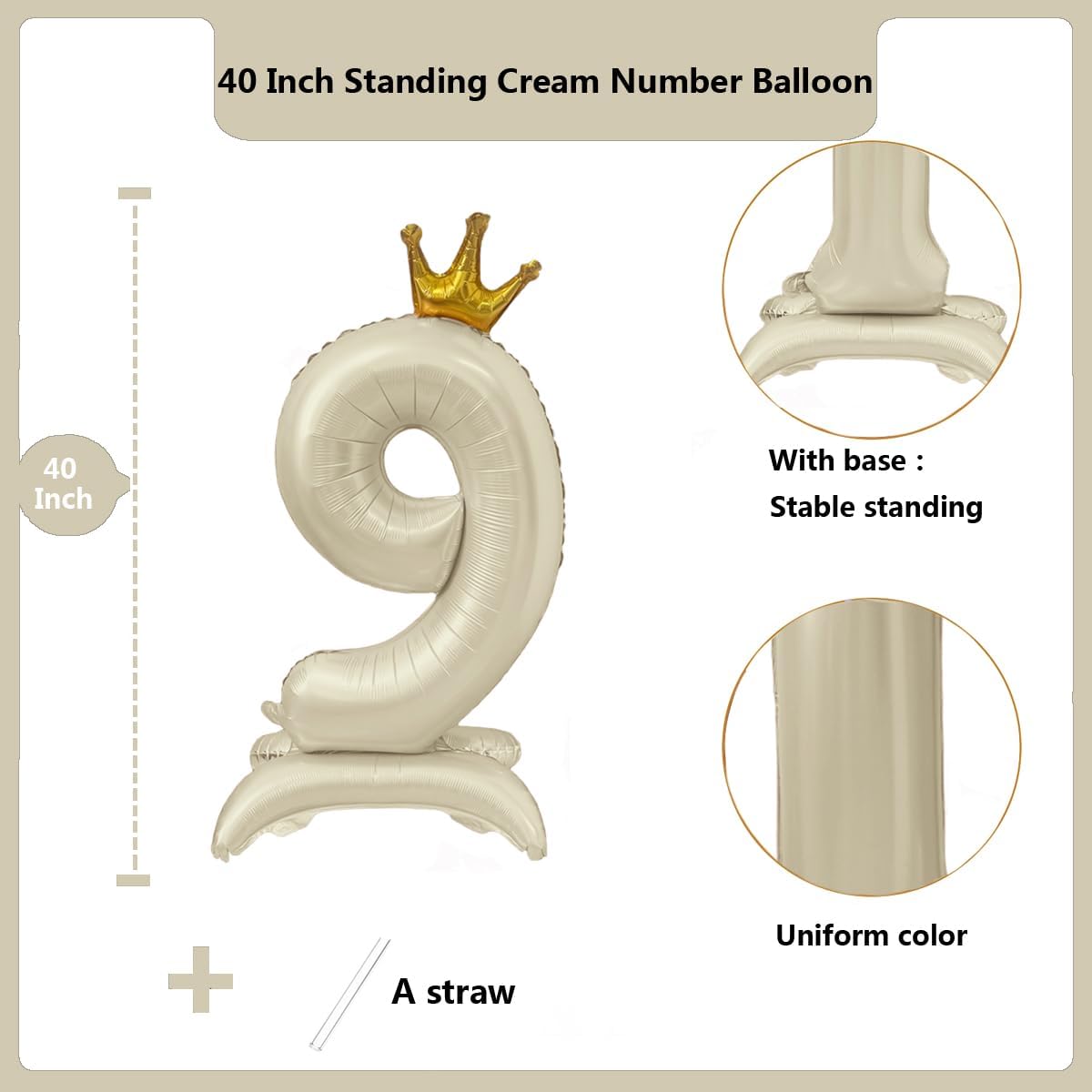 La confezione include: Palloncino numero 9 bianco crema da 40" (non gonfiato) + cannuccia Può essere gonfiato con elio o aria, utilizzare la pompa o la cannuccia per gonfiare il palloncino. Una volta terminato il gonfiaggio, adagiare la palla in piano, la palla uscirà automaticamente dalla colla sigillante e durerà a lungo. Rilascia l'elio e riutilizza i palloncini. Palloncino con numero corona con base per una posizione stabile; i numeri possono essere combinati come desideri. Questo palloncino è autosigillante, non è necessario legarlo dita Materiale: pellicola di alluminio, colore uniforme, bellissima forma sferica. Ottimo per feste di compleanno, matrimoni, Natale, Capodanno, Halloween, anniversari, baby shower, feste di laurea.