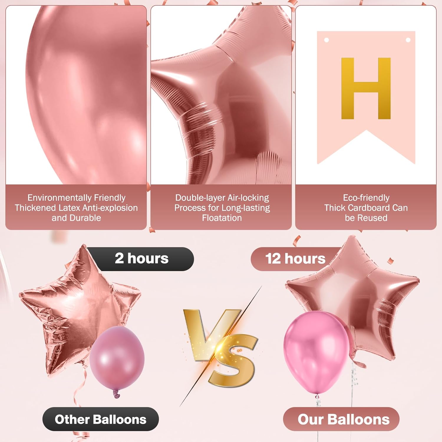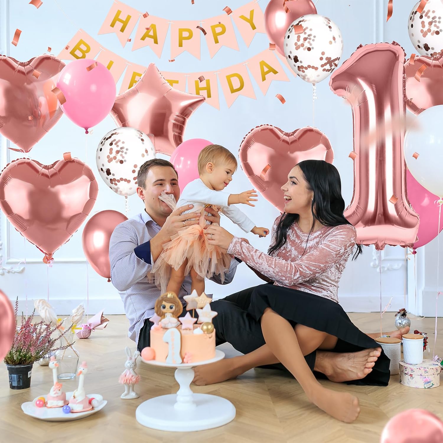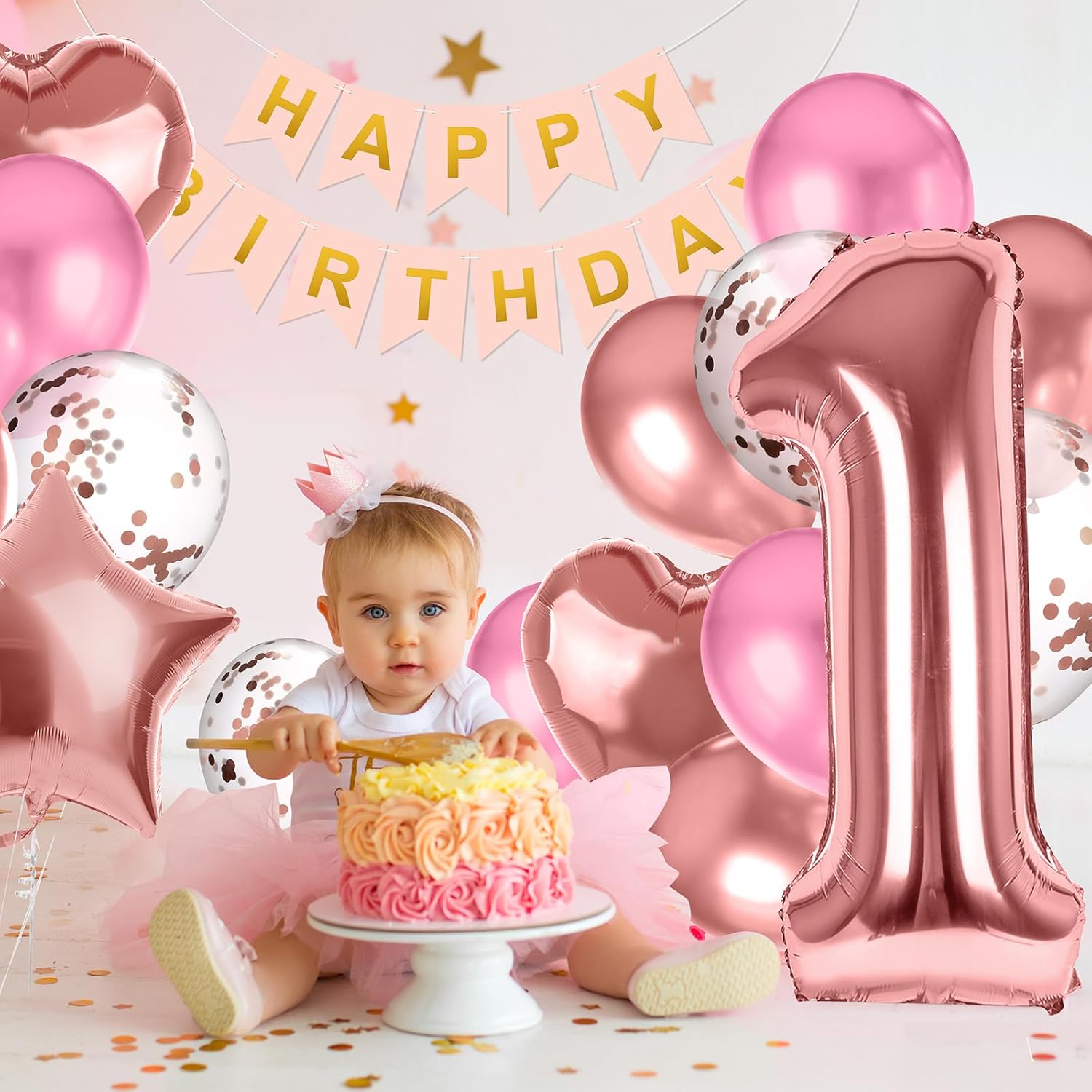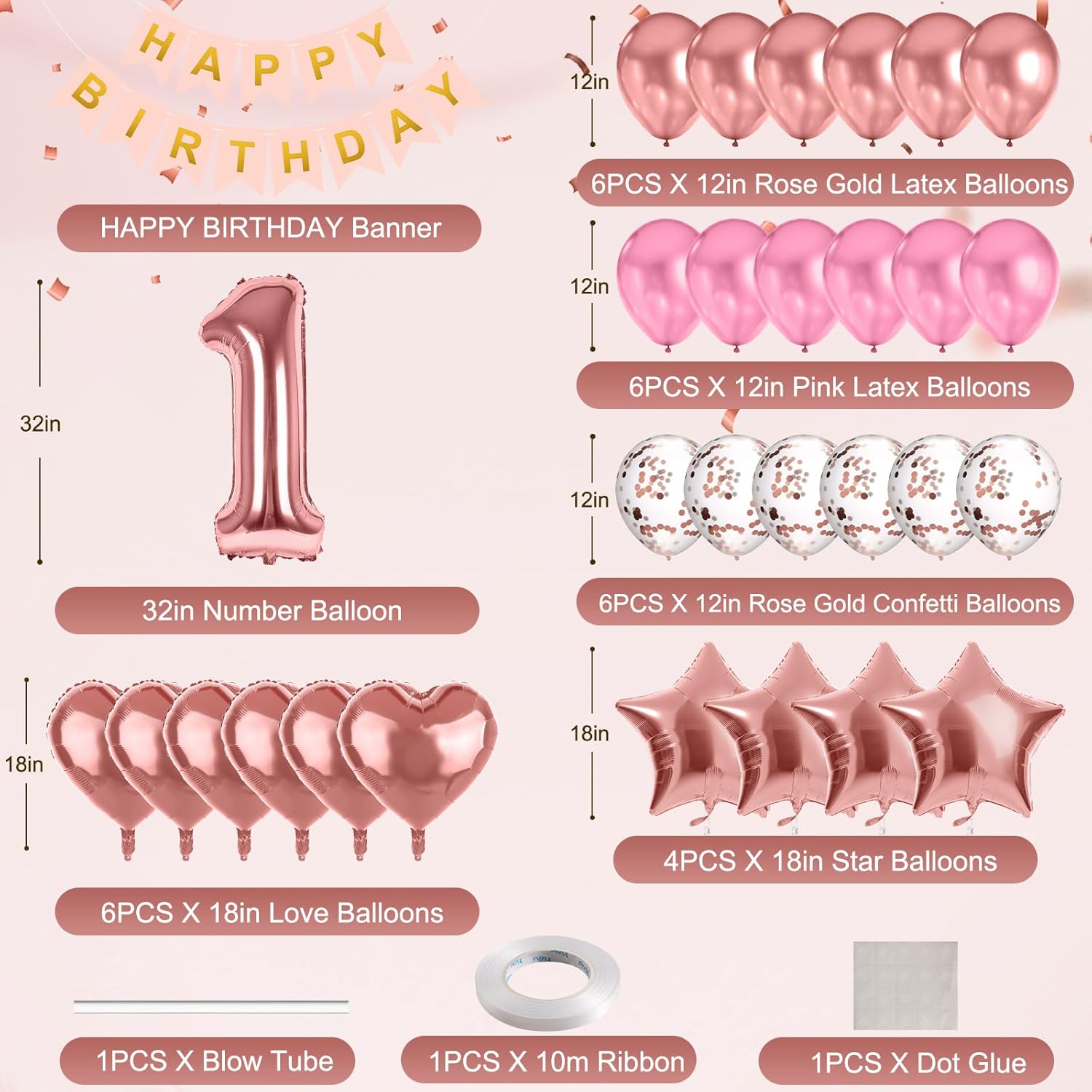 【Kit di palloncini per compleanno include】Striscione "HAPPY BIRTHDAY" x1, Palloncino in foglio con numero "1" da 32 pollici x1, Palloncini a cuore in foglio da 18 pollici x6, Palloncini a stella in foglio da 18 pollici x4, Palloncini in lattice rosa oro da 12 pollici x6, Palloncini in lattice rosa da 12 pollici x6, Palloncini con coriandoli da 12 pollici x6, Nastro da 10m x2, Punti adesivi x1, Cannula per gonfiare/sgonfiare x1, Manuale x1. Set completo di decorazioni per compleanno, nessun acquisto aggiuntivo necessario, risparmia tempo e budget, niente stress di abbinamento! 【Tema dell'età e design accattivante】Il kit contiene palloncini in foglio con numeri, personalizzabili per età specifiche. Palloncini e striscione abbinati creano facilmente una scenografia personalizzata, perfetta per celebrare momenti importanti della vita. Palloncini con coriandoli e in foglio aumentano l'allegria della festa, ideali come sfondo per foto. 【Materiali sicuri ed ecologici】Realizzati in lattice spesso e sicuro o in foglio di alta qualità, resistenti alla rottura dopo il gonfiaggio. Senza odori irritanti, sicuri per bambini e adulti. Lo striscione è in cartone spesso ecologico e riutilizzabile. Suggerimento: agitare leggermente i palloncini con coriandoli per far aderire i coriandoli con l'elettricità statica. 【Facile da usare e assemblare】 Supporta il gonfiaggio con elio o manuale. Il design rinforzato a doppio strato assicura che i palloncini galleggino per oltre 12 ore, evitando che si sgonfino durante la festa e garantendo momenti perfetti per le foto. Include punti adesivi e nastri gratuiti per fissare facilmente i palloncini. I palloncini in foglio di alluminio sono dotati di valvole autosigillanti, che eliminano la necessità di annodarli. 【Ampia versatilità d'uso】Perfetto per soggiorno, camera, giardino o ristorante. Decora senza ingombrare e crea un'atmosfera festosa e accogliente per una festa di compleanno riuscita.