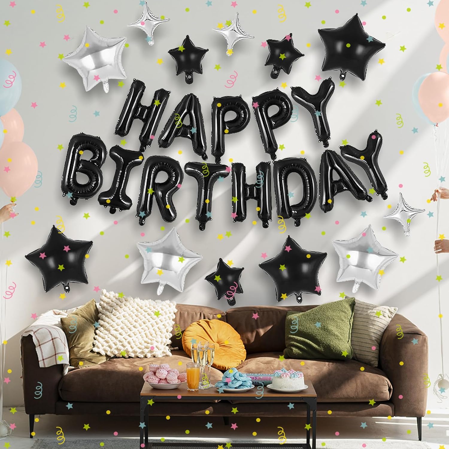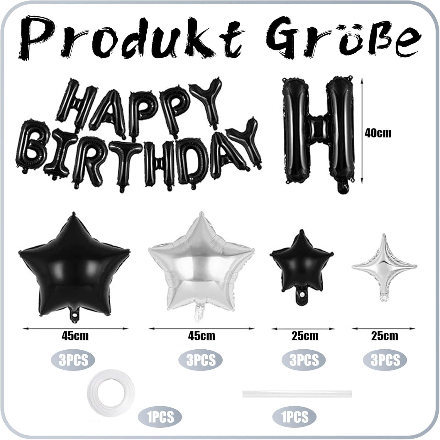 DECORAZIONE NERA DI COMPLEANNO: Questo set contiene 27 palloncini neri di alta qualità, inclusi 13 palloncini foil da 40 cm che formano la parola "Happy Birthday" - perfetti come "palloncino Happy Birthday" o "palloncino con lettera". Ci sono 2 palloncini neri a forma di cuore (45 cm), 5 palloncini in lattice neri e 5 palloncini in lattice coriandoli (30 cm ciascuno). Con 10 m di nastro di seta e bastone di gonfiaggio, la tua "decorazione di compleanno nera" riuscirà senza sforzo. Decorazione di compleanno: i nostri "palloncini neri" sono realizzati con pellicola di alluminio e lattice di alta qualità. Le varianti “palloncino compleanno” sono robuste e riutilizzabili, con una superficie liscia per un aspetto elegante. I "Palloncini in lattice neri" sono elastici, resistenti e i "Palloncini in lattice coriandoli" forniscono un ulteriore elemento di sorpresa. Tutti i palloncini neri sono sicuri ed ecologici, quindi non devi preoccuparti di nulla. Adatto a diverse occasioni: questo set di palloncini "decorazione di compleanno per uomo" è versatile, sia come "decorazione di compleanno" per uomini, donne o bambini. Usalo come decorazione per una festa, sfondo fotografico o articolo regalo. La "ghirlanda nera di buon compleanno", i "palloncini di buon compleanno" e i "palloncini neri" donano ad ogni festa un'atmosfera indimenticabile e garantiscono un fantastico effetto visivo. "Buon Compleanno": Con queste "decorazioni di compleanno", ogni occasione sarà un'attrazione Facile da usare: I palloncini sono facili da riempire: I palloncini in foil "Buon Compleanno" hanno valvole autosigillanti e possono essere riempiti con aria o elio. I palloncini in lattice possono anche essere facilmente gonfiati. Con il nastro di seta da 10 m puoi posizionare la ghirlanda Happy Birthday in modo flessibile e mettere in risalto senza sforzo il tuo Happy Birthday. Quindi la tua "decorazione di compleanno" attirerà tutti gli sguardi in pochissimo tempo. Promemoria caldo: i palloncini Ovanda possono avere un leggero odore quando vengono ricevuti. Basta allungarli per farli arieggiare per un po'. Se avete domande sui nostri prodotti, non esitate a contattarci. Ti daremo una risposta soddisfacente entro 24 ore