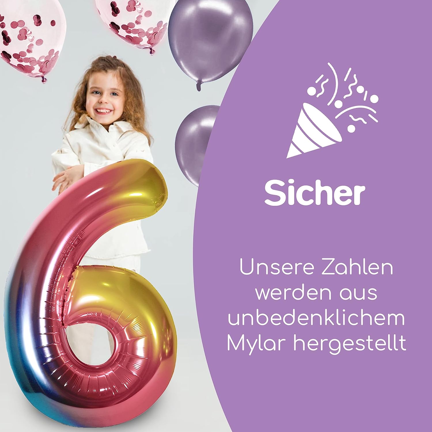 PALLONCINO N. 6: Nei colori dell'arcobaleno. Palloncino foil XXL Arcobaleno 40" (101 cm). Lavorazione di alta qualità, per bellissimi momenti di compleanno, feste e anniversari. Adatto a ogni bambino che compie gli anni! AIUTO PER IL GONFIAGGIO INCLUSO, pronto per l'uso in pochi minuti! I palloncini foil possono essere riempiti con elio o aria. La valvola si chiude automaticamente e trattiene l'elio fino a 8 giorni. ELIO O ARIA: I palloncini numerati possono essere riempiti con elio o aria. Il gonfiaggio può essere effettuato utilizzando un semplice tubo di gonfiaggio. (compreso negli accessori) e richiede solo pochi minuti. La valvola si chiude automaticamente e trattiene l'elio fino a 8 giorni. FACILE DA FISSARE: I palloncini sono dotati ciascuno di quattro linguette per il fissaggio. Puoi semplicemente appendere i palloncini pieni d'aria al soffitto per una grande sorpresa e dare alla festa quel qualcosa in più.