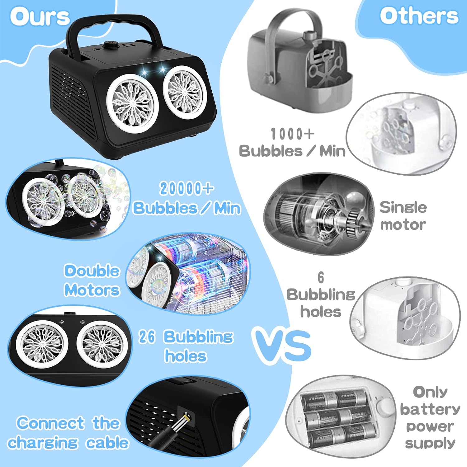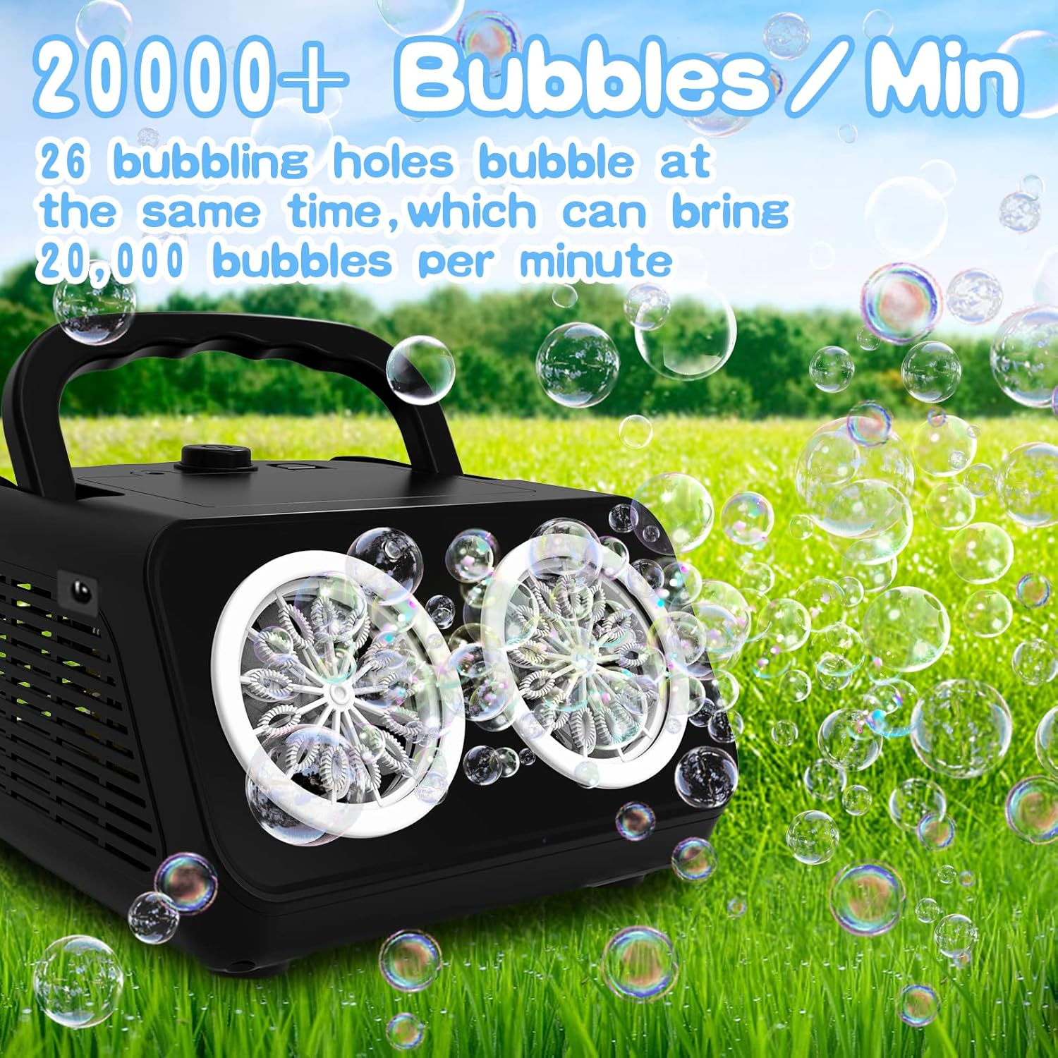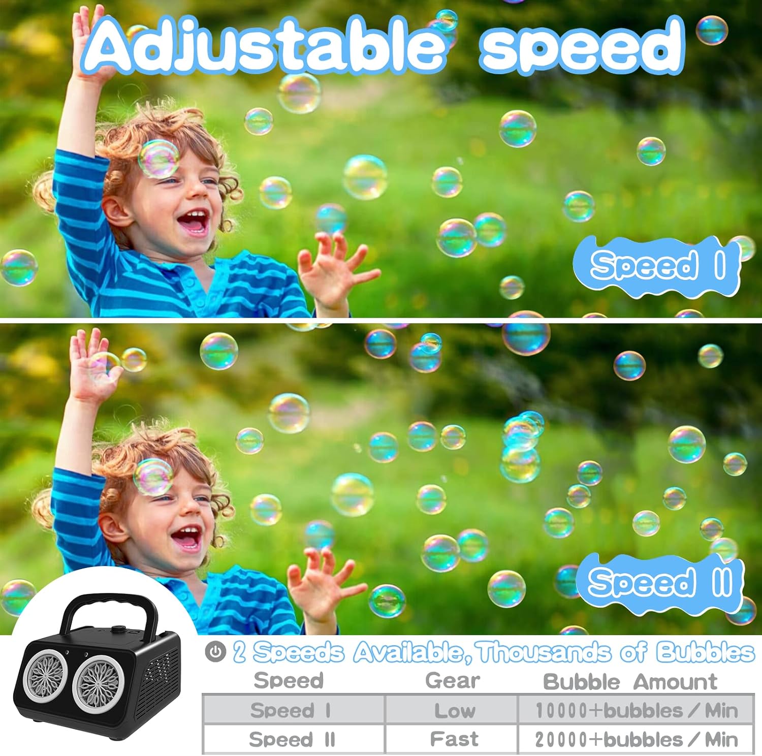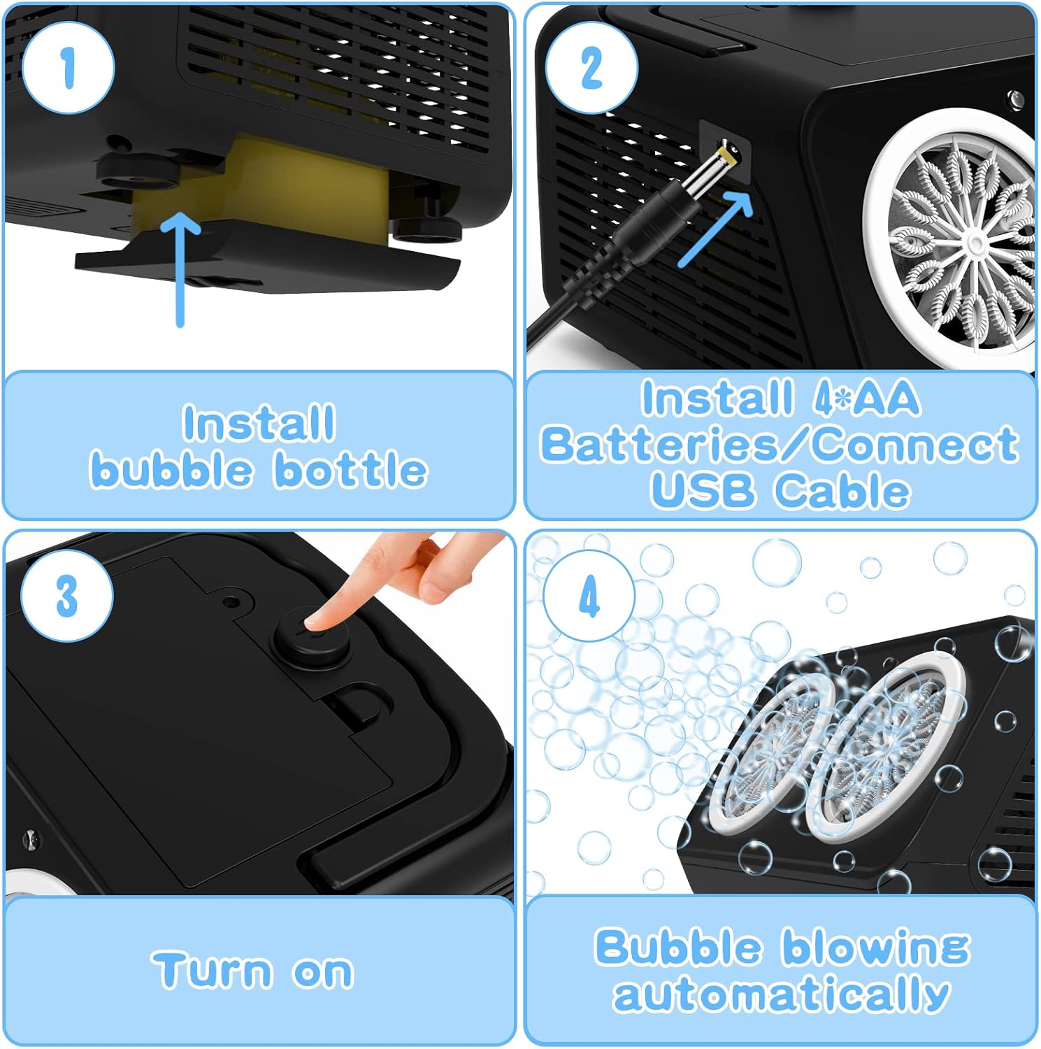 【20.000+ Bolle al Minuto】La macchina per bolle Panacare ha 26 fori per bolle e un potente doppio motore che può soffiare oltre 20.000 bolle al minuto. Le bolle volano più lontano e più lontano grazie ai due motori. Gira l'interruttore e verrai immediatamente trasportato in un mondo di bolle colorate. Ti offriamo anche l'acqua con le bolle, quindi sperimenta subito questo meraviglioso mondo di bolle. 【Frequenza delle bolle regolabile】 È possibile regolare due diverse frequenze delle bolle. Posizione Ⅰ: 10.000+ bolle/min, Posizione Ⅱ: 20.000+ bolle/min. Quando si preme l'interruttore per la prima volta, le bolle appaiono solo su un lato. Premere due volte l'interruttore per produrre bolle su entrambi i lati. Puoi regolare il numero di bolle in base alle tue esigenze. 【Design sicuro per i bambini】 La macchina per bolle per bambini aggiornata è realizzata con materiali atossici e parti di sicurezza di alta qualità, ha ottenuto i certificati CE, EN71, CPSIA, ASTM e CPC. La superficie è liscia e priva di bave per proteggere le mani dei bambini da graffi e lesioni. 【Due tipi di alimentazione e design portatile】. È possibile utilizzare il cavo USB incluso o collegare quattro batterie AA (non incluse). Leggera e di piccole dimensioni, la maniglia è progettata per essere facile da trasportare, anche per i bambini da sollevare. Applicazione: la macchina automatica per bolle di sapone è uno strumento per creare un'atmosfera romantica e sognante, ideale per matrimoni, compleanni, feste e vari altri eventi. Inoltre, può essere regalato ad amici e parenti.