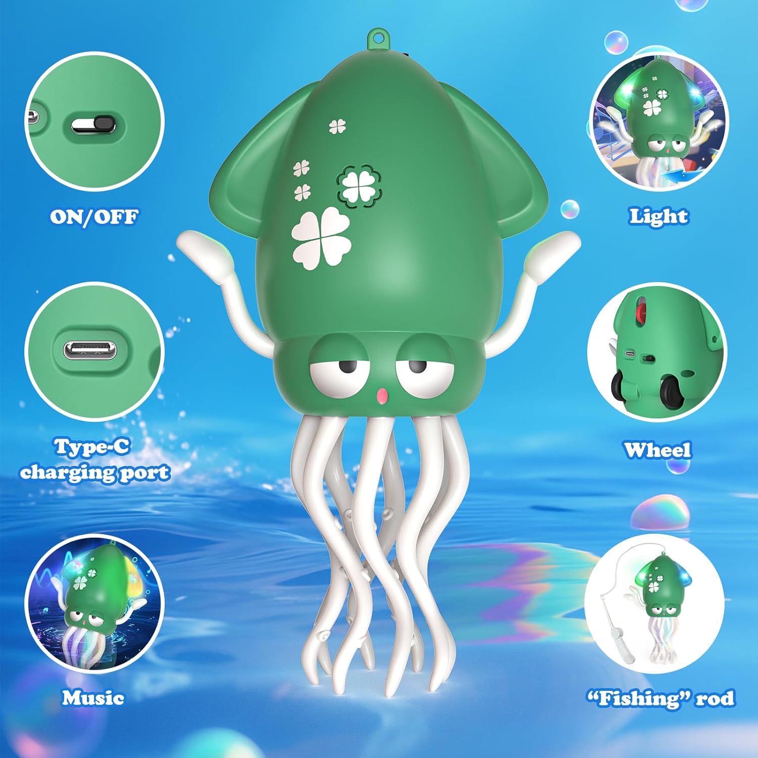 🐙Giocattolo magico danzante: alimentati da un motore, i tentacoli del polpo si contorcono allegramente e il suo corpo ruota e oscilla, eseguendo una "danza magica" ritmica. 🐙Spettacolo di luci colorate: dotato di luci LED colorate che lampeggiano e cambiano al ritmo della musica, creando un'atmosfera da sogno in un ambiente buio e attirando immediatamente l'attenzione. 🐙Evitamento intelligente degli ostacoli reclinabili e scorrevoli: l'innovativa tecnologia di scorrimento "modalità reclinabile", combinata con un sistema di sensori intelligente, gira o evita automaticamente gli ostacoli, garantendo un movimento fluido senza preoccuparsi di rimanere bloccati o danneggiati. 🐙Gioioso giocattolo musicale: il giocattolo per bambini ha musica incorporata, attivazione con un solo pulsante, con luci, danza e suono sincronizzati, crea un'esperienza audiovisiva coinvolgente, accende immediatamente l'umore gioioso ed è un prezioso aiuto per ravvivare l'atmosfera. 🐙Divertente interazione con la pesca: canna da pesca inclusa, i bambini possono interagire con il polpo controllando la canna, allenando la coordinazione occhio-mano e aggiungendo divertimento di controllo e tempo di interazione genitore-figlio. 🐙Comoda ricarica USB: batteria al litio ricaricabile integrata, interfaccia USB universale (tipo C è migliore), pronta per l'uso dopo la ricarica. Rispettoso dell'ambiente e risparmio energetico, eliminando il fastidio di frequenti acquisti e sostituzioni della batteria.