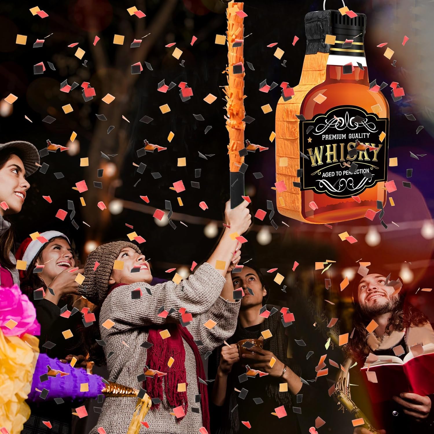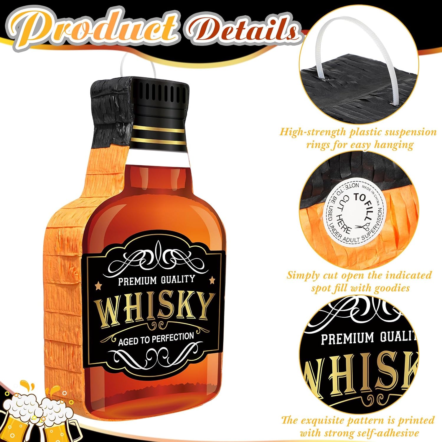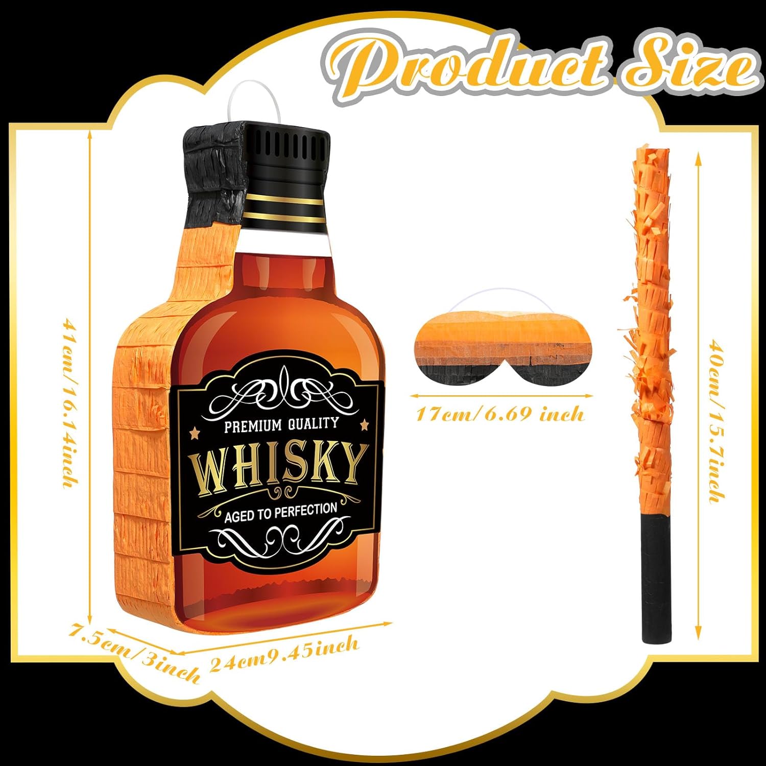 Set piñata per feste per adulti: il pacchetto include un set completo di piñata al whisky. C'è 1 pinata bottiglia di whisky, 1 bastoncino di pinata rosso e nero, 1 maschera per gli occhi con nappa nera, 1 sacchetto di coriandoli gialli, arancioni e neri. Possono essere le tue bellissime decorazioni per feste per adulti e giochi di società. Piñata da festa: puoi utilizzare questo set di piñata al whisky per varie feste, come addii al nubilato, addii al nubilato, matrimoni, feste di compleanno, feste di anniversario, feste di fidanzamento, addii al nubilato, Capodanno, feste di whisky e altro ancora. This will add fun to your adult party activity Fun to play: You can invite your family and friends to hit the piñata of the whiskey glass while blindfolded until the gifts fall out of the contents. Durante questo processo, gli altri possono, a turno, colpire la piñata o indovinare chi la romperà. Tutti alla festa lo apprezzeranno. Grandi dimensioni: la dimensione della piñata da festa al whisky è di circa 41 x 24 x 7,5 cm, mentre il bastoncino della pignatta è di circa 1 x 15,8 pollici / 2,5 x 40 cm. Sono facili da tenere e utilizzare sia per uomini che per donne. abbastanza per contenere abbastanza oggetti Forte e robusto: la nostra piñata e benda per whisky è realizzata in materiale cartaceo di alta qualità, che ha una buona tenacità e resistenza; Puoi mettere caramelle, biscotti, giocattoli, bomboniere, coriandoli e altro nella pinata senza preoccupazioni; Il bastoncino della pinata è realizzato in plastica PVC, leggera e resistente; they also come with lovely tassels that are nice and sturdy