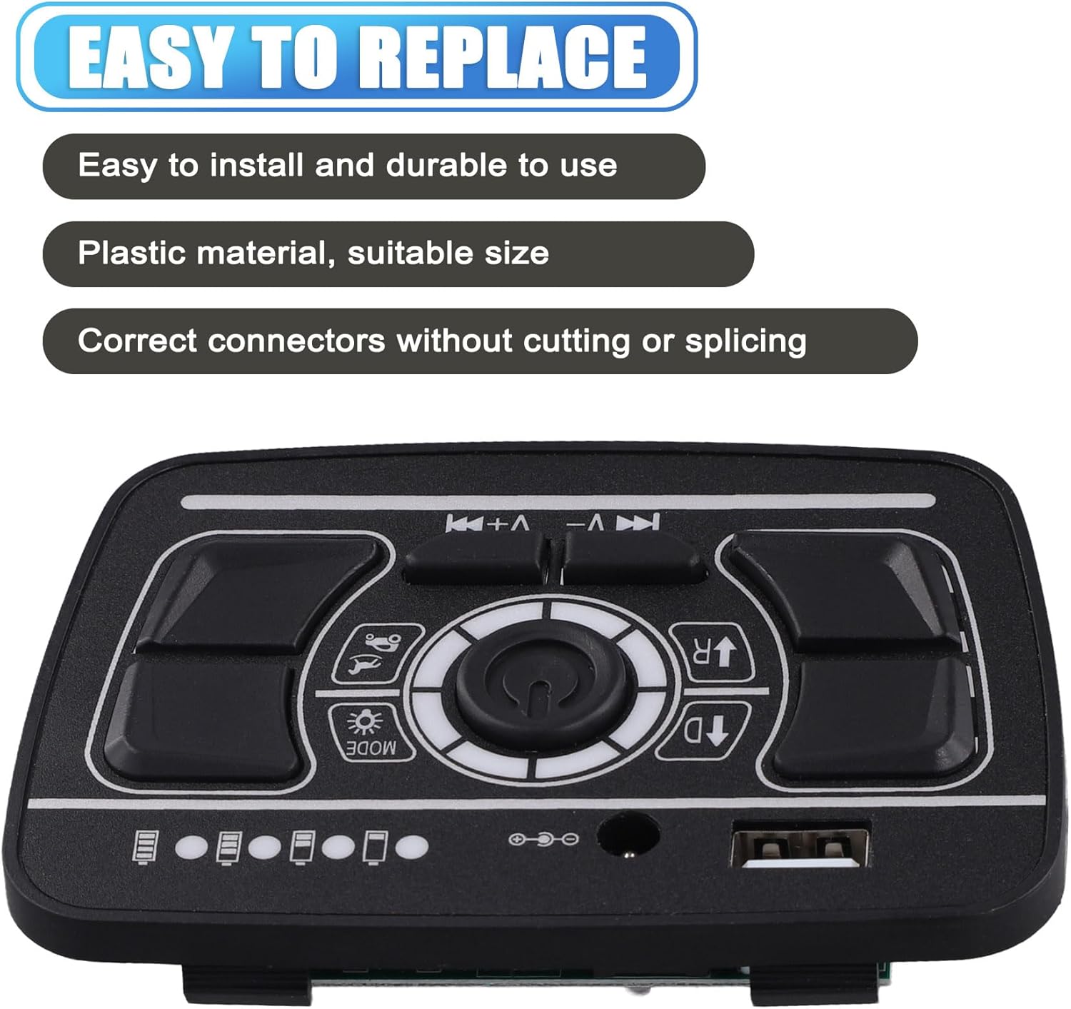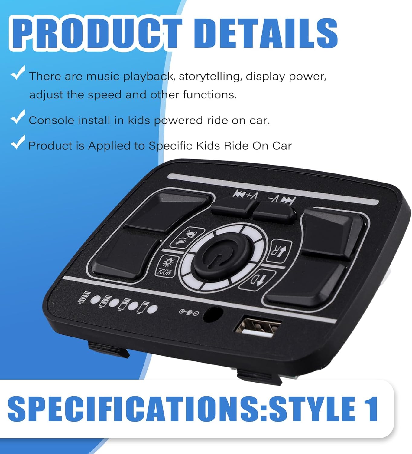 Il prodotto è applicato a specifiche auto da per bambini Installazione della console in un'auto elettrica per bambini. Ci sono riproduzione musicale, narrazione, potenza del display, regolazione della velocità e altre funzioni. Assicurati che la parte acquistata abbia lo stesso aspetto di quella