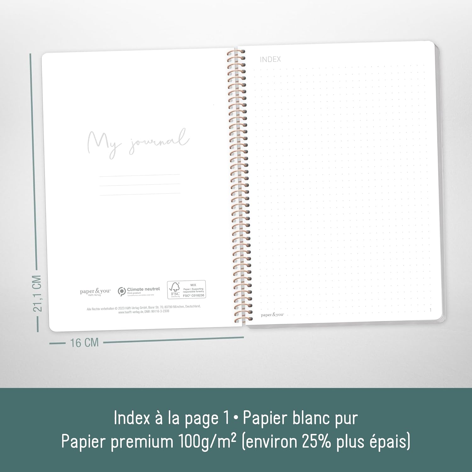 IL TUO NUOVO DIARIO A5 A PUNTINI - della Häfft-Verlag con attraente stampa a caldo, copertina morbida con nobile superficie opaca e rilegatura a spirale: per bullet journaling, scritte a mano, schizzi, progetti, pensieri, obiettivi o semplicemente per i tuoi appunti quotidiani :-) POSIZIONAMENTO PERFETTO GRAZIE ALLA SPIRALE - La pratica rilegatura a spirale consente di aprire il taccuino a 360°. Aperto o piegato, rimane piatto e offre quindi una piacevole esperienza di scrittura in tutte le posizioni. FAI UN REGALO A TE STESSO E AI GLI ALTRI - Ideale per i principianti o come regalo carino - mettiamo volentieri da parte il nostro smartphone per tirare fuori le nostre matite per questo diario chic! La carta da 100 g/m² è adatta a molti tipi di penne. TANTI MODELLI DIVERSI - ce n'è per tutti i gusti e bello da collezionare: diario con 160 pagine numerate / 80 fogli nel pratico formato A5 (16 x 21,1 cm), distanza tra i punti: 0,5 cm SOSTENIBILE E RISPETTOSO DEL CLIMA - Sii creativo quanto vuoi pur avendo la coscienza a posto: per amore dell'ambiente, la nostra carta premium da 100 g/m² è certificata FSC (FSC N004440) e stampato nel rispetto del clima.