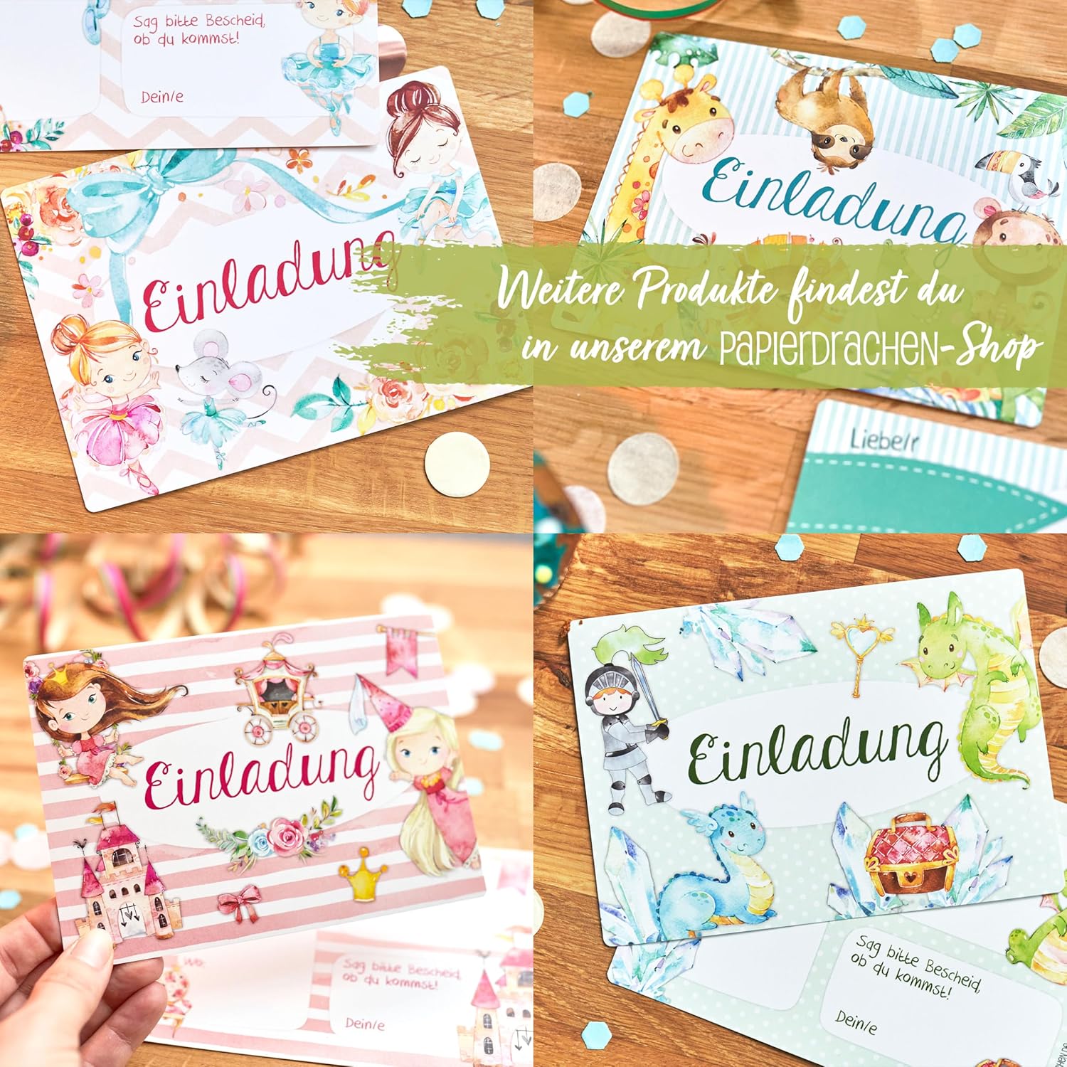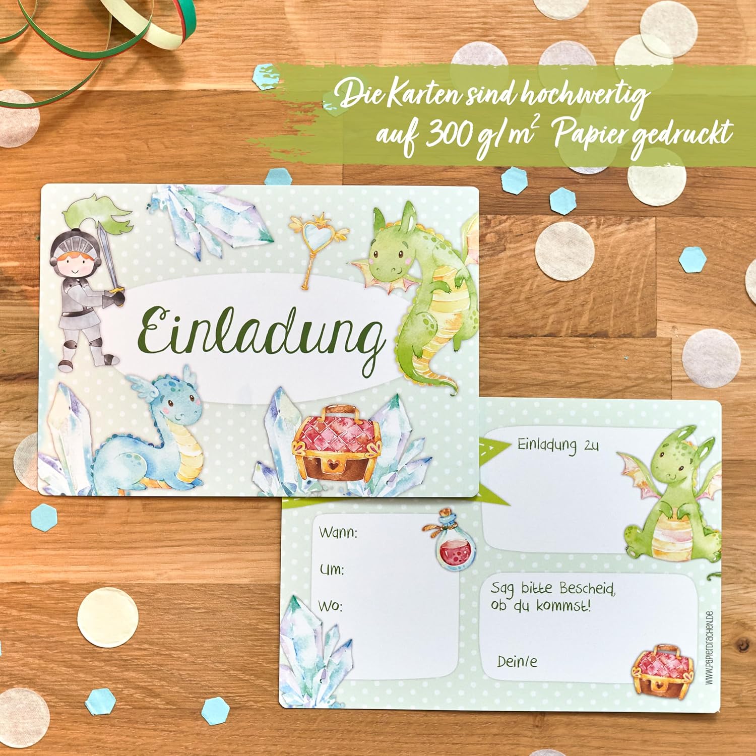 12 biglietti d'invito per il prossimo compleanno dei bambini o qualsiasi altra festa, con motivo a cavalieri adatti ai bambini Non solo per il compleanno: puoi scrivere l'occasione da solo, in modo da poter utilizzare i biglietti anche per compleanno, inizio della scuola, baby shower e tutte le altre occasioni Ogni biglietto d'invito offre spazio sufficiente per tutte le informazioni importanti come data, luogo e ora Made in Germany: alta qualità stampata su carta spessa 300 g/m² Più di draghi di carta, ad esempio biglietti di invito, biglietti di auguri, sacchetti regalo, bandierine, tatuaggi per bambini dalla Germania e molto altro ancora