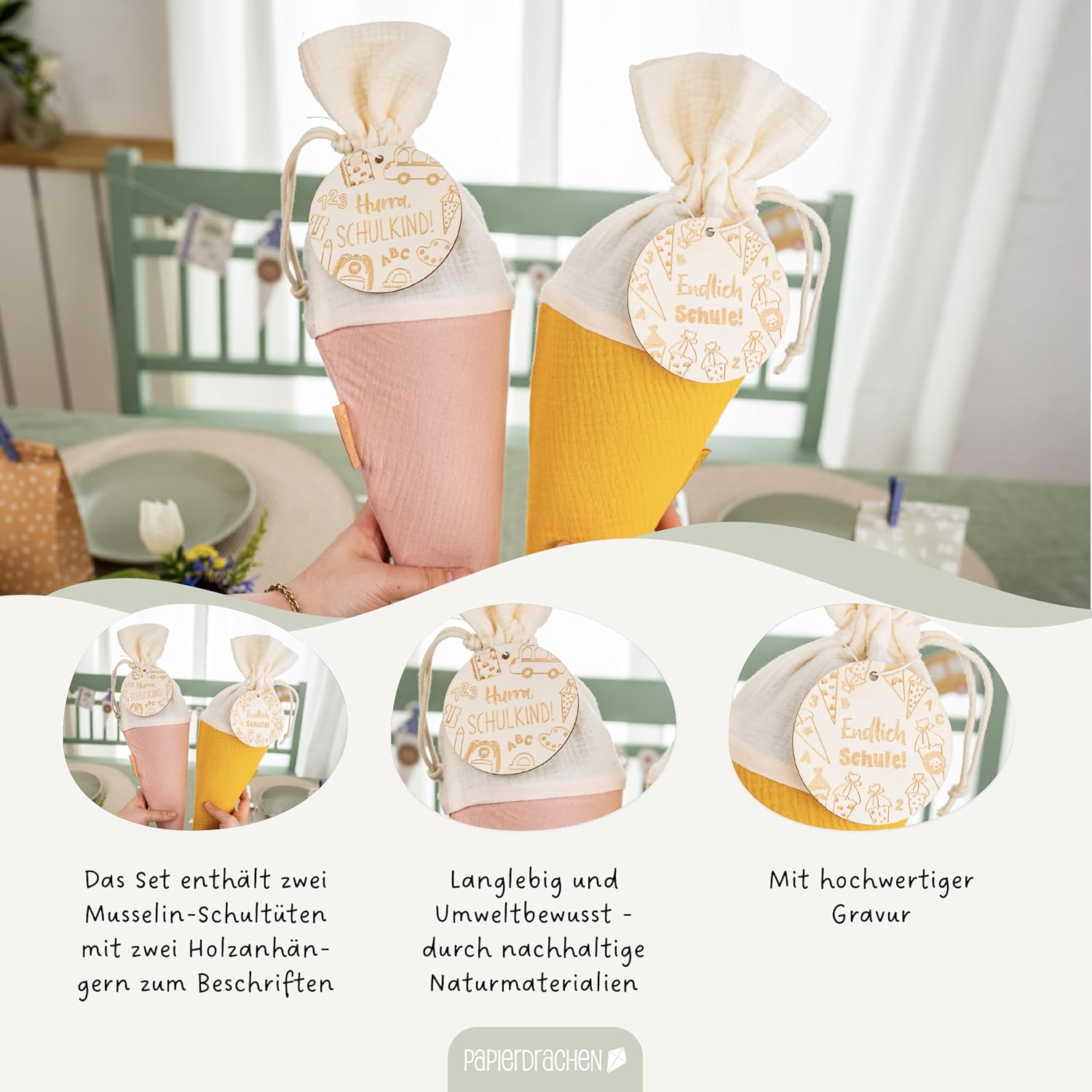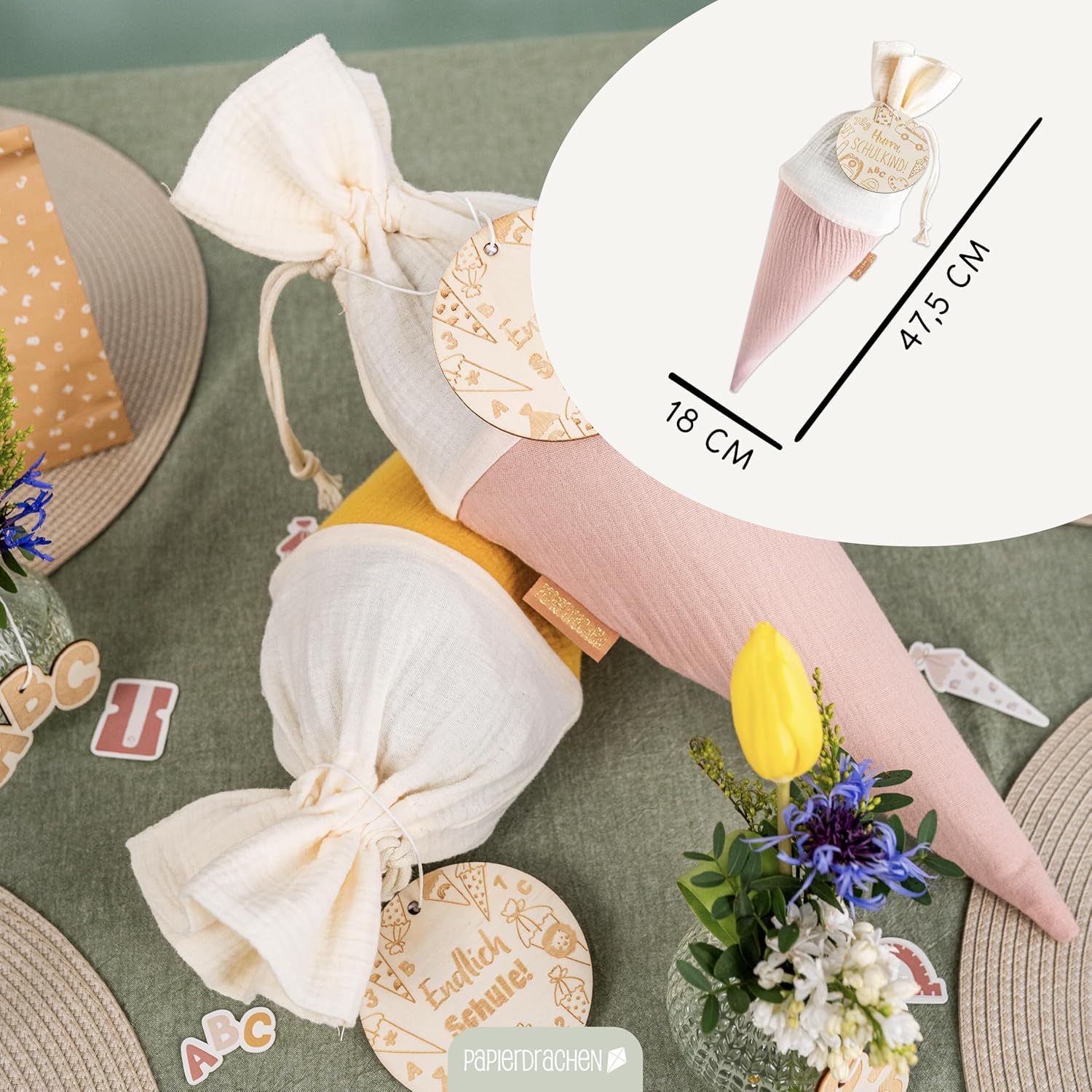 Idea regalo: un bambino viene addestrato nel quartiere? Questi graziosi sacchetti per la scuola sono ideali come piccoli pensieri per la prima elementare Pratico: il cono per la scuola è dotato di un pratico cordino che consente una chiusura facile e sicura. Contenuto della confezione: riceverete un set di 2 sacchetti per la scuola in mussola nei colori rosa e giallo, con ciondolo in legno e cordino ❤️Concetto: complemento ideale per il nostro assortimento scolastico: da noi troverete quaderni, quaderni, set di scrittura con gomma, temperamatite, blocco e penna, mini bottoni, astucci, cartelline, etichette personalizzabili con nome e molto altro ancora Più scelta: disponiamo anche di molti accessori scolastici come gomma, penne, blocchi, quaderni, cartelline, blocchi per appunti, adesivi scolastici personalizzati e molto altro ancora. Guarda nel negozio