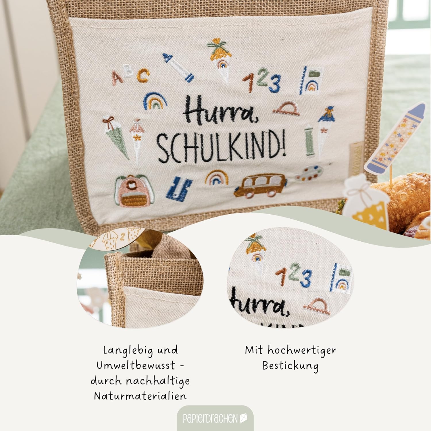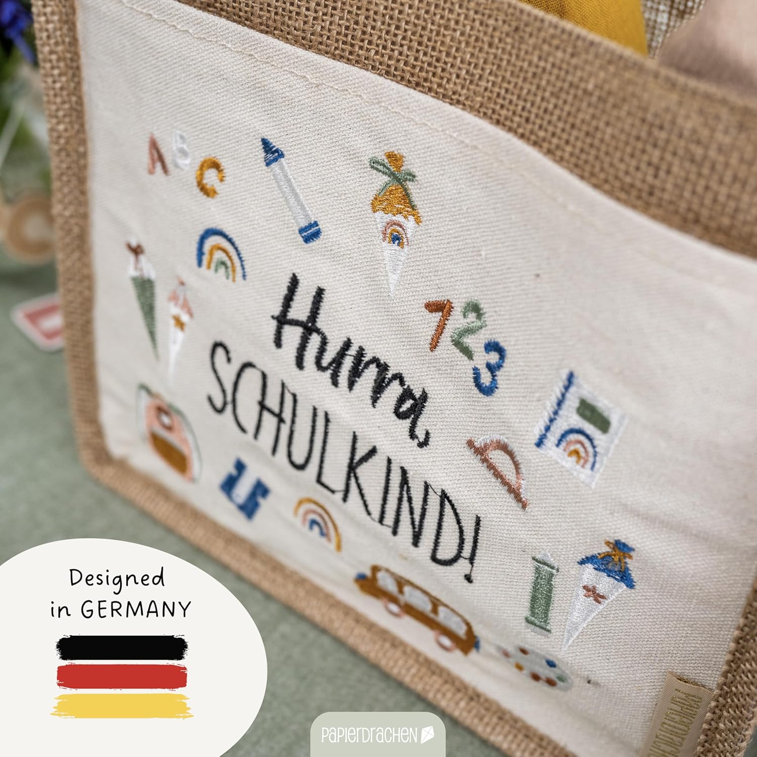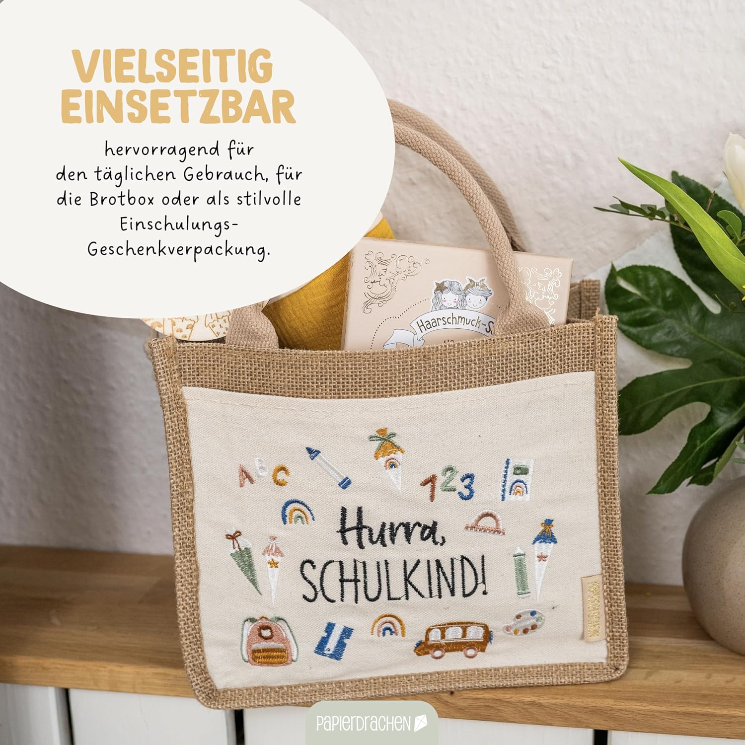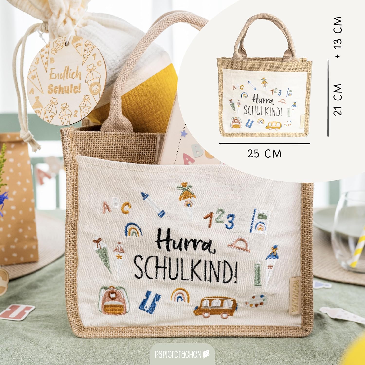 La nostra affascinante borsa di iuta Hurra, scolaro è il regalo perfetto per ogni orgoglioso fucile Abc e può essere utilizzato per riempire regali e dolci per la festa di scuola. Dettagli del prodotto: Materiale: la borsa è realizzata in 70% iuta, completata da una combinazione di 20% PVC, 5% cotone e 5% poliestere, che garantisce stabilità e durata. Dimensioni: con le dimensioni di 25 x 21 cm + 13 cm di manico, questa borsa offre spazio sufficiente per regali e dolci. Peso: leggero e maneggevole con un peso totale di soli 145 grammi, ideale per le mani dei bambini piccoli. Design: la parte anteriore è decorata con una scritta ricamata con amore Hurra, scolaro. Insieme a motivi colorati per la scuola che irradiano gioia e orgoglio. Tasca laterale aggiuntiva: perfetta per riporre piccoli oggetti. Multiuso: questa borsa è ideale non solo per riporre regali, ma anche per gite, picnic e altre attività ricreative. I materiali robusti e il design sofisticato garantiscono una lunga durata. Un grande regalo: sorprendi il tuo bambino, nipote o figlioccio con questa borsa di iuta progettata con amore. Un regalo che non è solo pratico, ma aumenta anche l'anticipazione della scuola. Contenuto della confezione: 1 borsa di iuta con manico.