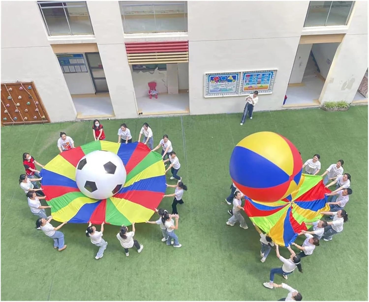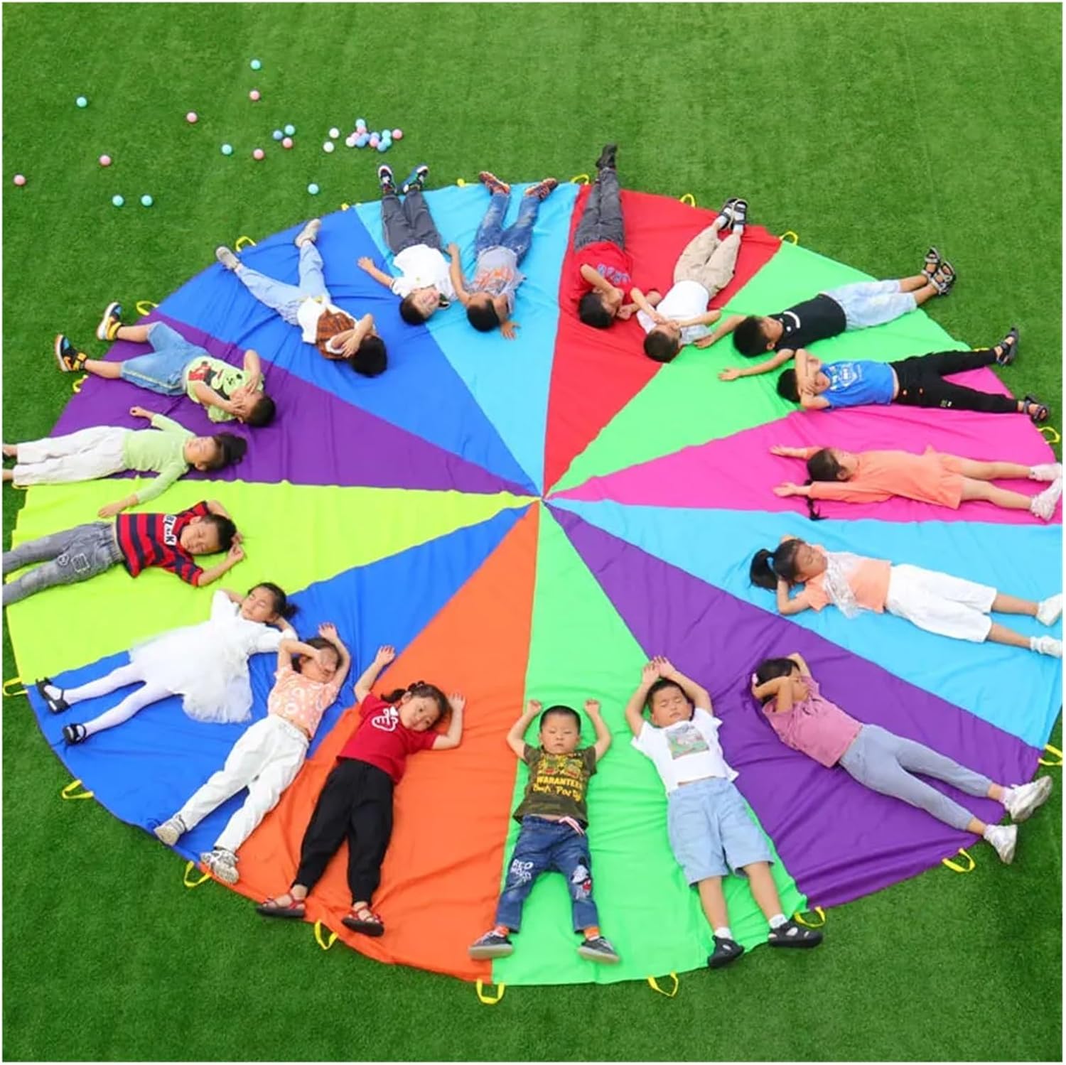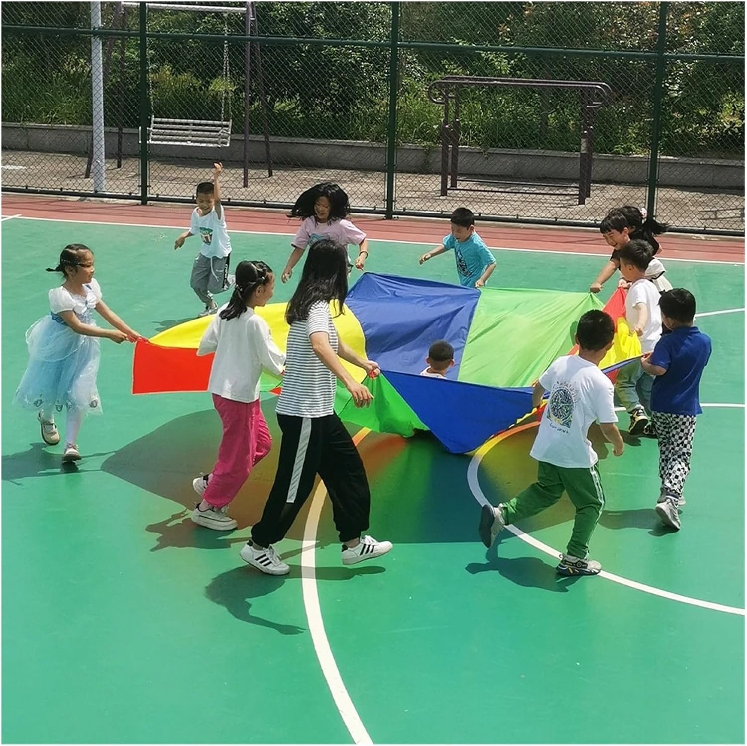 Materiale: il paracadute colorato è realizzato in tessuto leggero e resistente, progettato per un gioco sicuro e confortevole. Questo giocattolo con paracadute offre un vivido fascino visivo e garantisce un divertimento duraturo per i bambini durante il loro tempo di gioco. Divertimento interattivo: il nostro giocattolo con paracadute per bambini incoraggia il gioco cooperativo consentendo ai bambini di partecipare a giochi e attività di gruppo. Questa esperienza interattiva aiuta a sviluppare il lavoro di squadra e le capacità di coordinazione divertendosi. Uso versatile: il giocattolo con paracadute per bambini è perfetto per varie attività, tra cui giochi all'aperto, giochi al chiuso ed educazione fisica. È un'aggiunta versatile a qualsiasi set da gioco ed è molto apprezzata dai bambini. Design luminoso e colorato: con il suo vivace design arcobaleno, questo paracadute attira l'attenzione dei bambini e stimola la loro immaginazione. Il layout colorato rende ogni sessione di gioco emozionante e visivamente accattivante. Ideale per molteplici attività: ideali per il gioco individuale e di gruppo, i nostri giochi con paracadute per bambini possono essere utilizzati per giochi come "Popcorn" e "L'onda". Questa versatilità garantisce ore di divertimento, rendendolo un must per qualsiasi appuntamento o festa di gioco