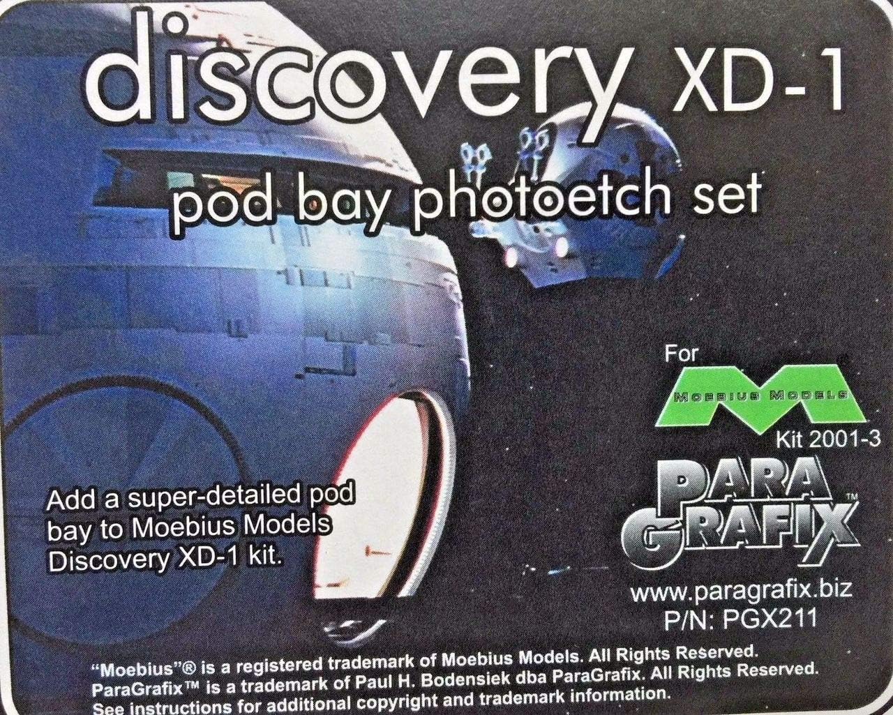 Aggiungi un vano per pod completamente dettagliato e facilmente illuminato al nuovo kit Discovery XD-1 di Moebius dal classico film "2001: A Space Odyssey!" Piegare il vano pod basato sui progetti dello studio. Le piattaforme sono realizzate per adattarsi ai tubi in ottone da 1,6 e 2,4 mm Albion Alloys** in modo che possano essere estese dallo scafo. Supporto salvaspazio con tute vuote. Per il kit: Moebius 2001-3.