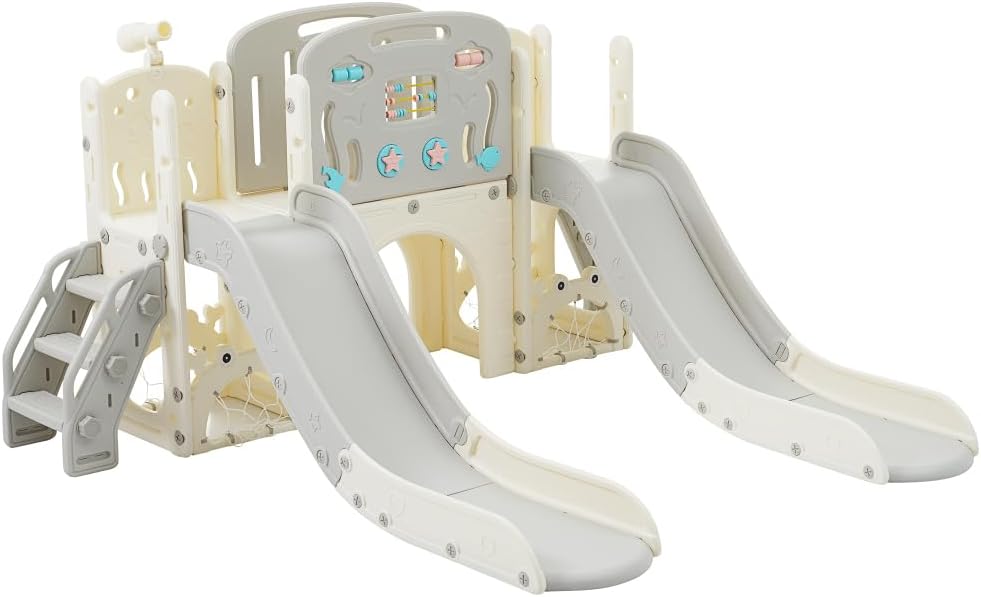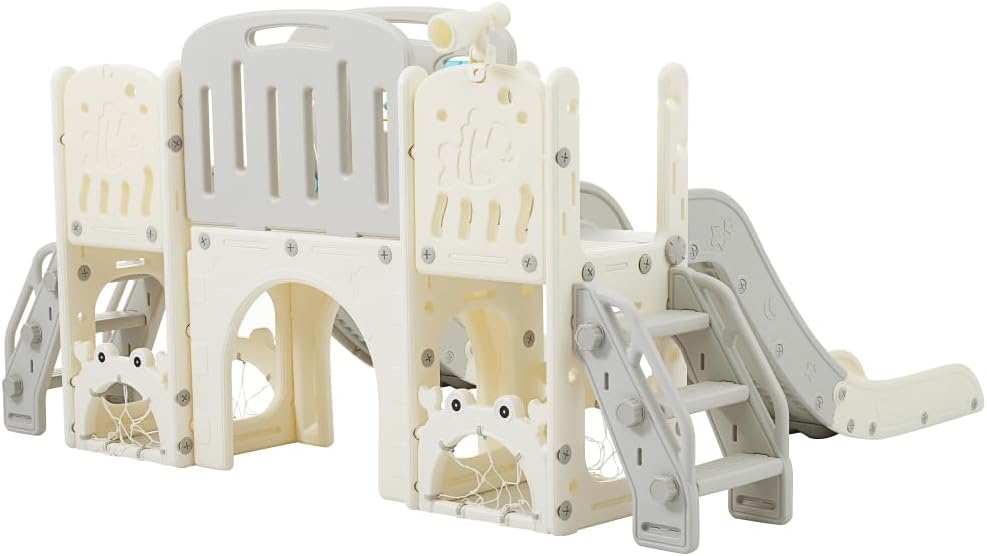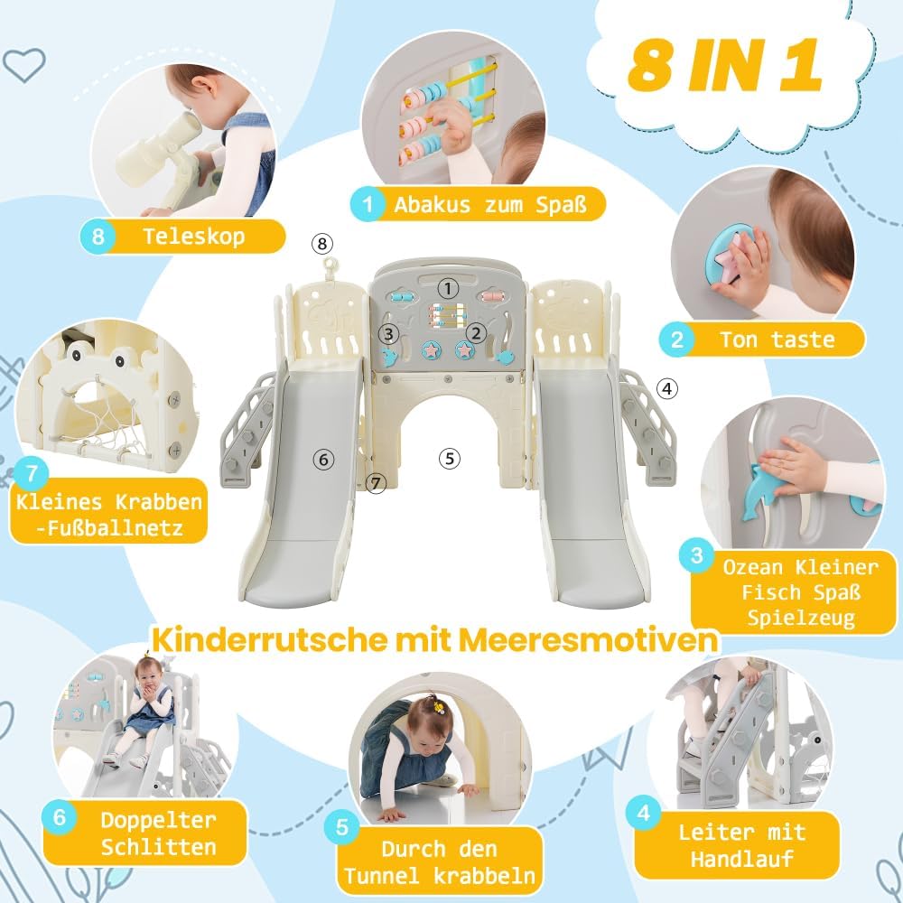 【Materiale HDPE certificato】 Il nostro materiale è realizzato in HDPE certificato. È completamente atossico e non ha alcun effetto sulla salute del bambino. I genitori possono acquistare questo kit in tutta tranquillità per la casa e costruire un parco giochi da sogno per i loro figli preferiti. 【Protezione di sicurezza premurosa】La struttura stabile e sicura è progettata con cura. I motivi degli elementi da arrampicarsi non solo attirano l'attenzione dei bambini, ma impediscono anche efficacemente loro di scivolare. La superficie scorrevole liscia consente ai bambini di giocare liberamente e gioiosamente. Per la protezione dei bambini, lo scivolo migliorato è anche progettato in modo da evitare che i bambini scivolino accidentalmente. 【Area giochi per bambini 8 in 1】 Design rinfrescante! Un set di scivoli autoportanti delicato e carino per i bambini piccoli con 8 elementi funzionali: 2 scivoli, 1 cestino da basket, 1 tunnel di passaggio, 1 corridoio sicuro, 1 telescopio, 2 scomparti per giocattoli e 1 elemento da arrampicare. Questo set permette ai bambini di esprimere appieno la loro natura giocatrice e possono giocare per ore con i loro amici! 【Stimolare l'immaginazione e liberare la vitalità】 Sullo scivolo animale marino, i bambini possono non solo sperimentare sensazioni di scivolo, ma anche stimolare la loro immaginazione senza limiti. Forse sono coraggiosi esploratori marini o amici intimi che interagiscono con creature marine. Ogni avventura è un'esperienza unica. 【Il miglior regalo per i bambini】 Questo set di scivoli è facile da installare e pulire ed è senza dubbio il miglior regalo per i bambini. I piccoli possono salire e scendere, giocare a palla e godersi i piaceri dell'infanzia. Tutte queste attività aiutano tuo figlio a sviluppare migliori capacità mentali e fisiche.