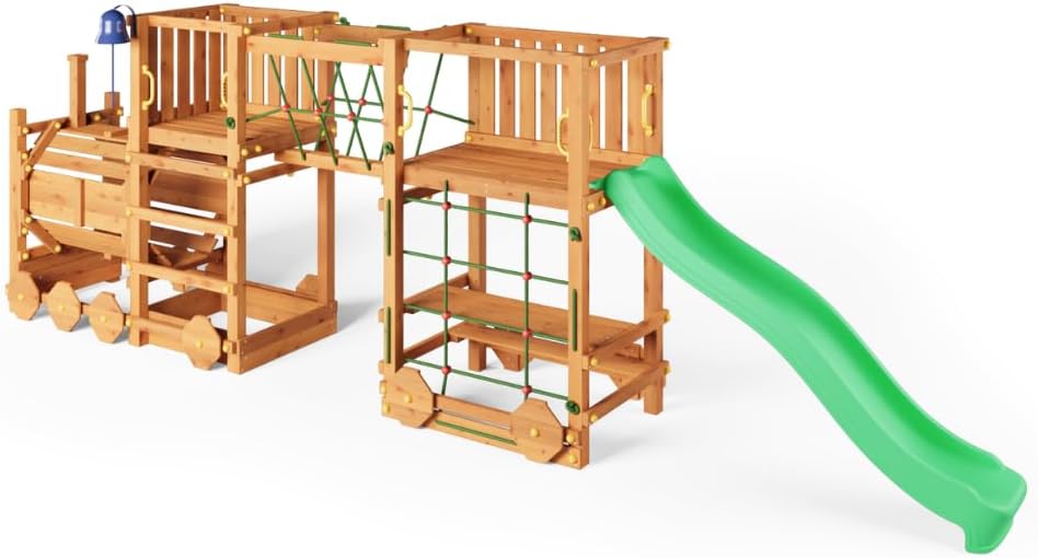 Design unico con tunnel a forma di locomotiva per stimolare il gioco creativo Include scivolo, parete da arrampicata, ponte con rete e tavolo da picnic Struttura in legno massiccio trattato in autoclave, resistente agli agenti atmosferici Ideale per bambini dai 3 ai 10 anni, fino a 10 bambini contemporaneamente Facile da montare, istruzioni passo-passo incluse, ancoraggi al suolo compresi Conforme alla normativa di sicurezza europea UNI EN 71