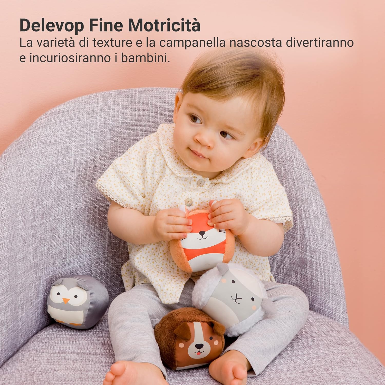 STIMOLAZIONE SENSORIALE: Ogni palla emette un suono unico di sonaglio e presenta texture diverse per sviluppare tatto, udito e curiosità del neonato. FACILI DA AFFERRARE: Le palline sono leggere e morbide, perfette per le piccole mani di neonati dai 3 mesi in su, favorendo la presa e la scoperta. MOTRICITÀ FINE: Stimolano la coordinazione occhio-mano e le prime abilità motorie con forme tattili e superfici piacevoli al tatto. SICURE E MORBIDE: Realizzate in materiale atossico, privo di BPA e ftalati, liscio e vellutato. Ideali per dentizione e gioco in sicurezza. REGALO PERFETTO: Gioco sensoriale educativo e decorativo per la cameretta. Ottima idea regalo per nascita o battesimo, adatta a bimbi e bimbe.