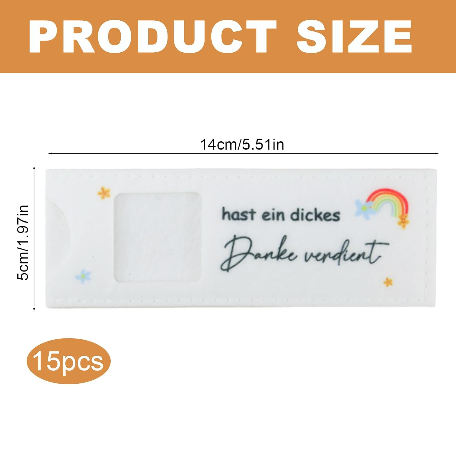 Contenuto della confezione: Riceverai 15 confezioni regalo in feltro bianco (senza cioccolato), la quantità è adatta per regali quotidiani e piccoli eventi, il feltro morbido ha intrinsecamente una consistenza semplice ed elegante; Abbinato al cioccolato lussuosamente confezionato, può sottolineare uno stile elegante e far sembrare il regalo ancora più prezioso. Materiale di alta qualità: l'imballaggio in feltro per il cioccolato è realizzato con cura con feltro di alta qualità, ha una consistenza morbida e delicata sulla pelle, può resistere all'uso ripetuto quotidiano e rimane stabile nel colore, può accompagnarti a lungo per trasmettere sentimenti sinceri. Design sincero: Meriti una profonda gratitudine è stampato su un piccolo regalo per i colleghi, in combinazione con il cioccolato, dona agli snack un calore emotivo, in modo che il destinatario riceva un sentimento di apprezzamento speciale e il cioccolato ordinario diventi portatore di gratitudine Dimensioni pratiche: ogni regalo per gli invitati al matrimonio misura 14 x 5 cm, una volta confezionato può coprire in sicurezza il cioccolato; Durante il trasporto e la consegna aiuta a ridurre al minimo urti e danneggiamenti, protegge l'integrità del cioccolato e allo stesso tempo crea una presentazione moda ed elegante per il regalo grazie alla texture in feltro. Campo di applicazione: La custodia regalo in feltro per cioccolato è adatta per team building a livello aziendale, riconoscimenti dei dipendenti, sia per compleanni di dirigenti, feste di addio al pensionamento, sia per biglietti di ringraziamento agli insegnanti nelle scuole e per la consegna di gratitudine Tra gli studenti, queste borse in feltro stampate con messaggi di ringraziamento possono servire come regali personalizzati