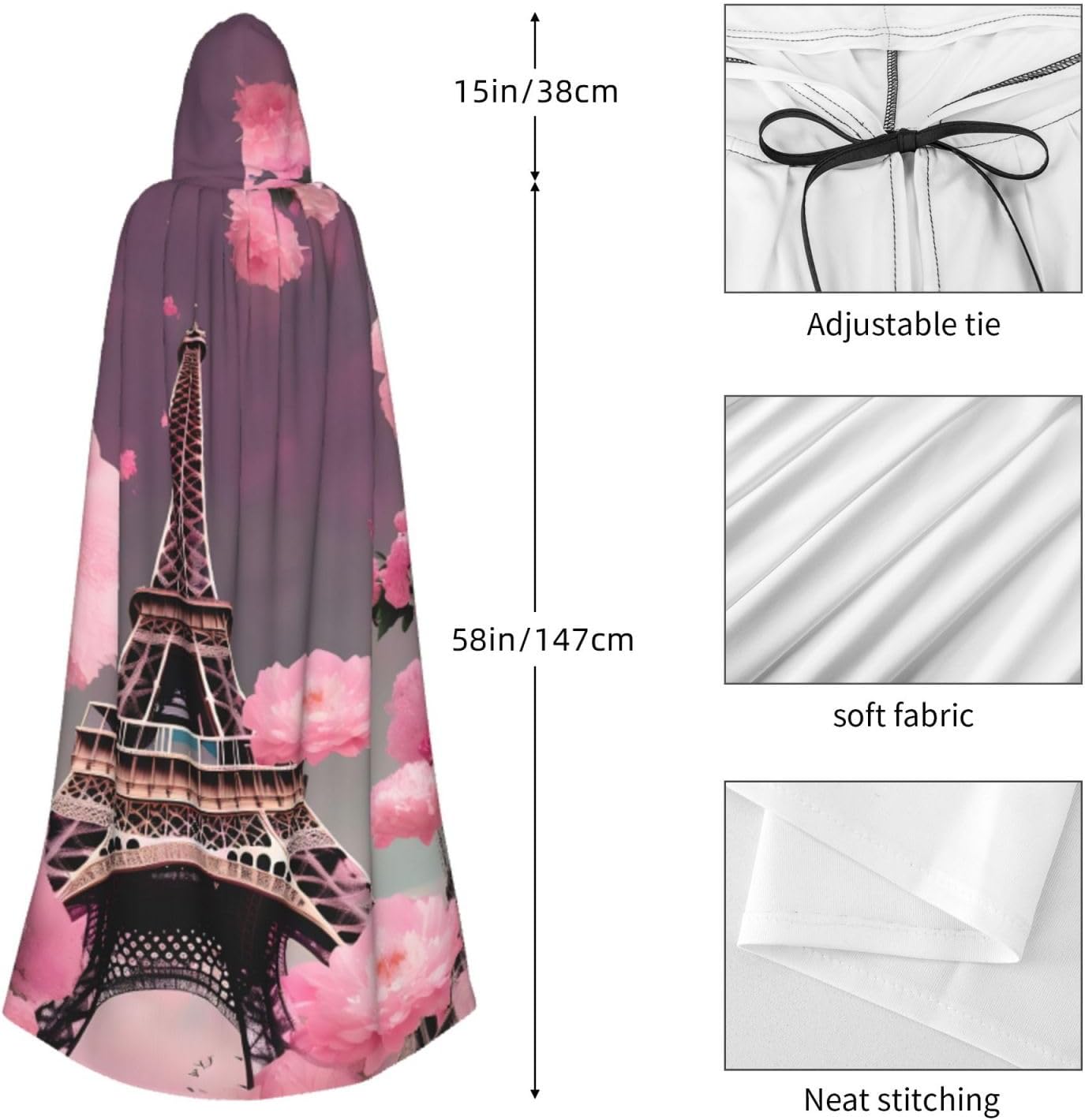 Il mantello con cappuccio per Halloween è realizzato con tessuto in poliestere morbido anche sulla pelle, prevenendo qualsiasi irritazione. Il mantello presenta un ampio cappuccio e uno stile annodato senza cerniere per un design sofisticato ed elegante. Con la sua dimensione universale, offre una copertura completa, adatta a tutti, assicurandoti di distinguerti tra la folla. Questo mantello rosso con stampa floreale della Torre Eiffel di Parigi non è solo per Halloween; è abbastanza versatile per cosplay, spettacoli teatrali, balli in maschera, feste a tema e molto altro ancora.