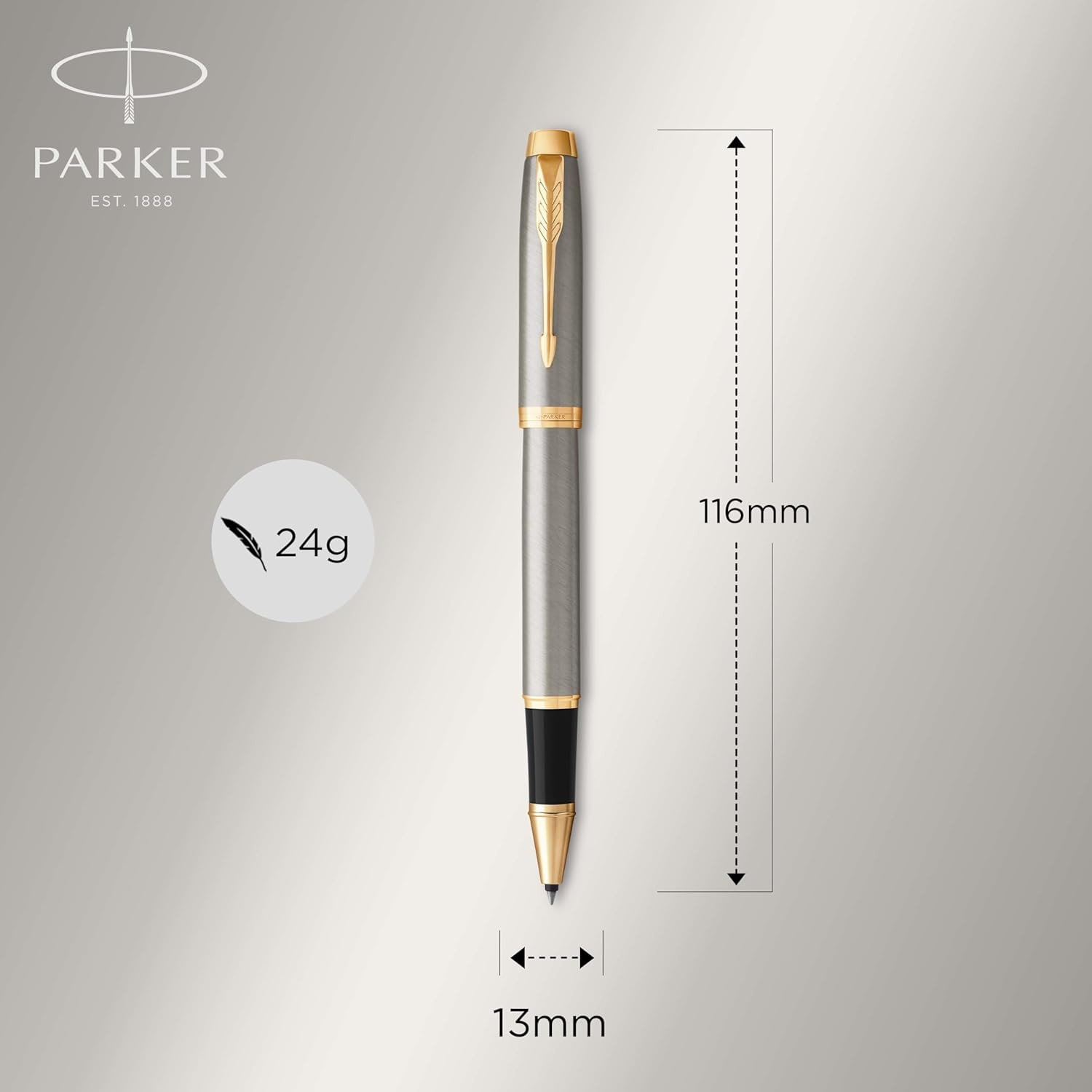 Design affermati, lucidi ed eleganti si fondono alle moderne forme affusolate Metallo spazzolato a grana circolare, arricchito da accattivanti dettagli in oro e dall'iconica clip a freccia di PARKER La punta roller garantisce un flusso di inchiostro sulla carta costante e scorrevole, senza alcuno sforzo Forme ergonomiche e confortevoli si associano all'eccellente qualità artigiana di PARKER per evocare la rinomata tradizione del marchio Include: 1 penna roller, 1 ricarica di inchiostro e informazioni sulla garanzia