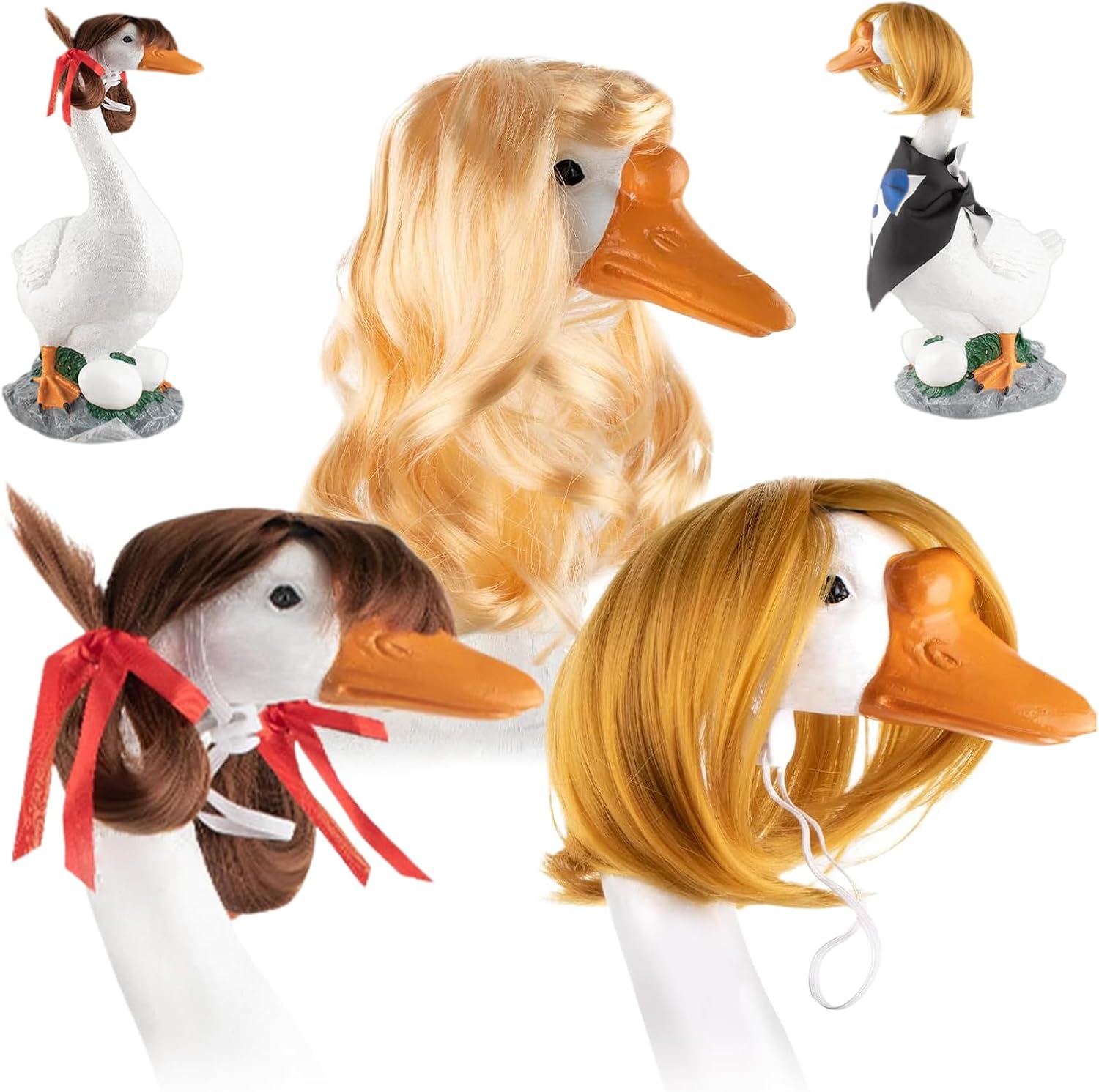 Costruzione Robusta: o decorativo esterno in fibra sintetica resistente e materiali indelebili, assicura che la parrucca impermeabile conservi l'aspetto nonostante prolungata esposizione a sole e agenti atmosferici Set 3 Parrucche: Tre parrucche decorazione stagionale stile bob ondulato, perfette costumi festivi e decorazioni tematiche, offrono molteplici soluzioni per allestimenti festivi originali Tocco creativo con parrucche: Trasforma qualsiasi decorazione da portico in un elemento accattivante con i nostri per oche, arricchiti da fiocchi decorativi per un look unico e pieno di fantasia Occasioni multiple: arricchisci il tuo spazio con stile divertente per esterni e idee per da giardino festivi, perfetti per feste, raduni in piscina e celebrazioni pasquali, regalando fascino a ogni ambiente Cinturini Regolabili: Dotato di cinturini regolabili per fissaggio sicuro alle oche da giardino garantendo design antiscivolo facile installazione e posizionamento stabile con presa rinforzata per effetto visivo duraturo