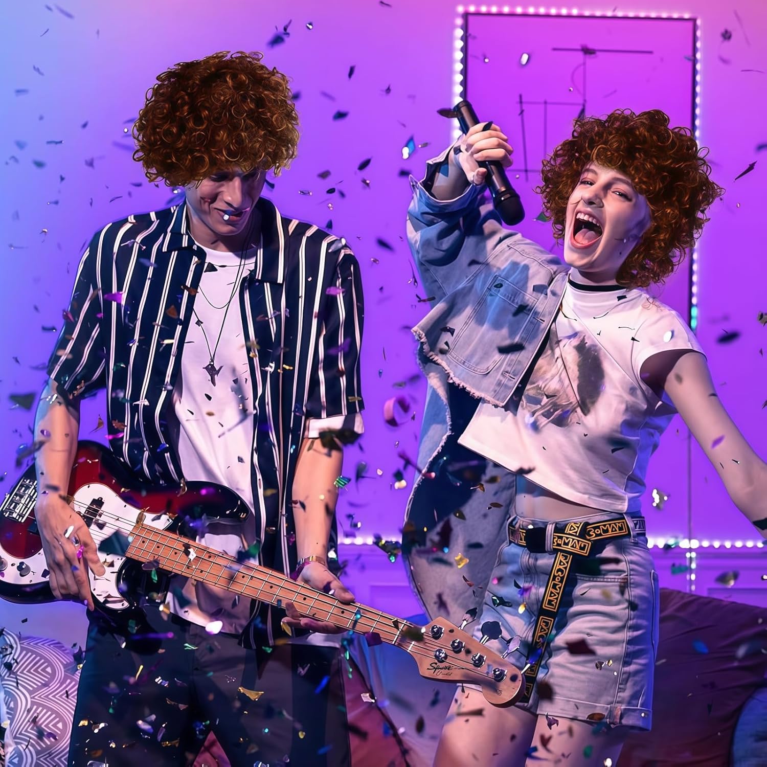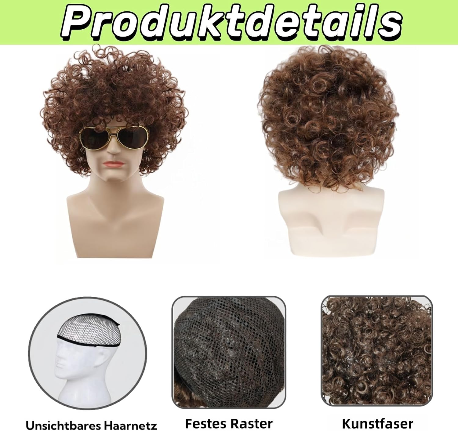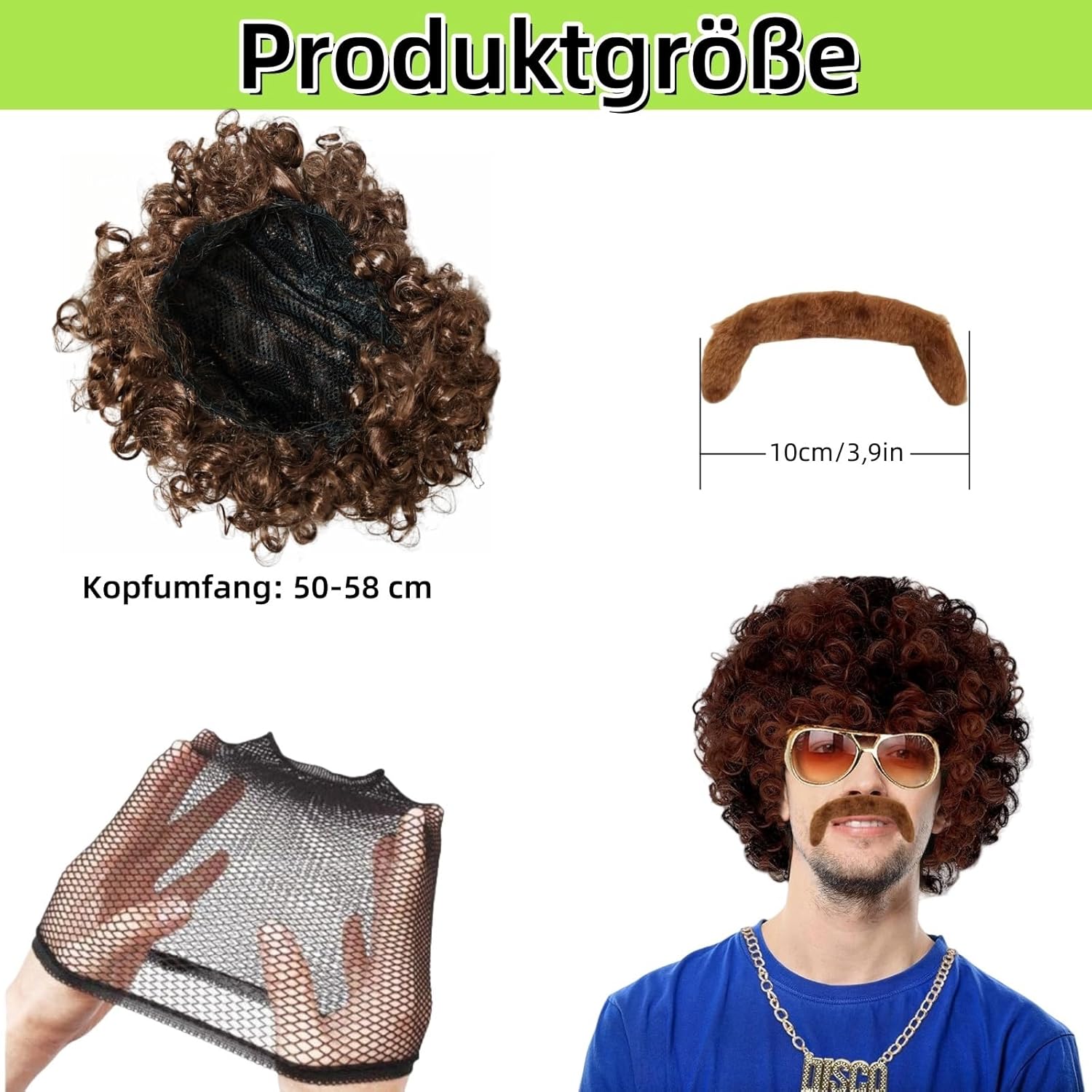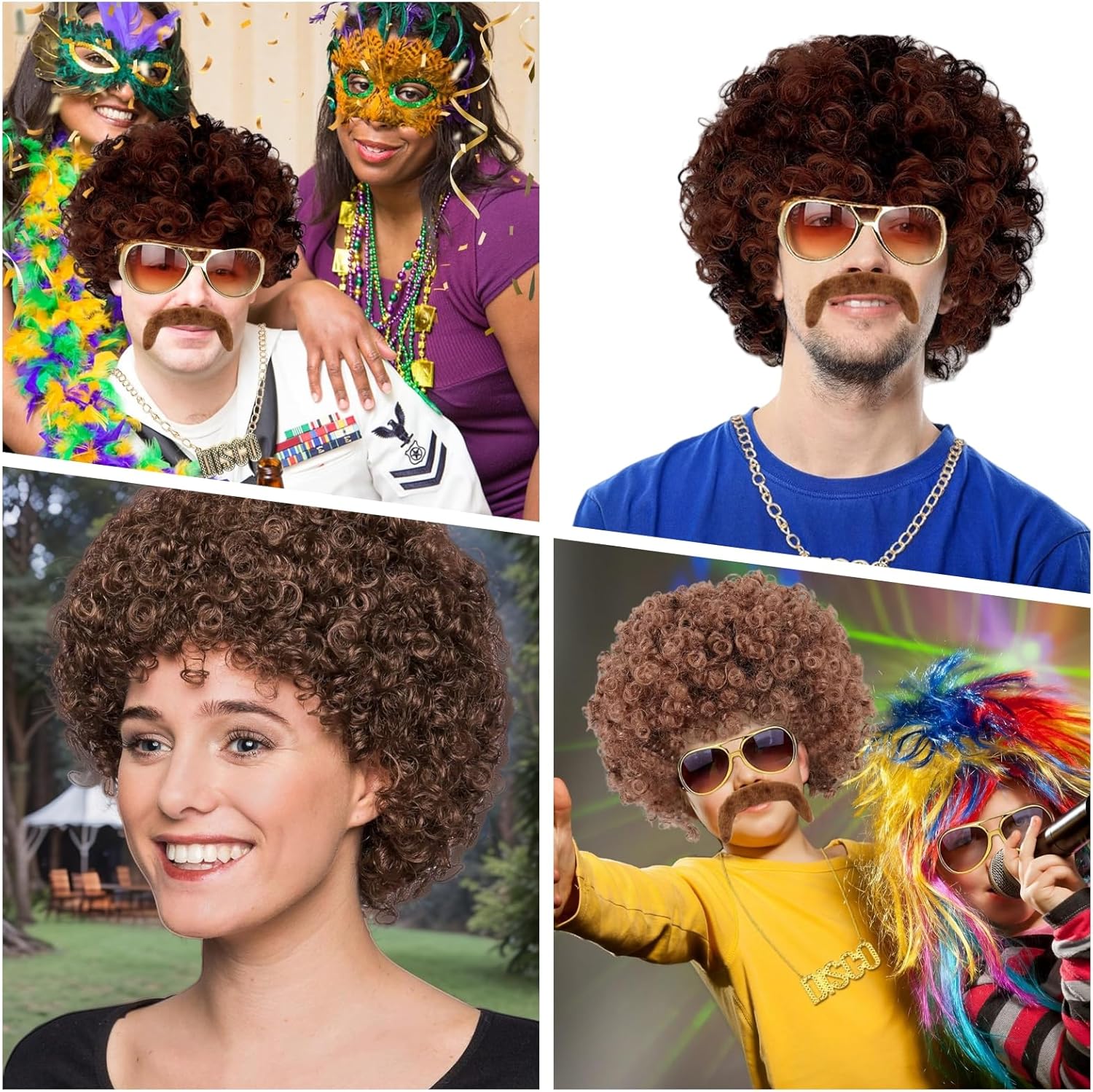 [Parrucca da uomo] Include: 1 parrucca afro anni '70/80, 1 baffi marroni, 1 rete per capelli invisibile. Indossa la nostra parrucca ricci da uomo, fai il rock con la musica e goditi l'atmosfera hippie dallo spirito libero. La nostra parrucca Rasta è adatta per la maggior parte dei rocker classici degli anni '70/80. Materiale di alta qualità: la parrucca da uomo anni '70 è realizzata in fibra sintetica resistente al calore, dall'aspetto naturale e morbido al tatto. Con il suo design accattivante, fresco e divertente, attirerà sicuramente tutti gli sguardi su di sé. [Abbigliamento e accessori da uomo anni '70] I baffi autoadesivi aggiungono un tocco di divertimento e autenticità al tuo outfit. Sono alla moda e ti aiutano a creare il look hippie in un batter d'occhio. Crea momenti indimenticabili e cattura l'essenza della moda degli anni '70 e '80! Taglia regolabile: la nostra parrucca da uomo si adatta a una circonferenza media di 50-58 cm. È dotata di una fascia elastica in rete che si adatta alla dimensione della testa e di una rete invisibile per capelli che lo rende facile da indossare, comodo e naturale. [Gioco di ruolo] La nostra parrucca afro è ideale per feste a tema, costumi di Halloween, feste di Natale, costumi di carnevale, eventi di ruolo, spettacoli teatrali, feste in maschera, accessori per feste, feste in costume anni '70, 80 e '90, discoteche e persino club a tema rock in metallo.