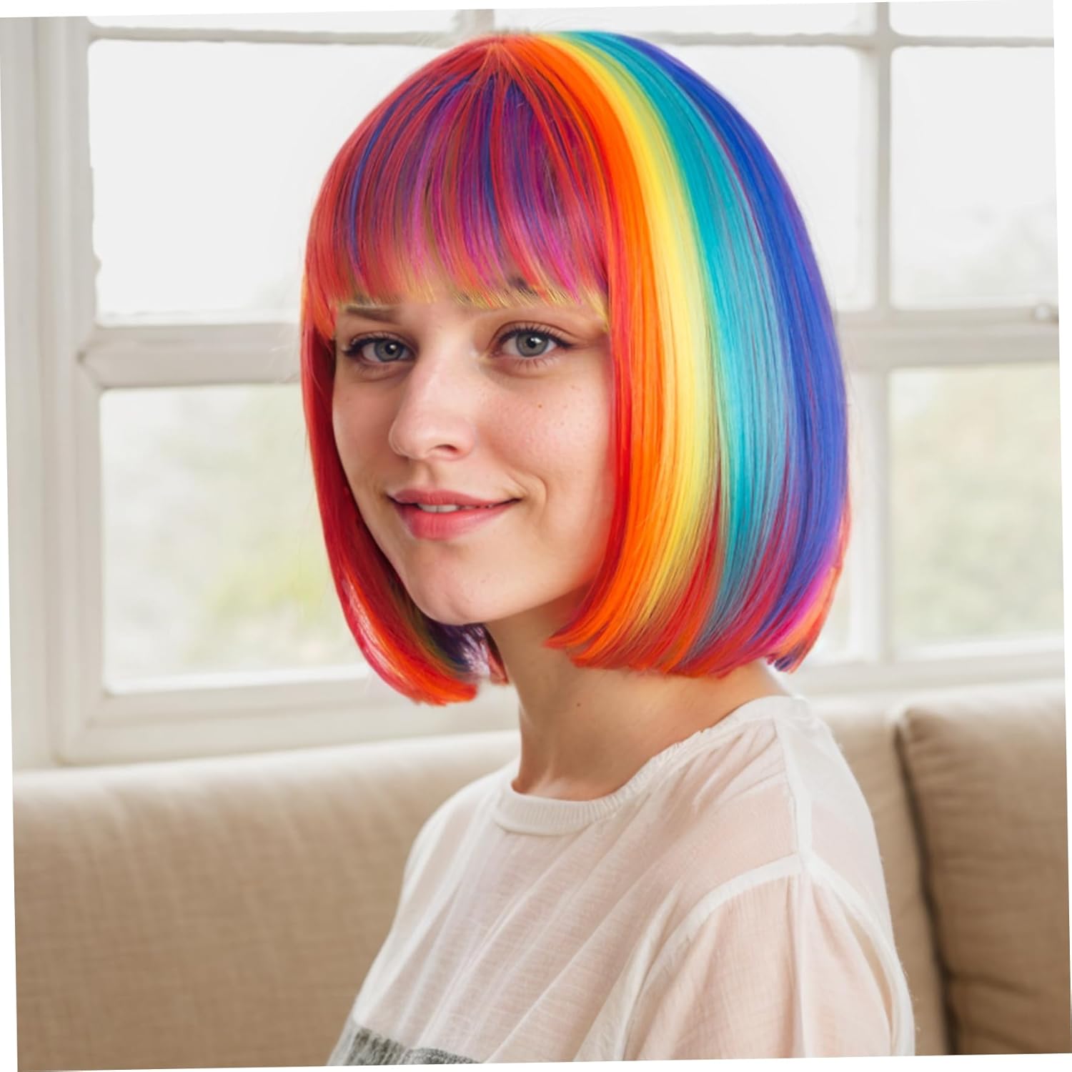 Adattamento regolabile: la parrucca arcobaleno presenta un cappuccio regolabile per garantire un adattamento sicuro e comodo per la maggior parte delle dimensioni della testa, in modo da poterlo indossare facilmente senza preoccuparti di scivolare. Perfetto per ogni occasione: sia che tu stia partecipando a una festa, celebrate un festival o che stai cercando un nuovo aspetto divertente, questa parrucca colorata è l'accessorio ideale per ogni occasione..Parrucche colorate parrucche colorate Short ed elegante con la frangia: la lunghezza di 12 pollici offre un aspetto chic e moderno che è facile da mantenere, mentre i colpi aggiungono un tocco giocoso al tuo stile, perfetto per una dichiarazione di moda audace..Parrucche colorate parrucca colorata Vibranti colori arcobaleno: questa parrucca arcobaleno presenta un sorprendente mix di tonalità arcobaleno, tra cui sfumature di rosso, blu, verde, giallo e viola, per creare un look divertente e accattivante che sicuramente gireranno la testa..Parrucche colorate parrucche divertenti per la festa Conforzo e traspirante: a base di fibre chimiche, questa parrucca colorata è traspirante e leggero, rendendo comodo da indossare per lunghi periodi senza causare disagio o irritazione..Parrucche divertenti per parrucca per feste di festa