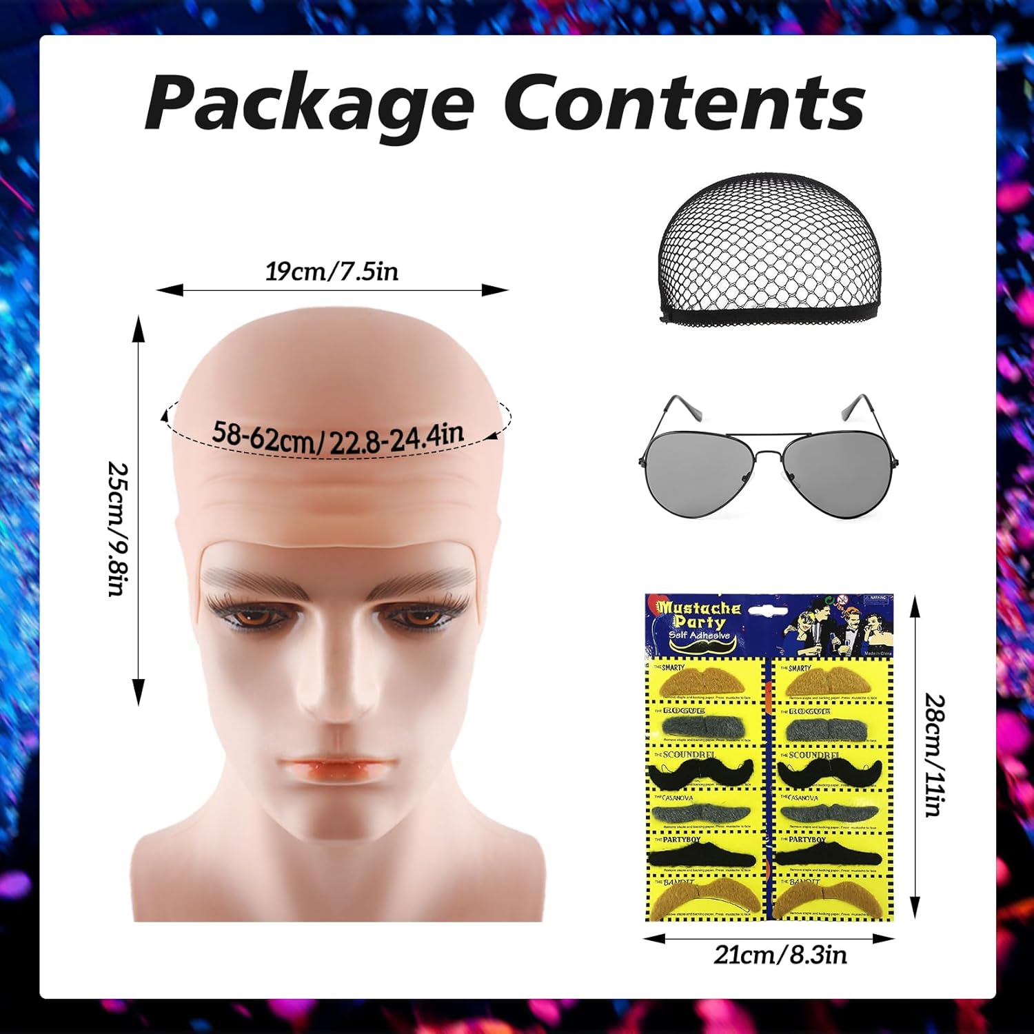 Descrizione prodotto Vesti per festival, feste, spettacoli e molto altro ancora come un calvo realistico con la confezione barba colorata e occhiali da sole per un look impressionante che ti farà risaltare dalla folla! Questo berretto calvo ha un design allungato con una schiena più lunga rispetto ad altri modelli. Questo copre meglio i capelli e crea un look calvo più realistico, perfetto per un look perfetto! Dettagli prodotto: Nome del prodotto: set di calvizie. Materiale della cuffia: lattice. Materiale degli occhiali da sole: lega + plastica. Materiale della barba artificiale: feltro. Materiale della retina: poliestere. Contenuto della 1 berretto per calvizie. 1 retina per capelli nera. 1 paio di occhiali 12 barbe colorate Nota: 1. Si prega di leggere attentamente le informazioni sulle taglie prima di ordinare. 2. A causa della luce e dello schermo differente, il colore dell'articolo potrebbe essere leggermente diverso da quello delle immagini. 3. Si prega di consentire una leggera differenza nelle dimensioni a causa della misurazione manuale. 4. Per qualsiasi domanda sul prodotto, non esitate a contattarci. Wir werden diese innerhalb von 24 Stunden beantworten. Avviso di sicurezza non applicabile