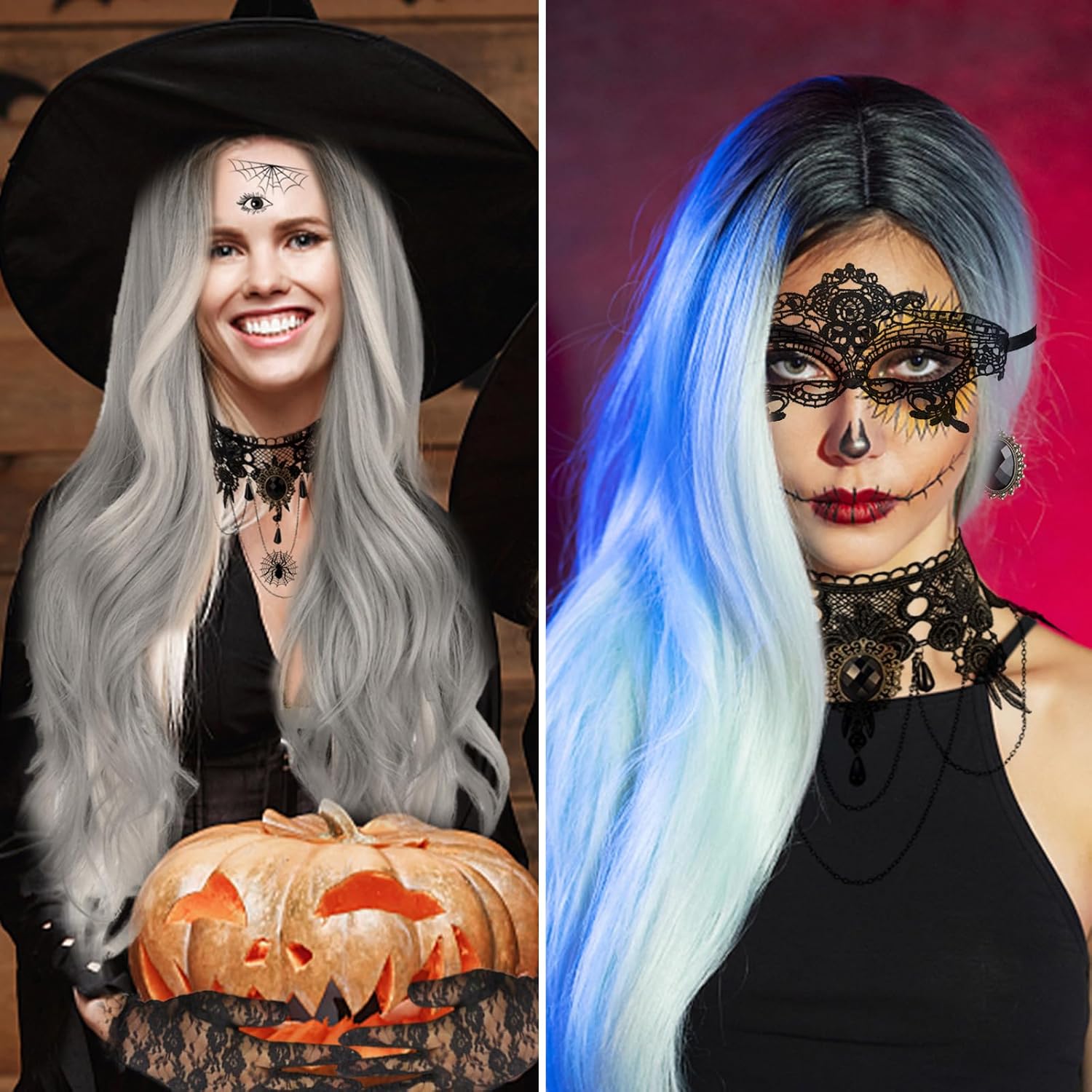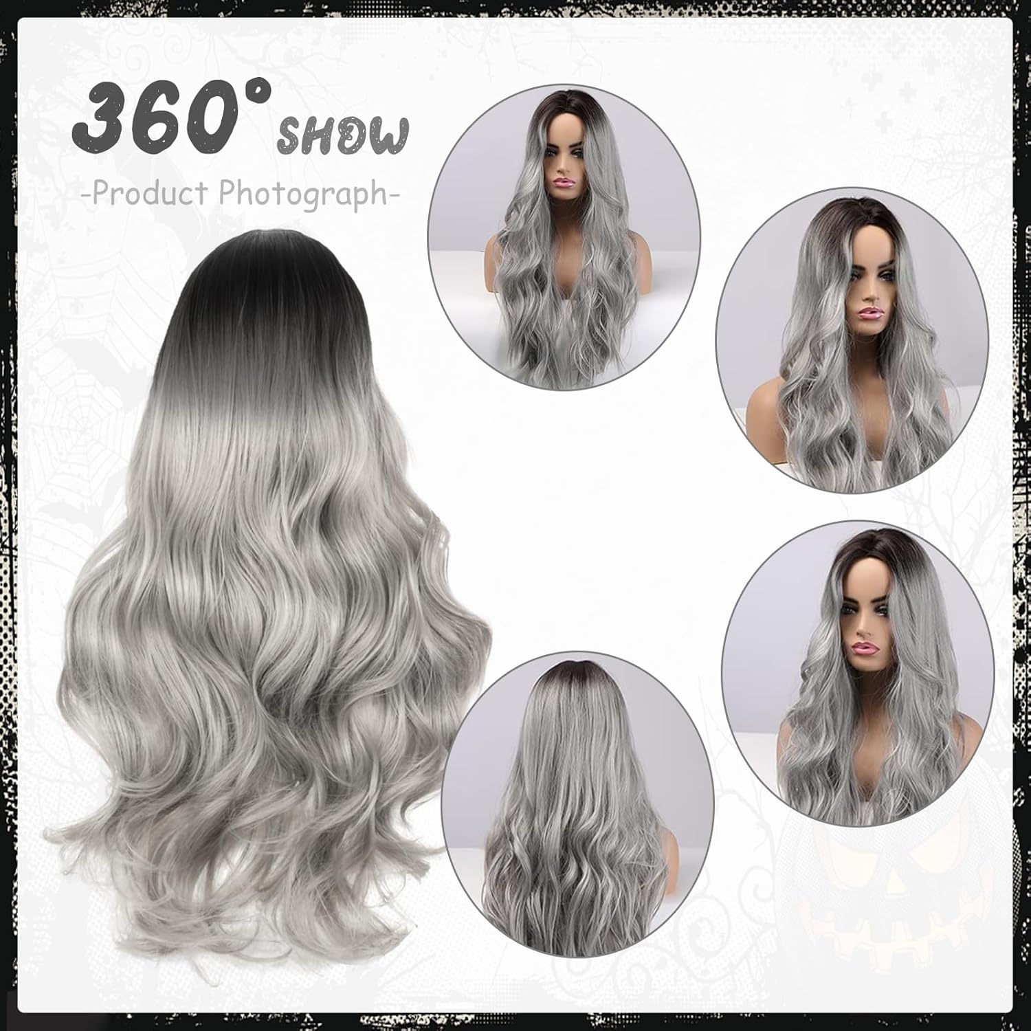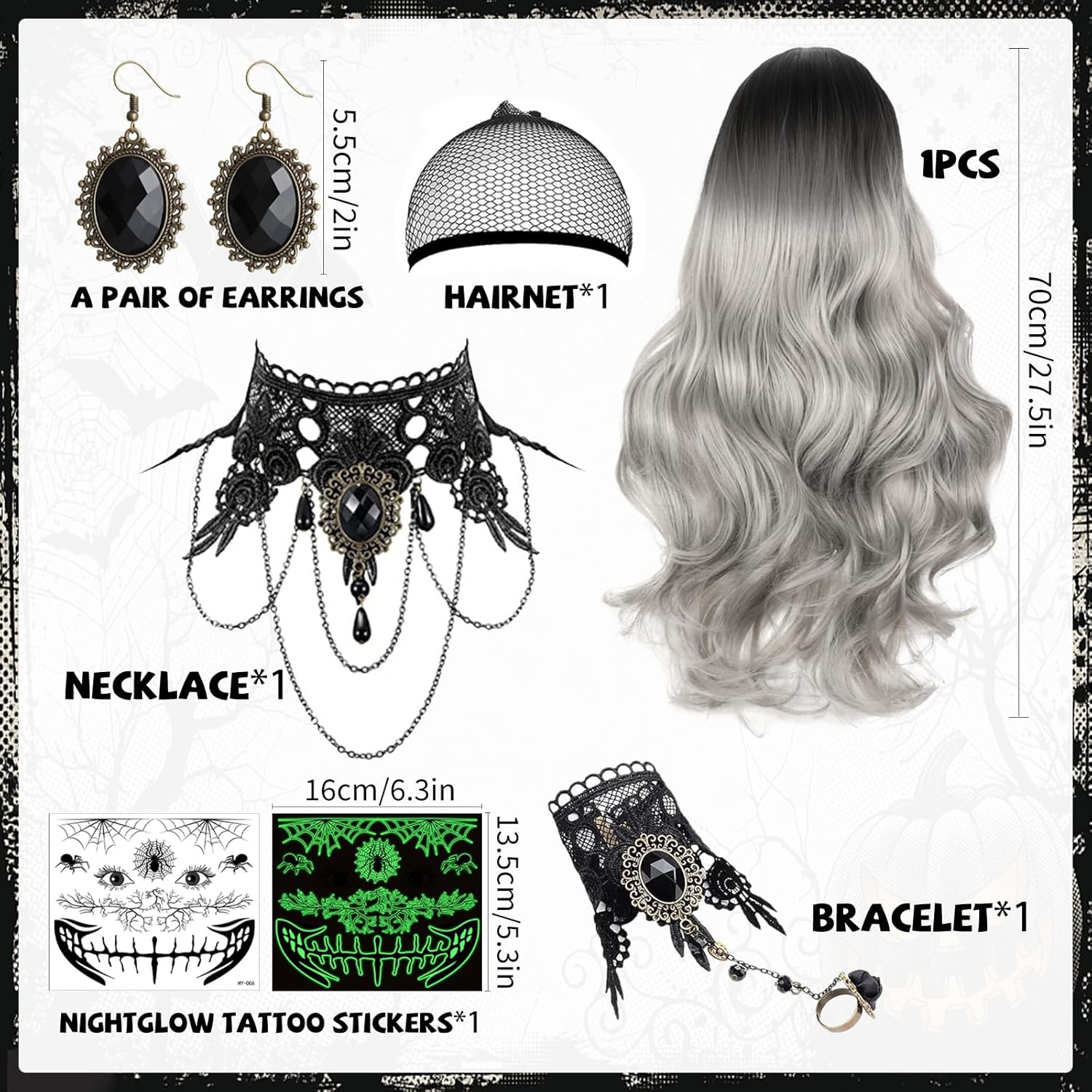 Parrucca da donna: parrucca lunga ondulata nera e grigia per carnevale ha una lunghezza di 70 cm, i capelli si trovano in vita, il set contiene 1 retina per capelli, 1 collana in pizzo, 1 braccialetto in pizzo, 1 adesivo per tatuaggi a ragno, 1 paio di orecchini neri. Materiale di alta qualità: la parrucca grigia da donna è realizzata in seta sintetica ad alta temperatura di alta qualità in fibre chimiche, resistente alle alte temperature di 120-180 gradi, dall'aspetto naturale, morbida al tatto, facile da pettinare e meno soggetta a perdita di capelli e grovigli. Facile manutenzione: ricordarsi di pettinare delicatamente dopo averlo indossato, immergere lo shampoo in acqua tiepida per 10 minuti e poi lavarlo. Stringere delicatamente e lavare con la mano, posizionare verticalmente e asciugare naturalmente in un luogo ventilato. Indossabile in modo realistico e naturale: i capelli grigi lunghi ondulati hanno un look realistico e naturale, sono facili da indossare e da togliere e si adattano perfettamente alla forma della testa. e può essere pettinato normalmente dopo averlo indossato e si adatta perfettamente a diverse tonalità della pelle. Scenari applicabili: la parrucca grigia da donna è molto adatta all'uso quotidiano e accattivante, è perfetta per carnevale, feste a tema, matrimoni, appuntamenti, feste di moda, costumi cosplay e Halloween, feste in maschera, eventi a tema, ecc.