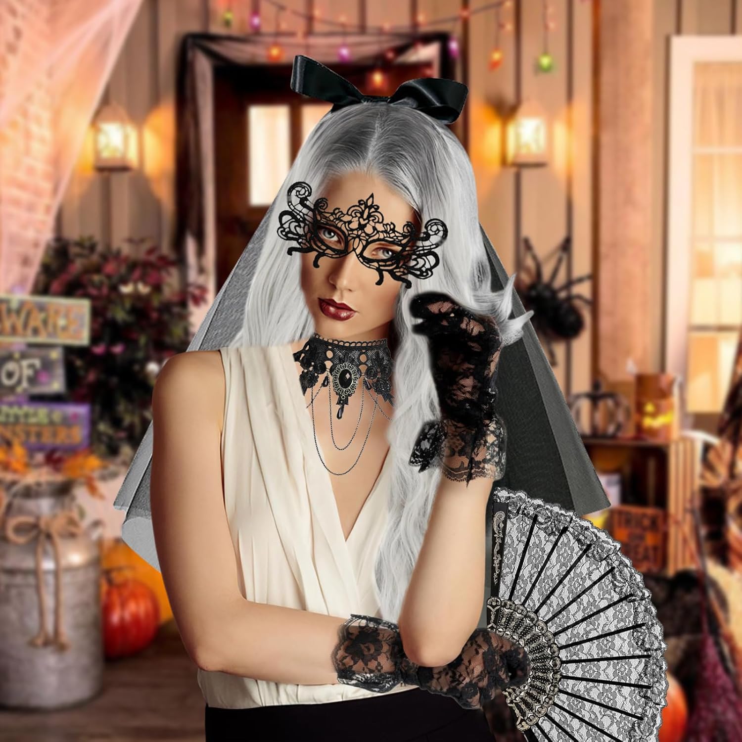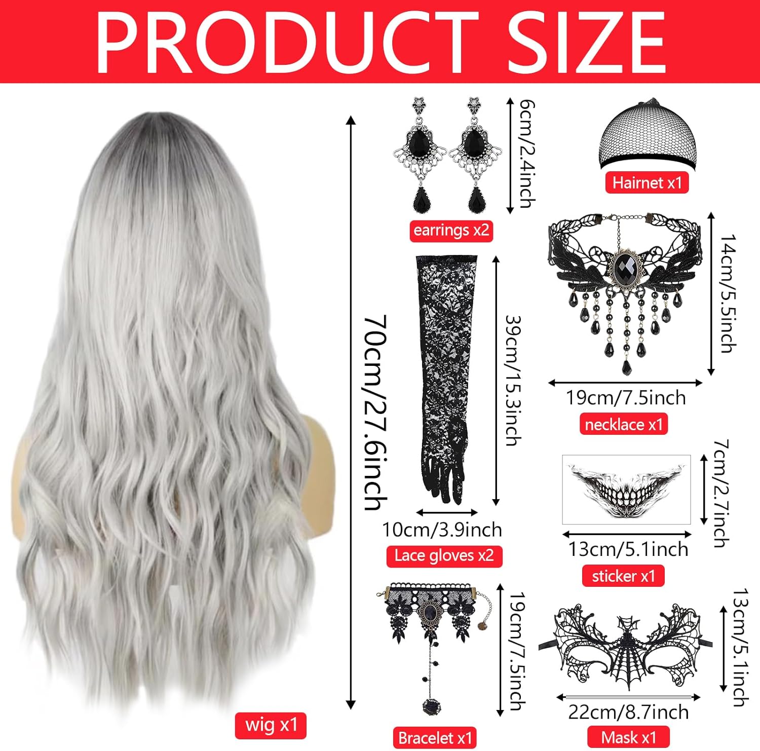 Set di parrucche da donna: il nostro set contiene 1 parrucca grigia argentata + 1 rete per parrucca, 1 collana gotica, 1 braccialetto gotico, 1 adesivo per tatuaggi di Halloween, 1 paio di orecchini gotici, 1 paio di guanti in pizzo, 1 maschera in pizzo da donna. Set completo di parrucche per Halloween. Materiali della parrucca: la parrucca da donna è realizzata in fibre sintetiche di alta qualità, ha un aspetto naturale e una sensazione liscia e morbida. È possibile passare a un nuovo colore di capelli e acconciatura in pochi minuti e sembrare più alla moda ed energico più invitante. 【Facile da trasportare】Il set di parrucche viene fornito con una rete per parrucca, un'elevata elasticità si adatta alla maggior parte delle circonferenze della testa. La parrucca lunga e riccia ha una fascia elastica interna per una circonferenza della testa regolabile, adatta per la maggior parte delle persone. Set di gioielli: set di parrucche da donna per Halloween, con pizzo nero e gioielli gotici, perfetti per Halloween, erba mardi, mascherata e molto altro ancora. Porta più segreto alla tua festa. Occasioni applicabili: la nostra parrucca per Halloween può essere indossata in ogni occasione, come feste di Halloween, eventi di carnevale, feste in costume, cosplay, eventi scolastici o altri eventi. Con questa parrucca sarete accattivanti.