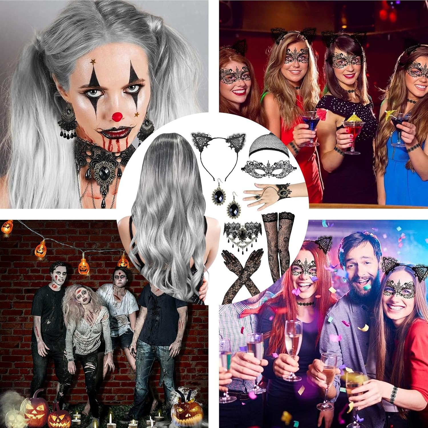 【Il set di parrucche di Halloween contiene contenuto】: riceverai 1 parrucca di capelli lunghi ricci (70 cm); 1 x rete per parrucca (indossa comodamente la parrucca); 1 orecchino; 1 braccialetto; 1 maschera per gli occhi; 1 collana; 1 guanto in pizzo nero; 1 fascia per capelli; 1 calza È un ottimo accessorio per l'uso quotidiano e la festa di cosplay. 【Parrucche per capelli lunghi e ricci da donna】: grigi lunghi ricci naturali con rete traspirante al 100%, la cuffia della parrucca è altamente elastica e ben ventilata. La lunga parrucca riccia è realizzata con fibre sintetiche di alta qualità, naturali, lisce e morbide. Non incline ai grovigli. Il cappuccio in rete elastica regolabile integrato consente alla parrucca di adattarsi alla maggior parte delle dimensioni della testa. 【Ombre Silver Grey Long Curly】:La parrucca da donna grigia è realizzata in seta ad alta temperatura, fibre sintetiche di alta qualità in stile onda sciolta, resistente al calore, sterilizzata ad alte temperature, sana, non danneggia il cuoio capelluto. È molto facile da trasportare e non si stanca nel tempo. 【Parrucca di Halloween da donna】: Questa parrucca grigia è un'acconciatura elegante con un'attaccatura simile a un pizzo che ti dà più fiducia in te stesso. La parrucca con capelli lunghi ricci ha un aspetto naturale e una personalità elegante. Parrucca grigia, vera, molto bella e femminile , morbido al tatto. 【Occasioni applicabili alla parrucca da donna】 : Il costume di Halloween è resistente e adatto per un uso a lungo termine. Parrucche lunghe di Halloween e set di gioielli gotici perfetti per Halloween, carnevale, cosplay, feste in costume, concerti e molto altro. Porta più personalità e divertimento alla tua festa.