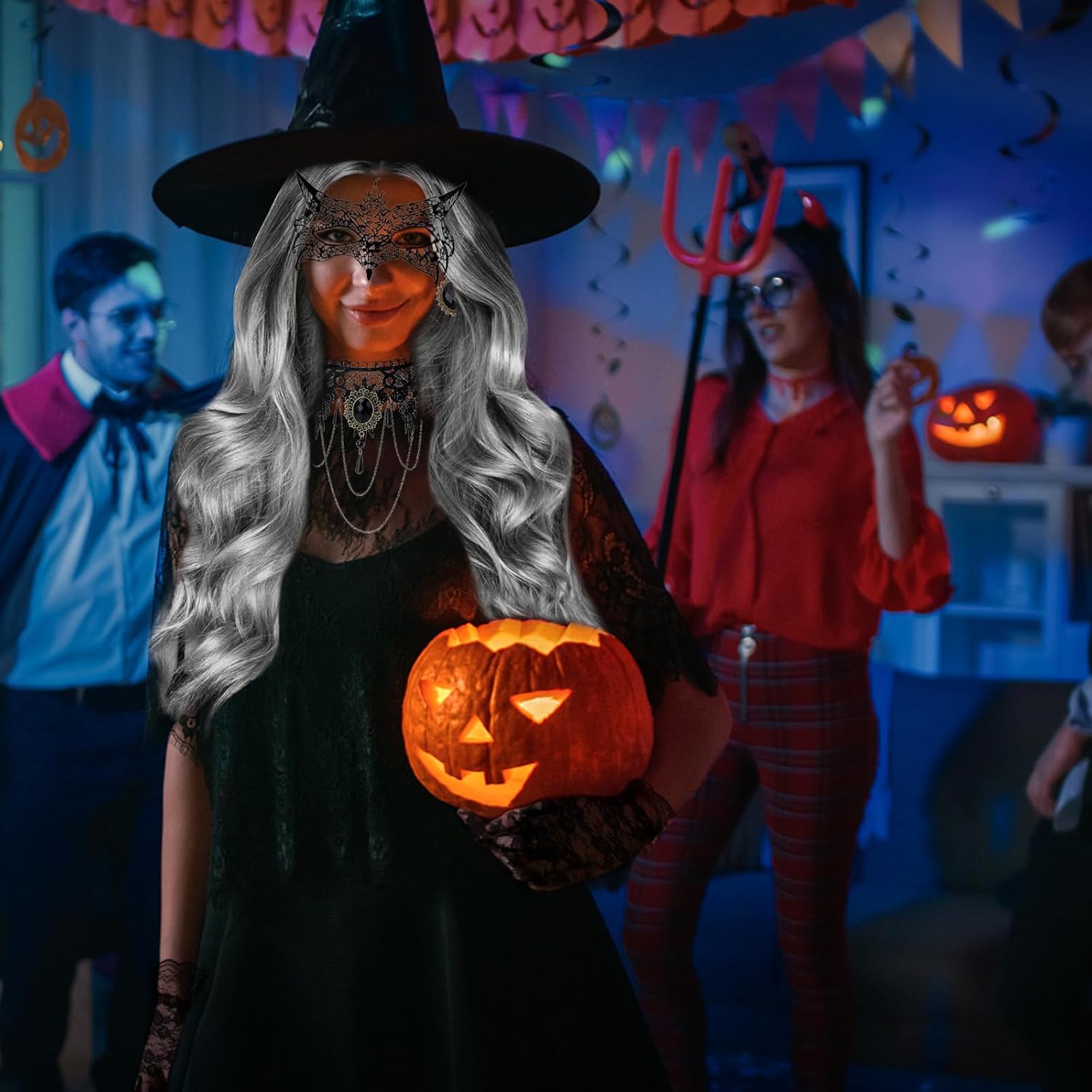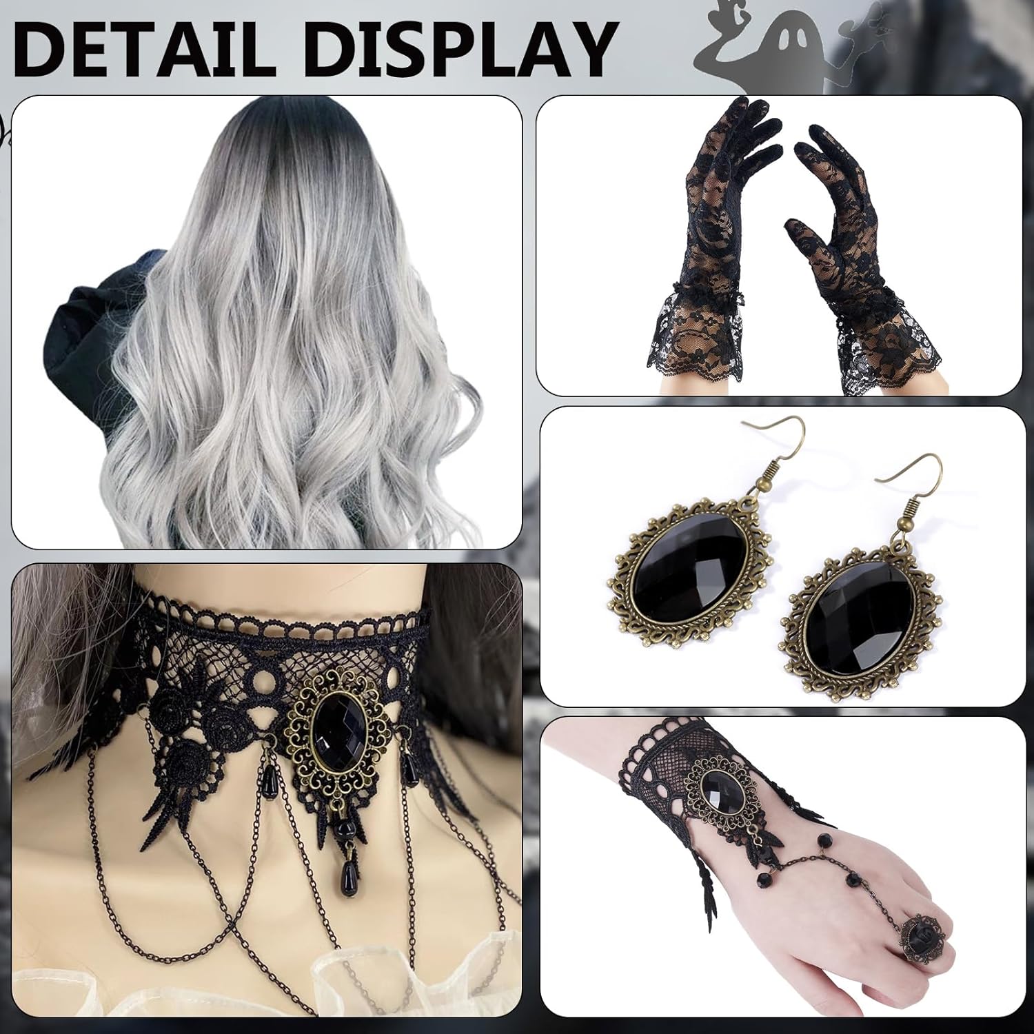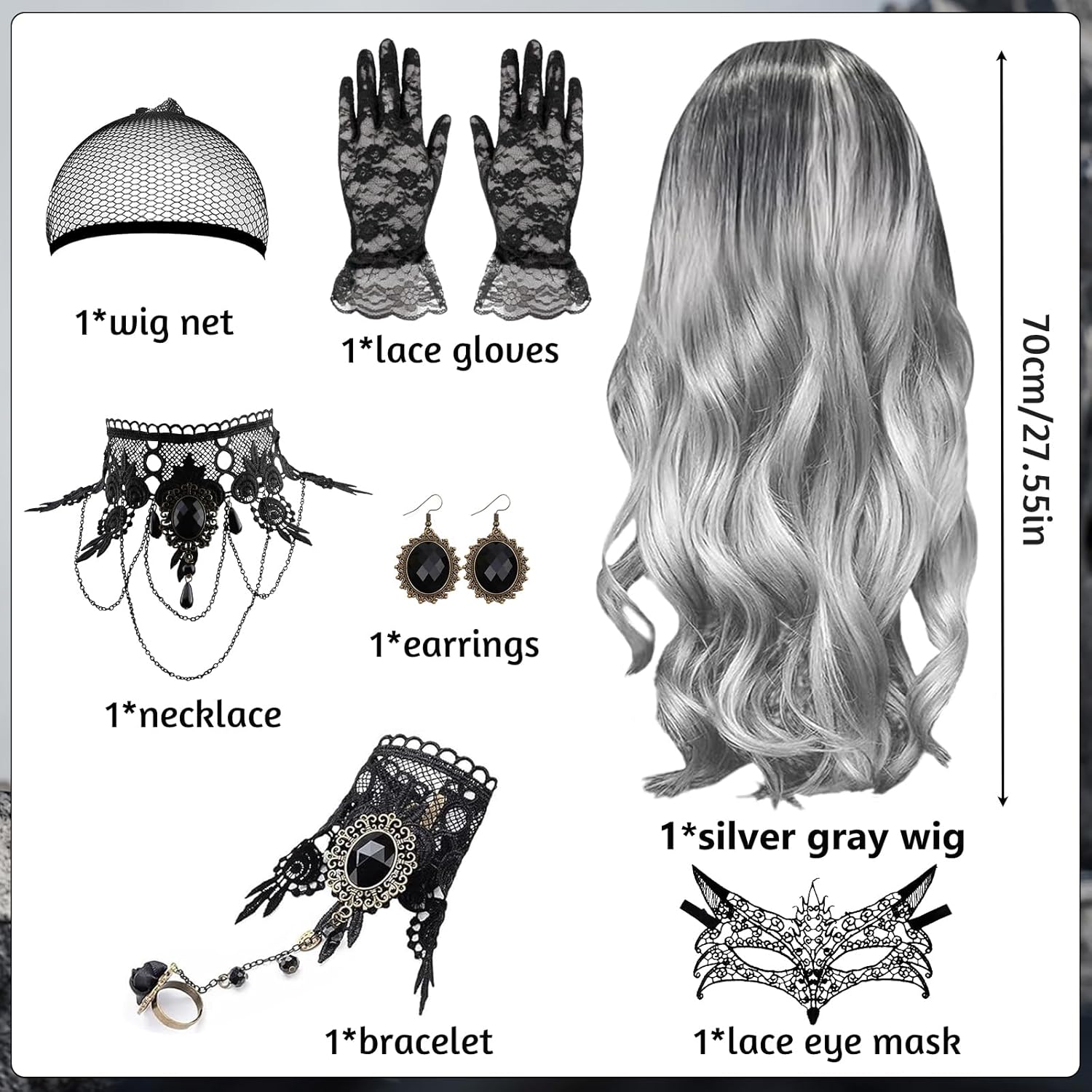 【Parrucca da Donna Set】Questo set di parrucca da donna per halloween include 1 parrucca lunga grigio argento, 1 retina per parrucca, 1 paio di guanti in pizzo, 1 maschera per gli occhi in pizzo, 1 choker gotico, 1 braccialetto e 1 paio di orecchini. 【Materiale sicuro】i guanti e la benda sull'occhio sono realizzati principalmente in pizzo, il che li rende resistenti e comodi da indossare. La parrucca grigia è realizzata in fibre sintetiche importate di alta qualità (senza sostanze chimiche o odori strani), setosa e morbida, senza grovigli e senza perdita di capelli. Questa parrucca da donna set ha un design molto elegante con un aspetto bellissimo e naturale e una sensazione di morbidezza. 【Facile da indossare】questo set di parrucca da donna per halloween è dotato di una retina per parrucca, altamente elastica e adatta alla maggior parte delle dimensioni della testa. La parrucca lunga e riccia ha un elastico interno per regolare le dimensioni della testa per adattarsi alla maggior parte delle persone. È molto facile da indossare e non si stanca nel tempo. 【Design alla moda】Questa parrucca da donna set di Halloween da donna presenta un colore grigio molto popolare e uno stile di parrucca che si adatta a tutti i tipi di pelle e look. Prova una nuova acconciatura colorata in pochi secondi senza danneggiare i tuoi capelli. Questa splendida parrucca da donna è dotata di una retina molto traspirante. Regola i ganci della calotta alla misura corretta per adattarla alla tua testa, rendendola facile da indossare. 【Molteplici occasioni】Questa resistente parrucca da donna per Halloween è ideale per Halloween, carnevali, cosplay, feste in maschera, feste a tema, concerti e molti altri eventi. Aggiunge personalità e divertimento alla tua festa ed è adatta per un uso prolungato.