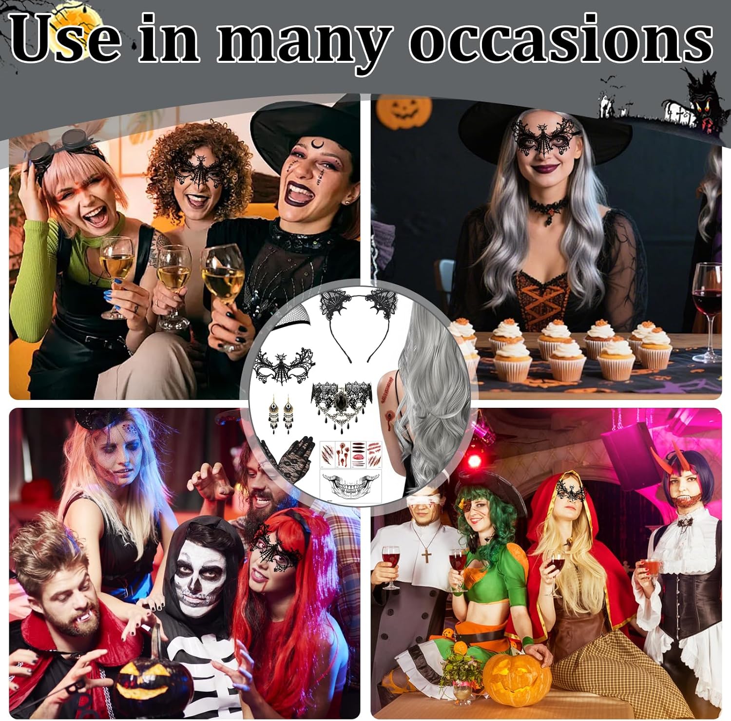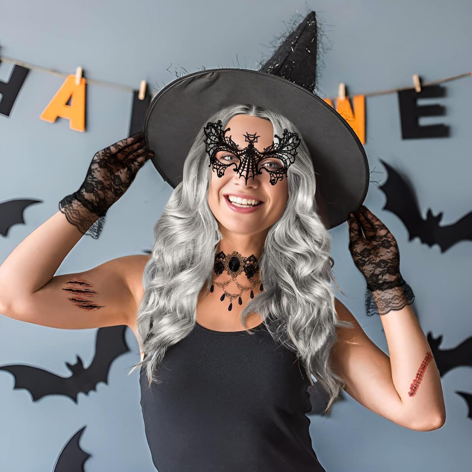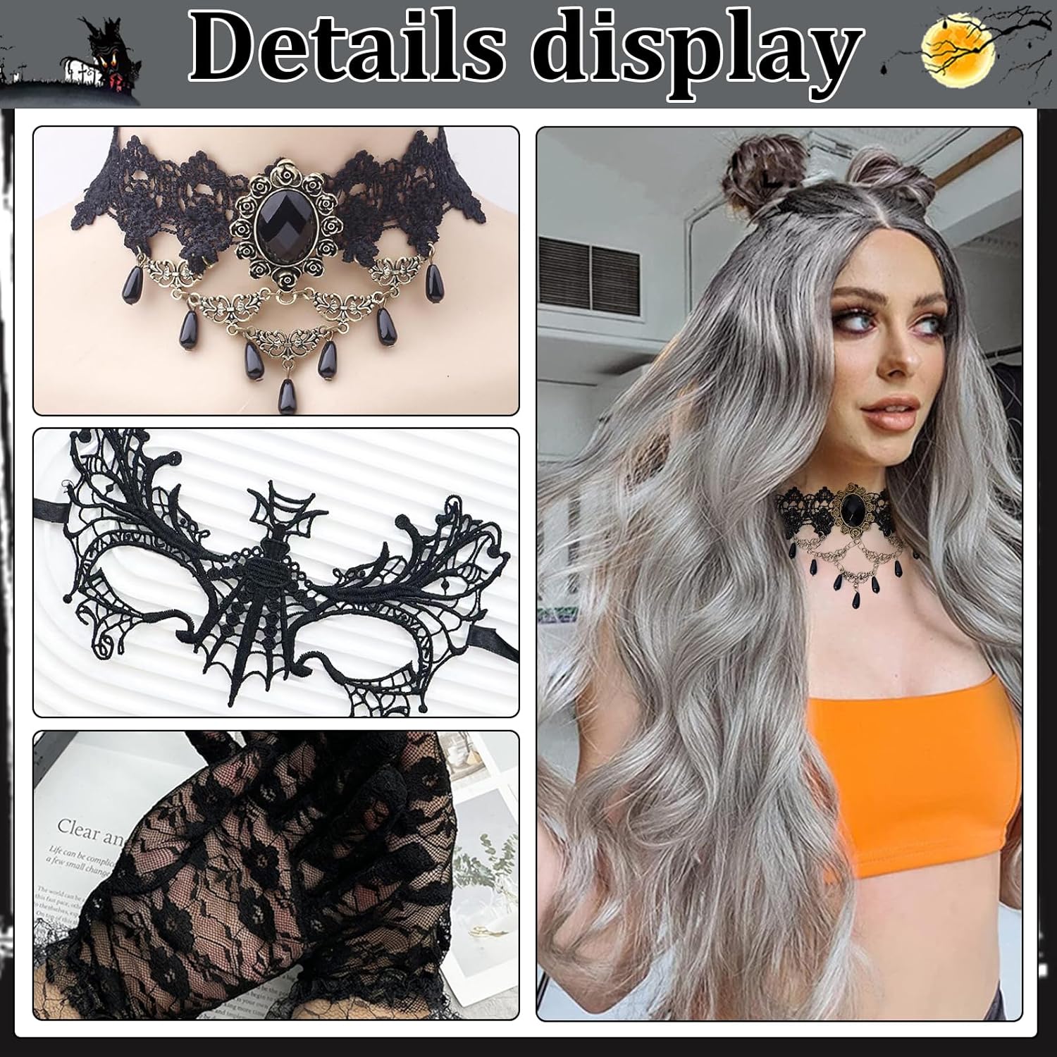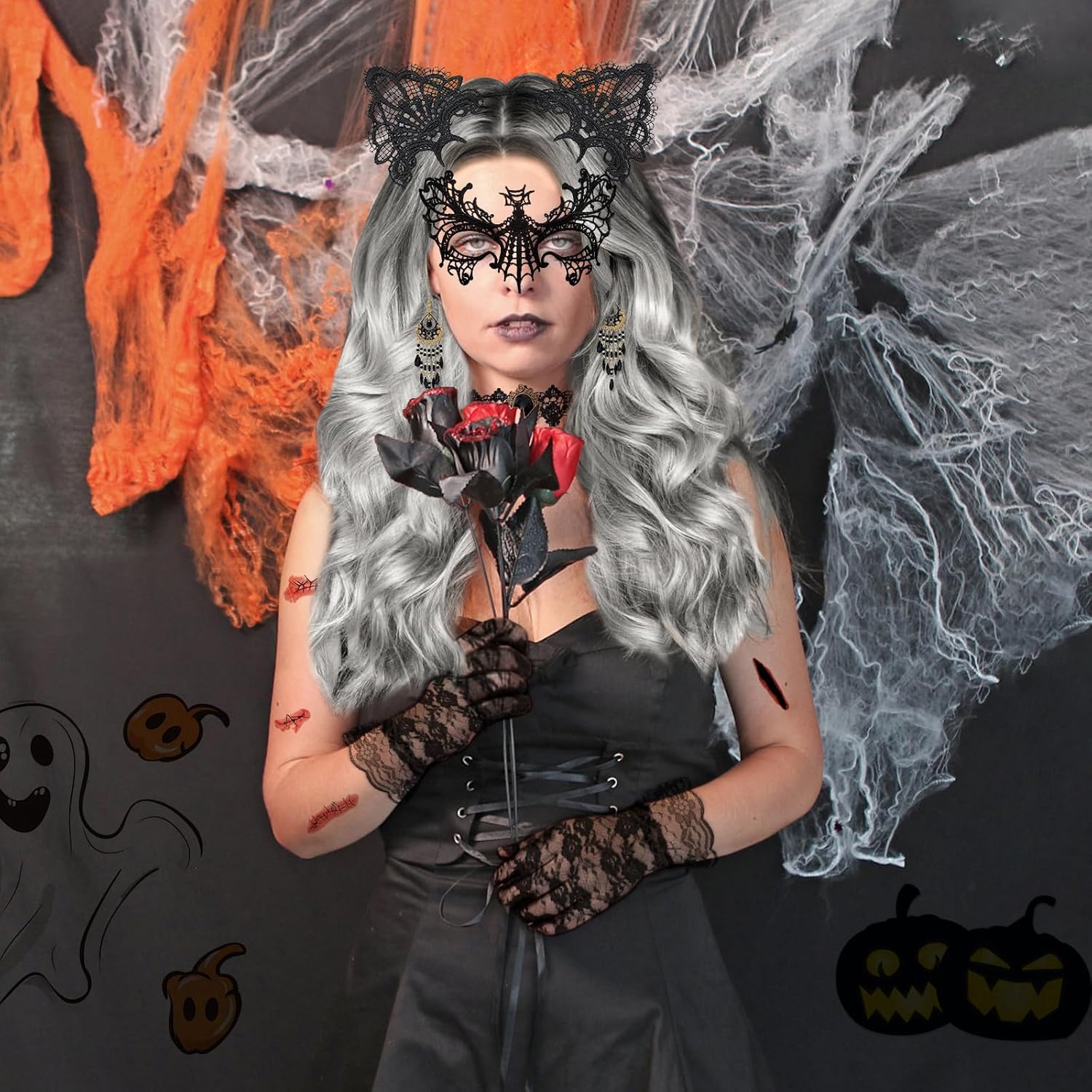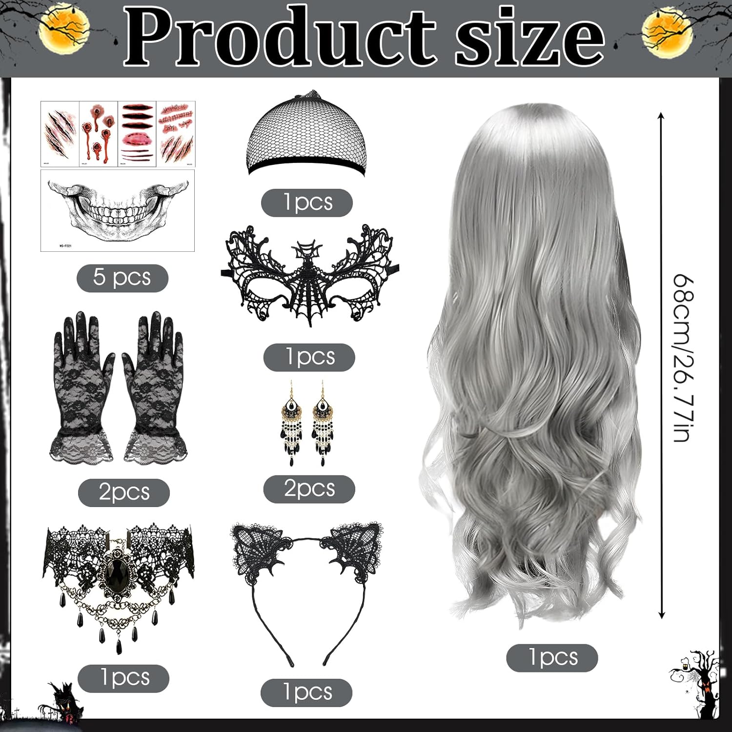 Descrizione prodotto Kefyvbdj Parrucca da Donna per Halloween, Parrucca Ondulata Riccia Parrucca Lunga Grigia 68cm, et con Gioielli Gotici,, Halloween Accessori per Parrucche, per Halloween, Carnevale, Cosplay, Feste. Caratteristiche: - Sfumatura argento naturale, La nostra parrucca di Parrucca da Donna per Halloween per il suo stile innovativo e unico, che le conferisce una palette di colori vibranti. - Gioielli gotici, un set di gioielli gotici per donne e ragazze, che include una sexy maschera da ballo in pizzo nero e collane. - Parrucca da Donna per Halloween, un set di parrucche di Halloween per donne con accessori. Il suo design innovativo permette di indossarla senza sforzo. -Facile da indossare, Parrucca da Donna per Halloween è dotato di una retina altamente elastica, adatta alla maggior parte delle dimensioni della testa. La parrucca lunga e riccia ha un elastico interno. Specifiche: Materiale: Fibra Colore: Come mostra l'immagine Dimensioni: Come mostra l'immagine Lista di imballaggio: 1 * Parrucca di Halloween da donna 1 * Retina per parrucca 1 * Collana in pizzo gotico 1 * Paio di orecchini gotici 1 * Paio di guanti in pizzo 1 * Maschera gotica 1 * Fascia nera 5 * Adesivi per tatuaggi di Halloween Nota: ➤ Si prega di consentire una leggera differenza di dimensione a causa della diversa misurazione manuale. ➤ A causa della luce e della differenza di impostazione dello schermo, il colore dell'articolo potrebbe essere leggermente diverso dalle immagini. Avviso di sicurezza No