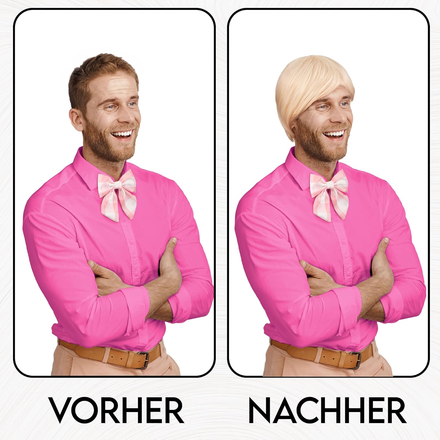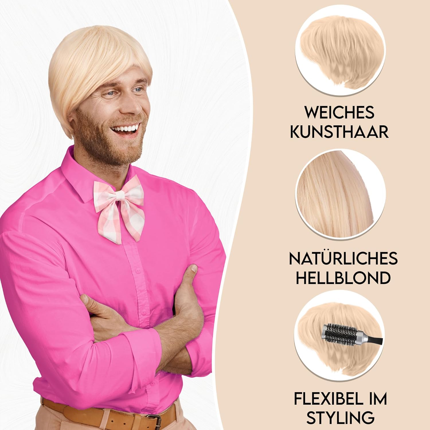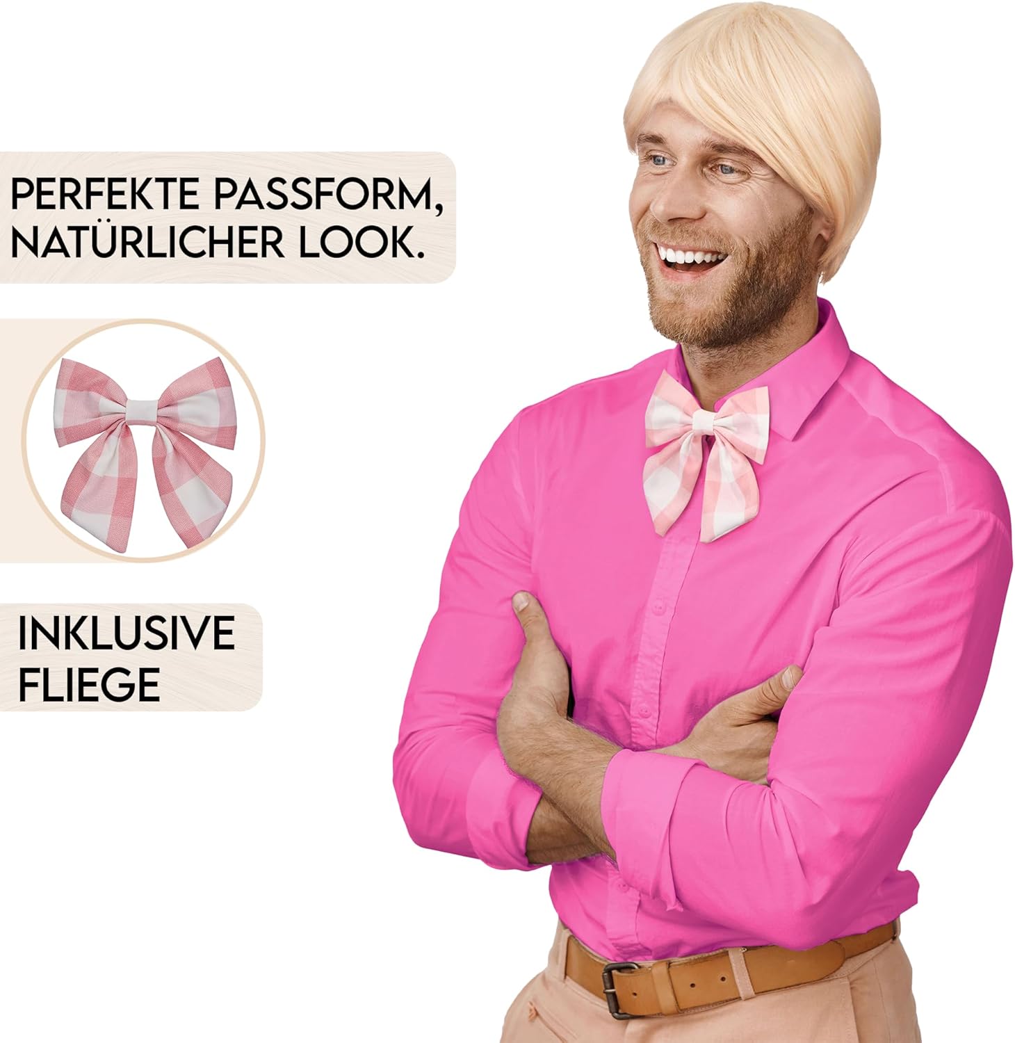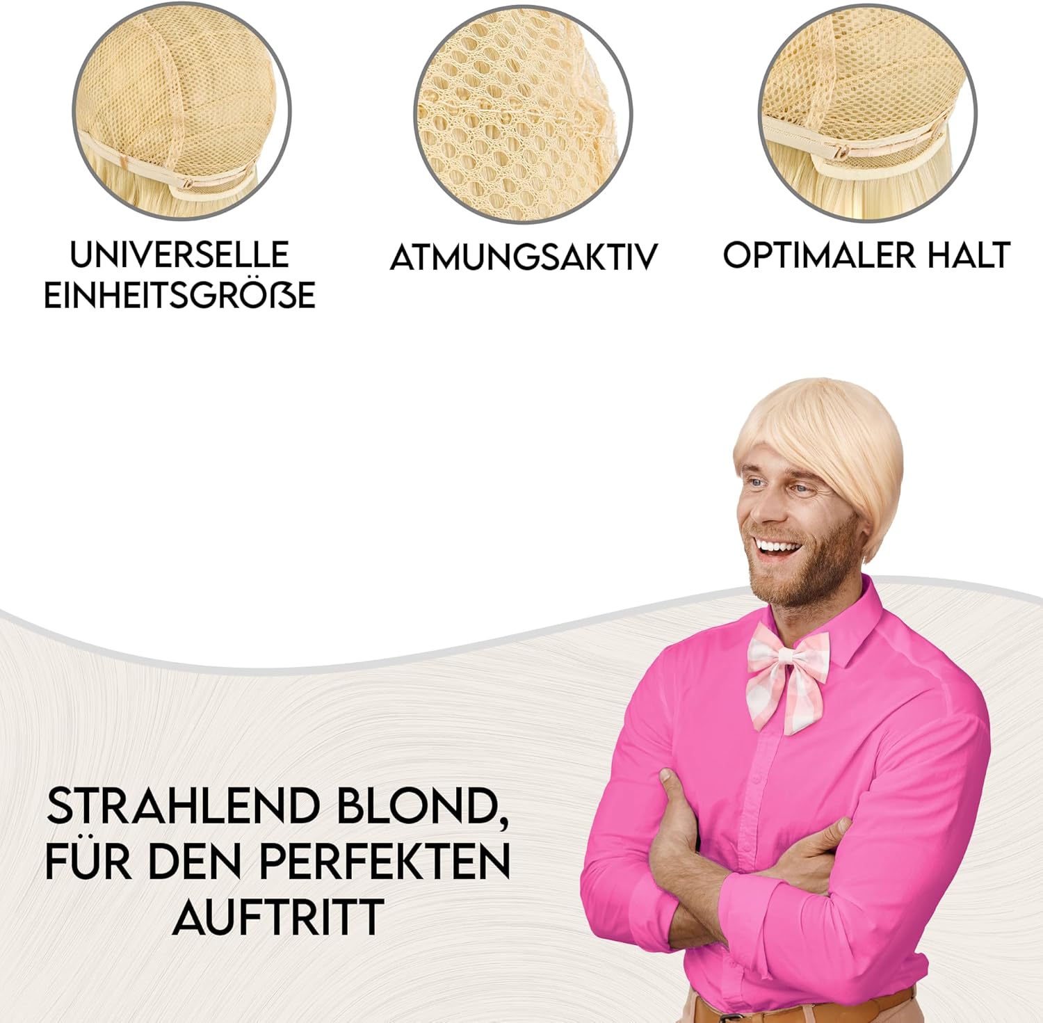 Scopri un look iconico con la parrucca bionda a pelo corto + papillon rosa che non solo attira sguardi ammirati, ma trasforma anche la tua giornata in qualcosa di speciale. Elegante e flessibile: la nostra parrucca biondo chiaro convince non solo per un look attraente, ma si distingue anche per la sua struttura naturale dei capelli, che consente uno styling senza sforzo e sfaccettato. Il papillon a quadri rosa e bianco in dotazione completa perfettamente il quadro complessivo. Per ogni occasione: il set Balinco è la scelta ideale per una varietà di eventi, che si tratti di feste in costume, carnevale o cosplay. Ti permette di scivolare in modo creativo in diversi ruoli. Confortevole e permeabile all'aria: la traspirabilità della parrucca è fondamentale per il massimo comfort. Grazie alla rete per capelli in dotazione e all'uso di materiali traspiranti, il Balinco Toupet offre una sensazione confortevole che dura tutto il giorno. Taglia unica: la nostra parrucca è progettata in una pratica dimensione standard per adattarsi facilmente a diverse dimensioni della testa. Convince quindi non solo con un aspetto elegante, ma offre anche una vestibilità comoda e un comfort confortevole. Trova il tuo stile e ordina ora! Contenuto della confezione: 1 parrucca bionda con capelli corti, 1 papillon.