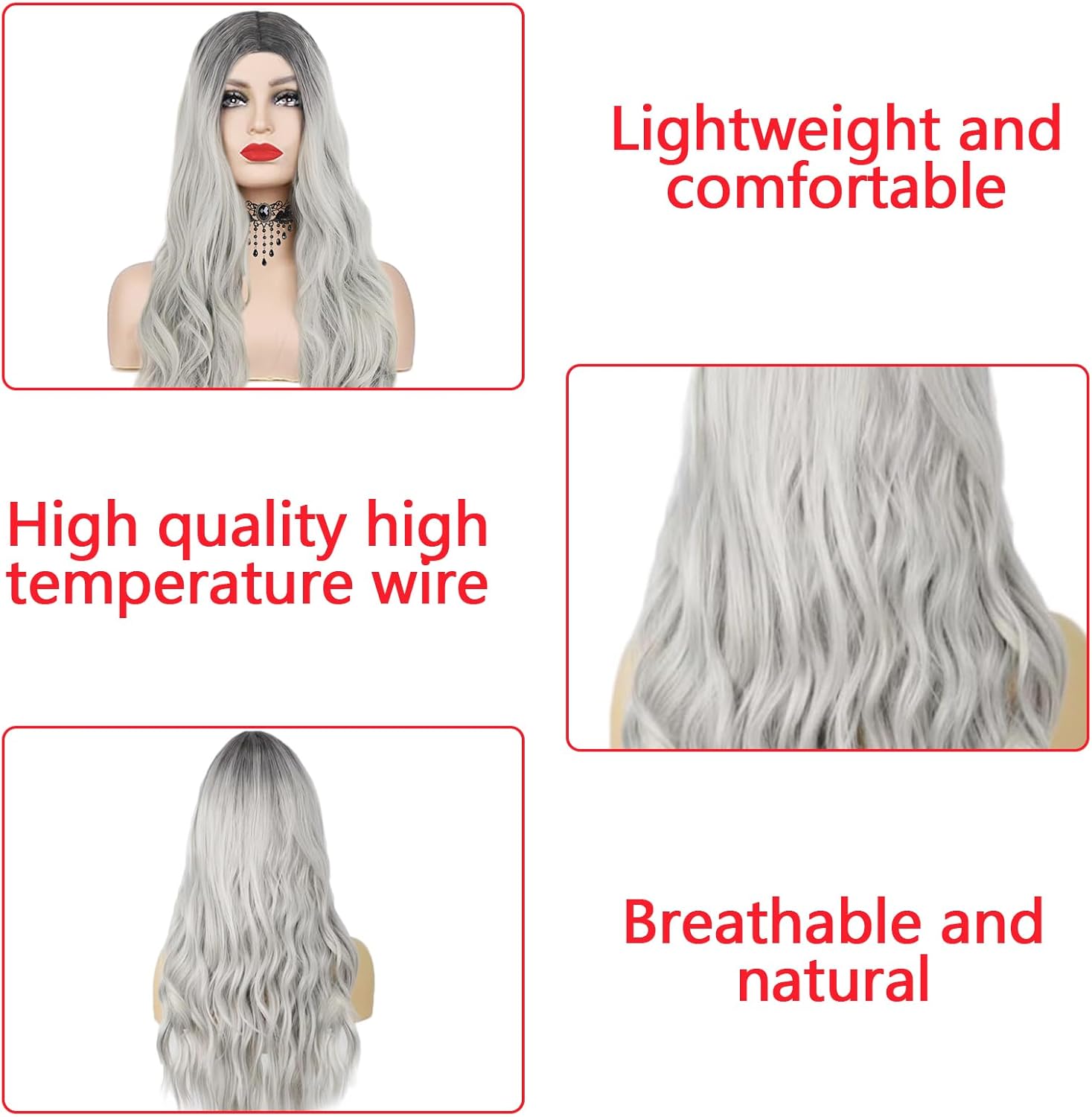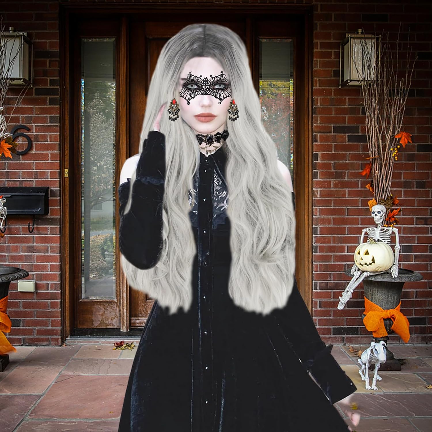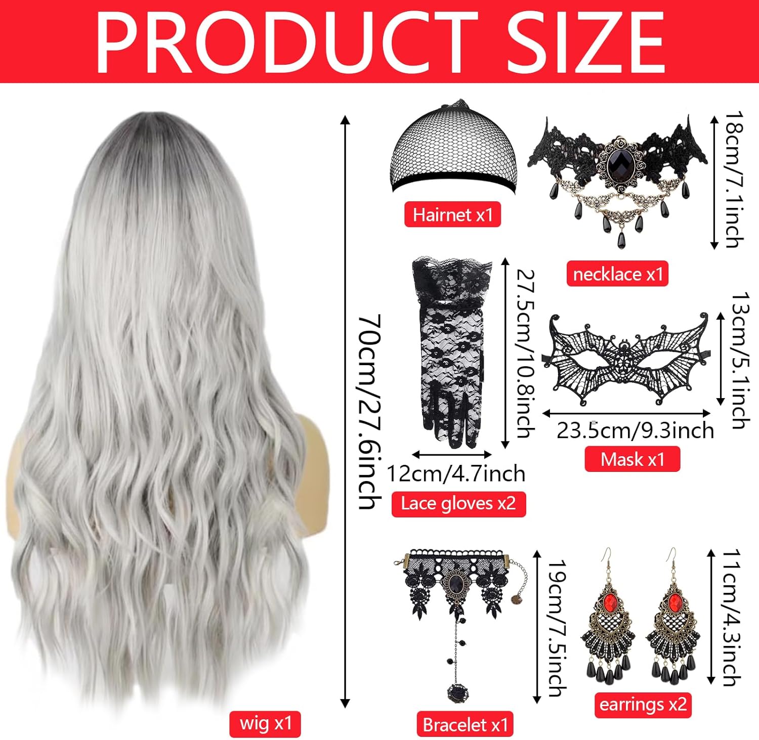 【Set di parrucca da donna】Il nostro set include 1+parrucca grigio argento+ 1 rete per parrucca, 1 collana gotica, 1 braccialetto gotico, 1 paio di orecchini gotici, 1 paio di guanti di pizzo, 1 maschera di pizzo da donna.La rete per parrucca assicura una vestibilità sicura e comfort. 【Materiali della parrucca】 La parrucca da donna è realizzata in fibre sintetiche di alta qualità, ha un aspetto naturale e una sensazione liscia e morbida. È possibile passare a un nuovo colore di capelli e a una nuova acconciatura in pochi minuti e apparire più alla moda ed energici. 【Facile da indossare】 Il set di parrucche viene fornito con una rete per parrucche, ad alta elasticità si adatta alla maggior parte delle circonferenze della testa. La parrucca lunga e riccia ha un elastico interno per regolare la circonferenza della testa, adatto alla maggior parte delle persone. 【Set di gioielli】 Set di parrucche da donna di Halloween con pizzo nero e gioielli gotici, perfetti per Halloween, Mardi Gras, mascherata e altro. Porta più mistero alla tua festa. 【Occasioni applicabili】 La nostra parrucca di Halloween può indossare la parrucca in qualsiasi occasione, come feste di Halloween, eventi di carnevale, feste in maschera, cosplay, eventi scolastici o altri eventi.Con questa parrucca, diventerai un eye-catcher.