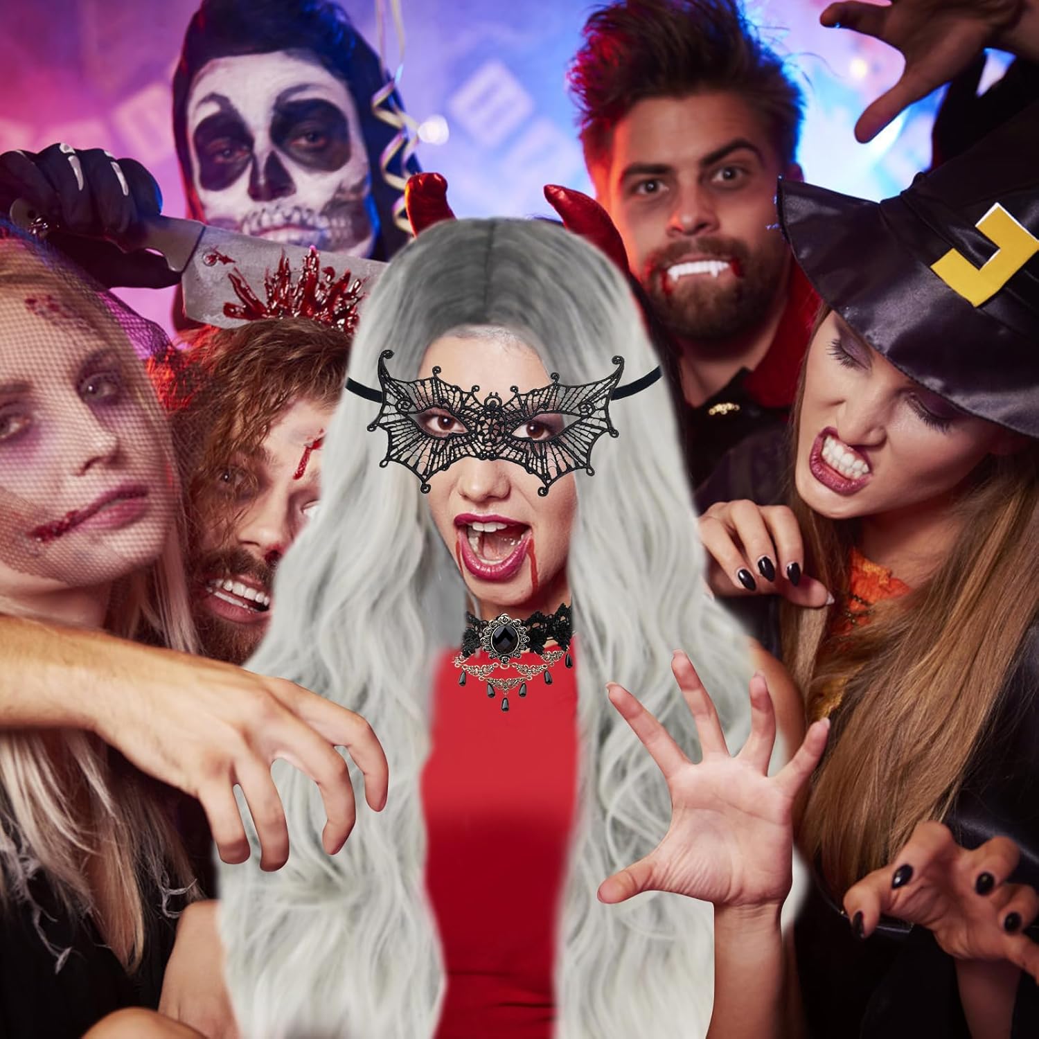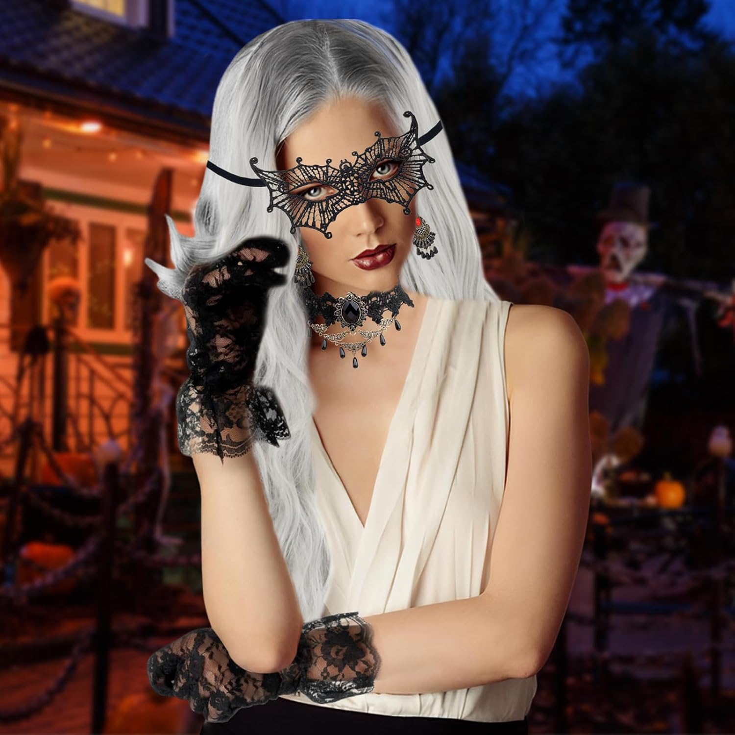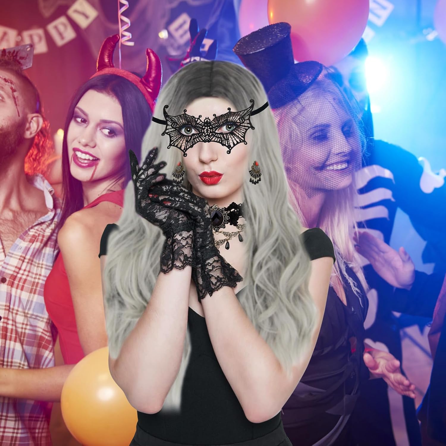 【Set di parrucca da donna】Il nostro set include 1+parrucca grigio argento+ 1 rete per parrucca, 1 collana gotica, 1 braccialetto gotico, 1 paio di orecchini gotici, 1 paio di guanti di pizzo, 1 maschera di pizzo da donna.La rete per parrucca assicura una vestibilità sicura e comfort. 【Materiali della parrucca】 La parrucca da donna è realizzata in fibre sintetiche di alta qualità, ha un aspetto naturale e una sensazione liscia e morbida. È possibile passare a un nuovo colore di capelli e a una nuova acconciatura in pochi minuti e apparire più alla moda ed energici. 【Facile da indossare】 Il set di parrucche viene fornito con una rete per parrucche, ad alta elasticità si adatta alla maggior parte delle circonferenze della testa. La parrucca lunga e riccia ha un elastico interno per regolare la circonferenza della testa, adatto alla maggior parte delle persone. 【Set di gioielli】 Set di parrucche da donna di Halloween con pizzo nero e gioielli gotici, perfetti per Halloween, Mardi Gras, mascherata e altro. Porta più mistero alla tua festa. 【Occasioni applicabili】 La nostra parrucca di Halloween può indossare la parrucca in qualsiasi occasione, come feste di Halloween, eventi di carnevale, feste in maschera, cosplay, eventi scolastici o altri eventi.Con questa parrucca, diventerai un eye-catcher.
