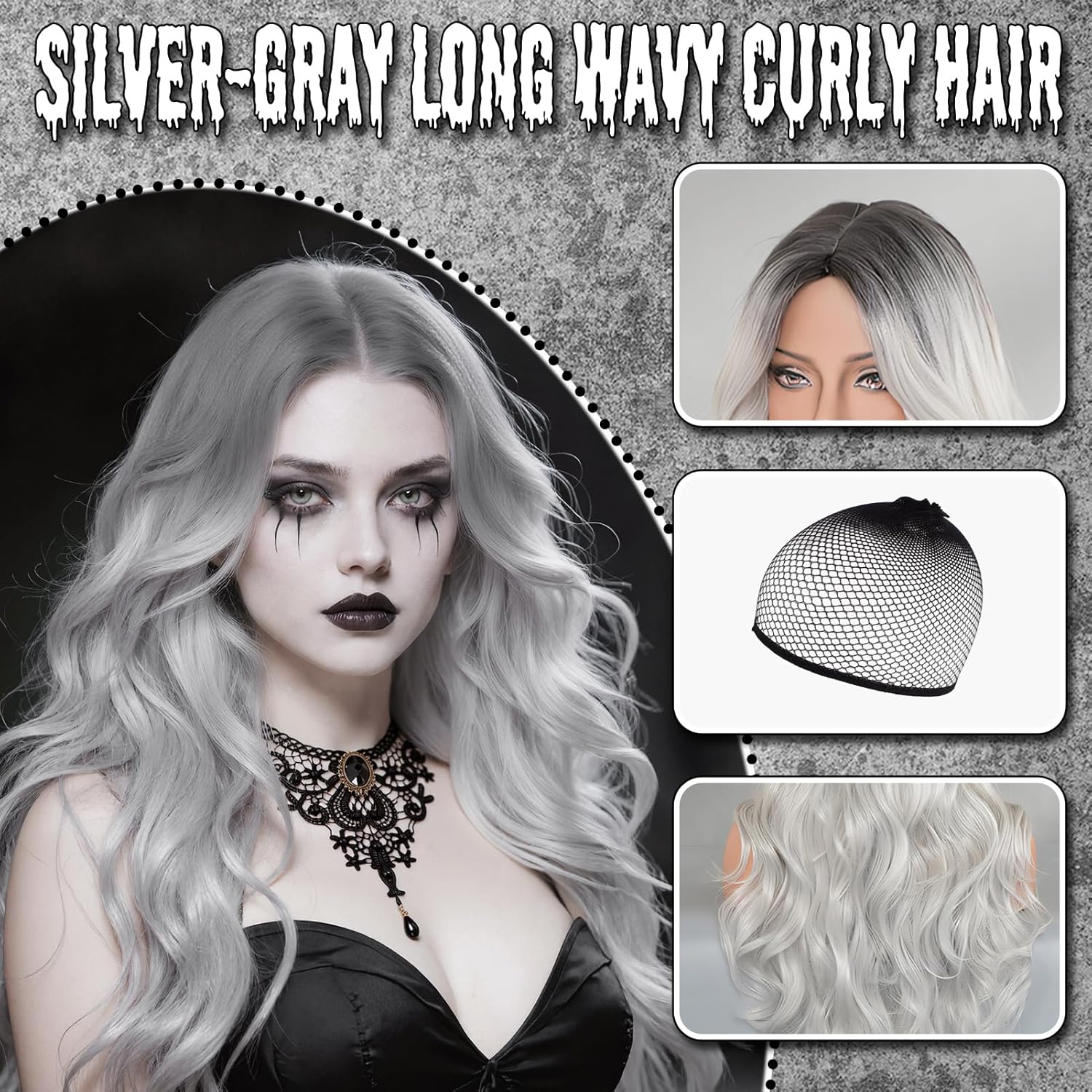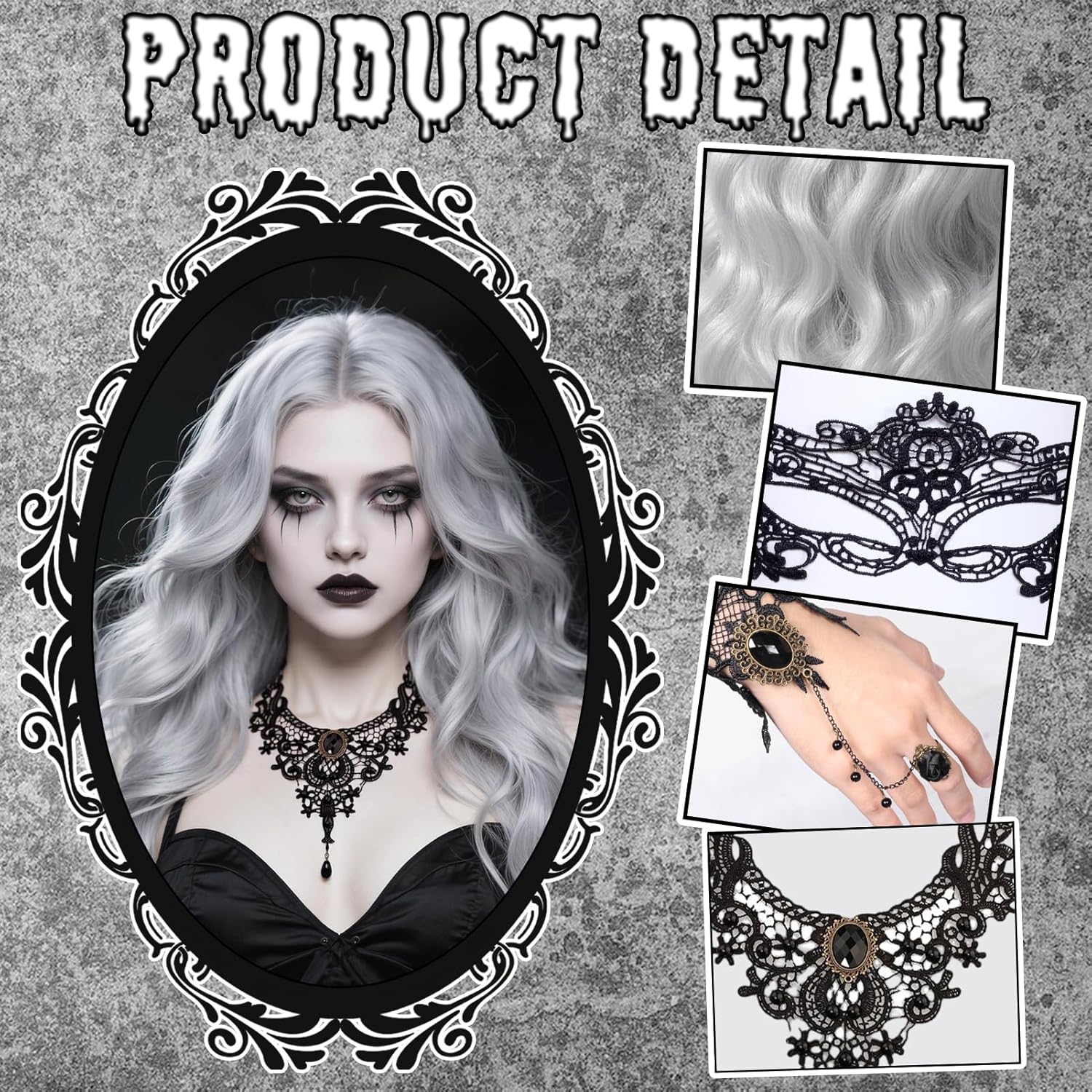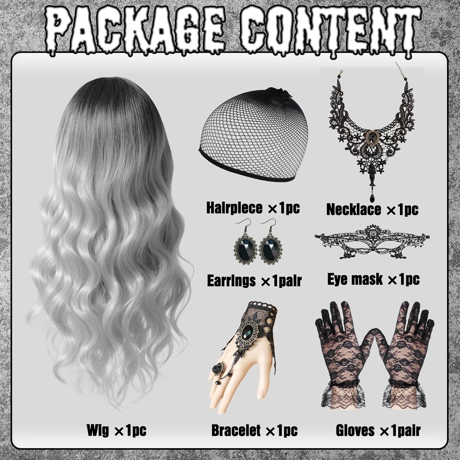 【Parrucca Halloween Donna】Il nostro set di parrucche Halloween include una lunga parrucca grigia ondulata, una retina, una collana, un paio di orecchini, una maschera occhi in pizzo, un paio di guanti in pizzo e un braccialetto in pizzo 【Qualità Eccellente】La nostra lunga parrucca argentata è realizzata in seta di alta qualità, resistente alle alte temperature. È naturale, liscia e morbida, e anti-groviglio, rendendoti al centro dell'attenzione a qualsiasi festa o evento 【Accessori Halloween Donna】Il nostro set di accessori Halloween donna è realizzato in pizzo di alta qualità per una sensazione confortevole e resistente. Lo squisito design in pizzo gotico aggiunge un tocco di mistero ed eleganza 【Retina per Capelli Regolabile】La nostra parrucca grigia donna è dotata di una comoda retina elastica che si adatta a quasi tutte le forme della testa, rendendola facile da indossare e da togliere, e comoda da indossare, regalandoti un look completamente nuovo 【Uso】La nostra splendida parrucca lunga grigia è adatta a tutti i tipi di pelle e stili ed è perfetta per Halloween, carnevale, cosplay, feste in maschera e per l'uso quotidiano