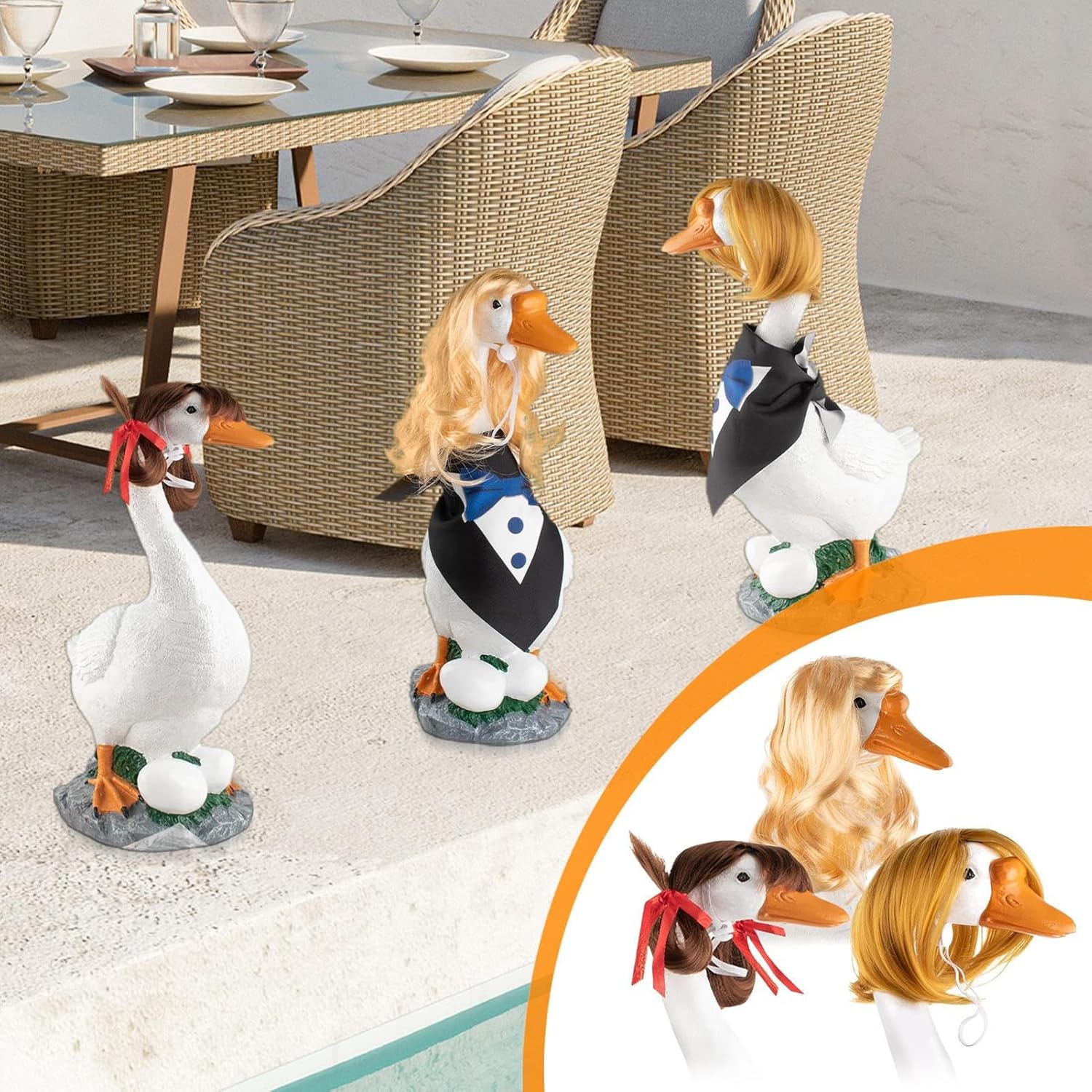 Resistenza : Realizzata con materiale UV resistente e proprietà impermeabili, questo o in fibra sintetica mantiene colore e forma, offrendo prestazioni affidabili come decorazione esterna che resiste agli agenti atmosferici Stili Bob Ondulati: Set di 3 parrucche decorazione stagionale con stile bob ondulato, ideali come costumi festività per composizioni in ogni occasione festiva con versatilità di utilizzo Punto focale da giardino: Abbellisci la tua oca da portico con fiocchi, creando un'affascinante decorazione per esterni che attirerà l'attenzione di tutti grazie al design originale con parrucche decorative Caratteristiche multifunzione: anima i tuoi eventi con questa opzione di stile divertente per esterni, utile come o per giardino, decorazione per feste, addobbo per party in piscina e must-have per costumi di Pasqua, versatile e originale Posizionamento Stabile: con cinturini regolabili e design antiscivolo assicura montaggio semplificato e fissaggio affidabile durante l'esposizione delle parrucche decorative