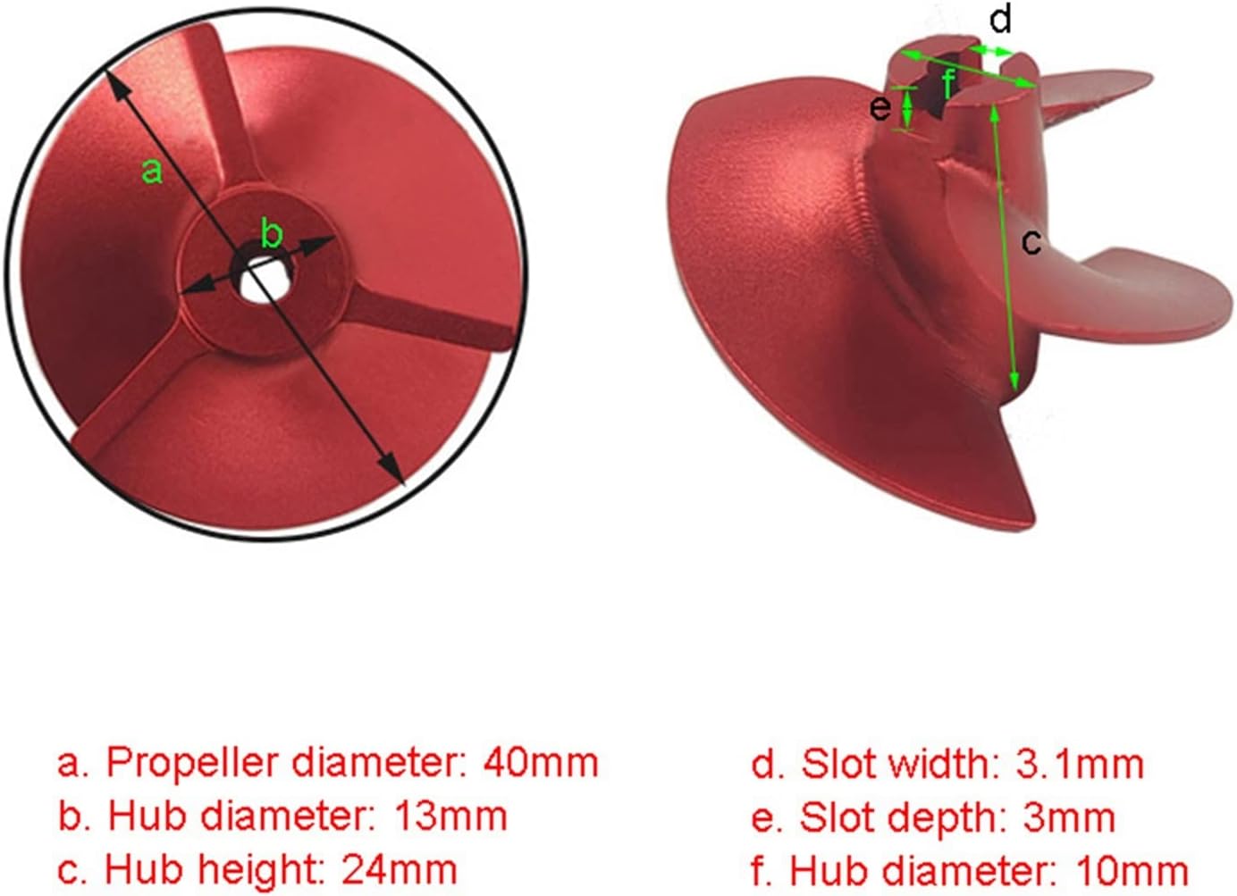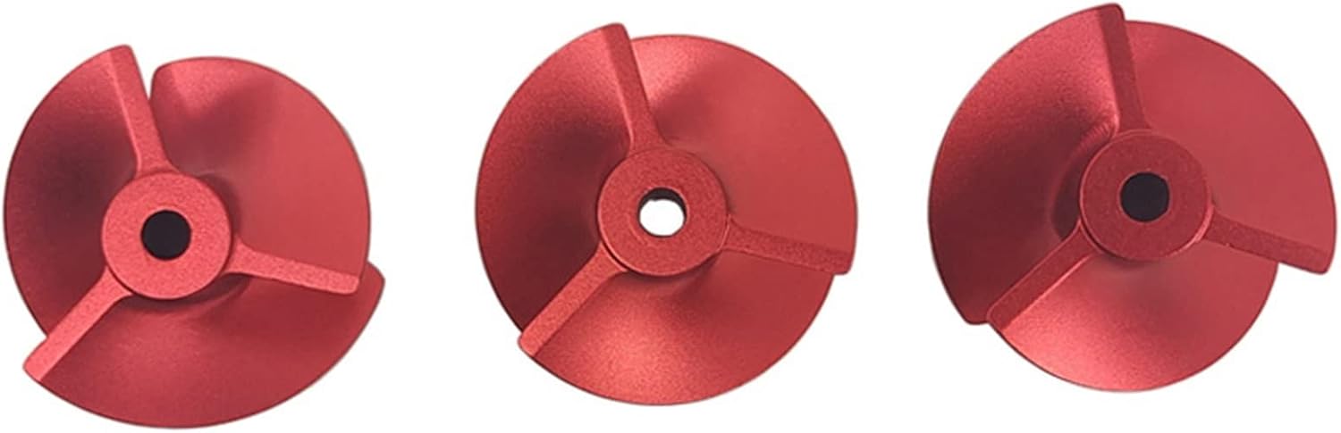 Nome dell'articolo: girante della pompa a getto a 3 pale/elica a tre pale Materiale: lega di alluminio 7075 Colore: rosso Specifiche: UN. Diametro dell'elica: 40 mm b. Diametro del mozzo: 13 mm C. Altezza del mozzo: 24 mm