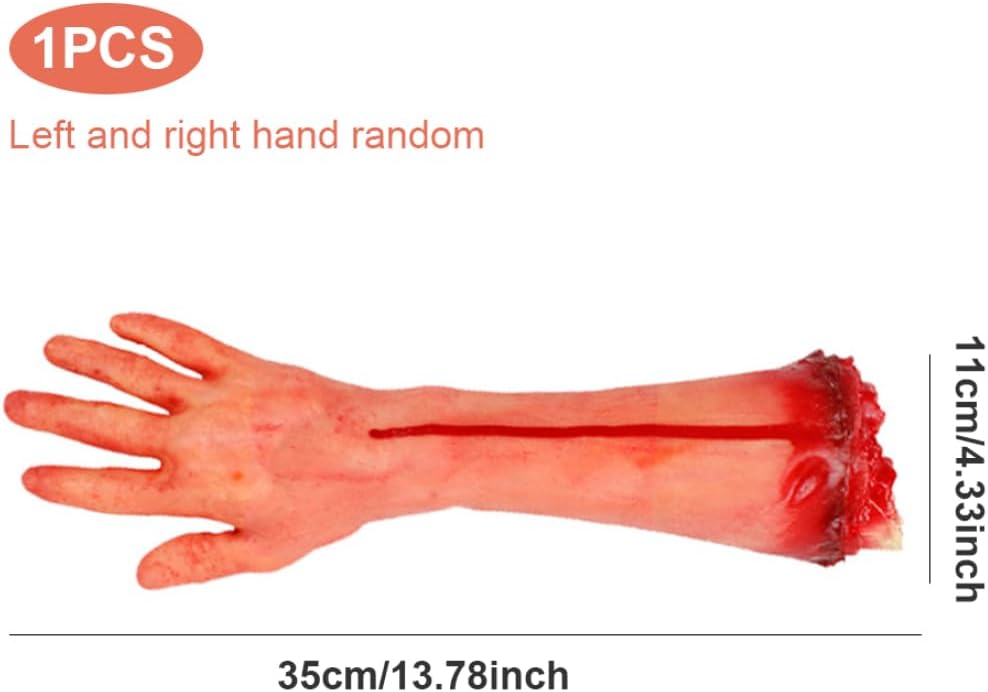 Parti del corpo spaventose per la festa di Halloween... Questo è un braccio mozzato per l'arredamento della tua festa di Halloween o un oggetto di scena spaventoso da giardino. Mano realistica in lattice. Usalo durante una stretta di mano e lascia che il tuo ospite tenga la mano mozzata. Finte decorazioni per cosplay di mani di braccio umano. Riceverai 1 mano sinistra o destra casuale. Può essere utilizzato per feste, carnevali, Halloween, feste in costume, ecc. Mano di braccio umano in gomma. Aspetto realistico, perfetto per decorazioni di Halloween, case infestate, oggetti scenici, trucchi magici, primo di aprile e altre parti del corpo delle mani di Halloween. Materiale in gomma ambientale, si toccano come la pelle umana, molto realistico.