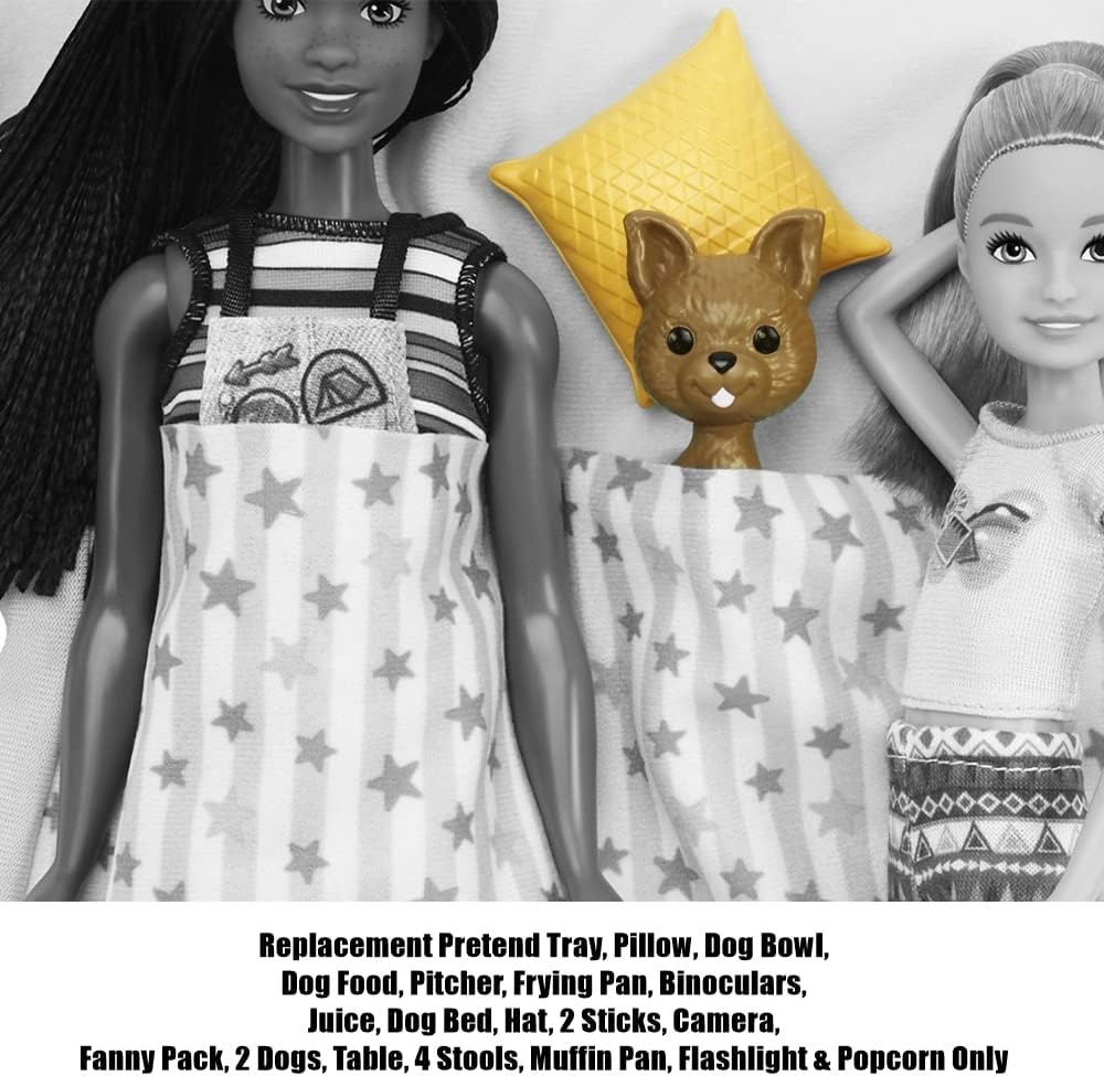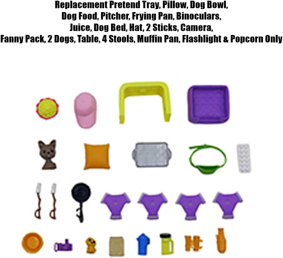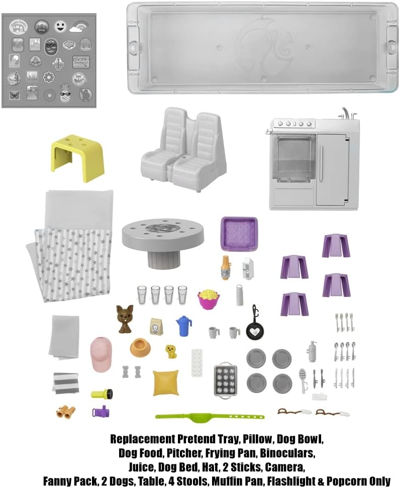 Parti di ricambio originali Include vassoio da gioco, cuscino, ciotola per cani, cibo per cani, brocca, padella, binocolo, succo di frutta, cuccia, cappello, 2 bastoni, marsupio, 2 cani, tavolo, 4 sgabelli, stampo per muffin, torcia elettrica e popcorn Forma perfetta e adatta per il tuo kit camper Barbie Dream I pezzi di ricambio originali sono forniti in un sacchetto di plastica sigillato Realizzato per il modello #HCD46 - Barbie Dream Camper Vehicle Playset