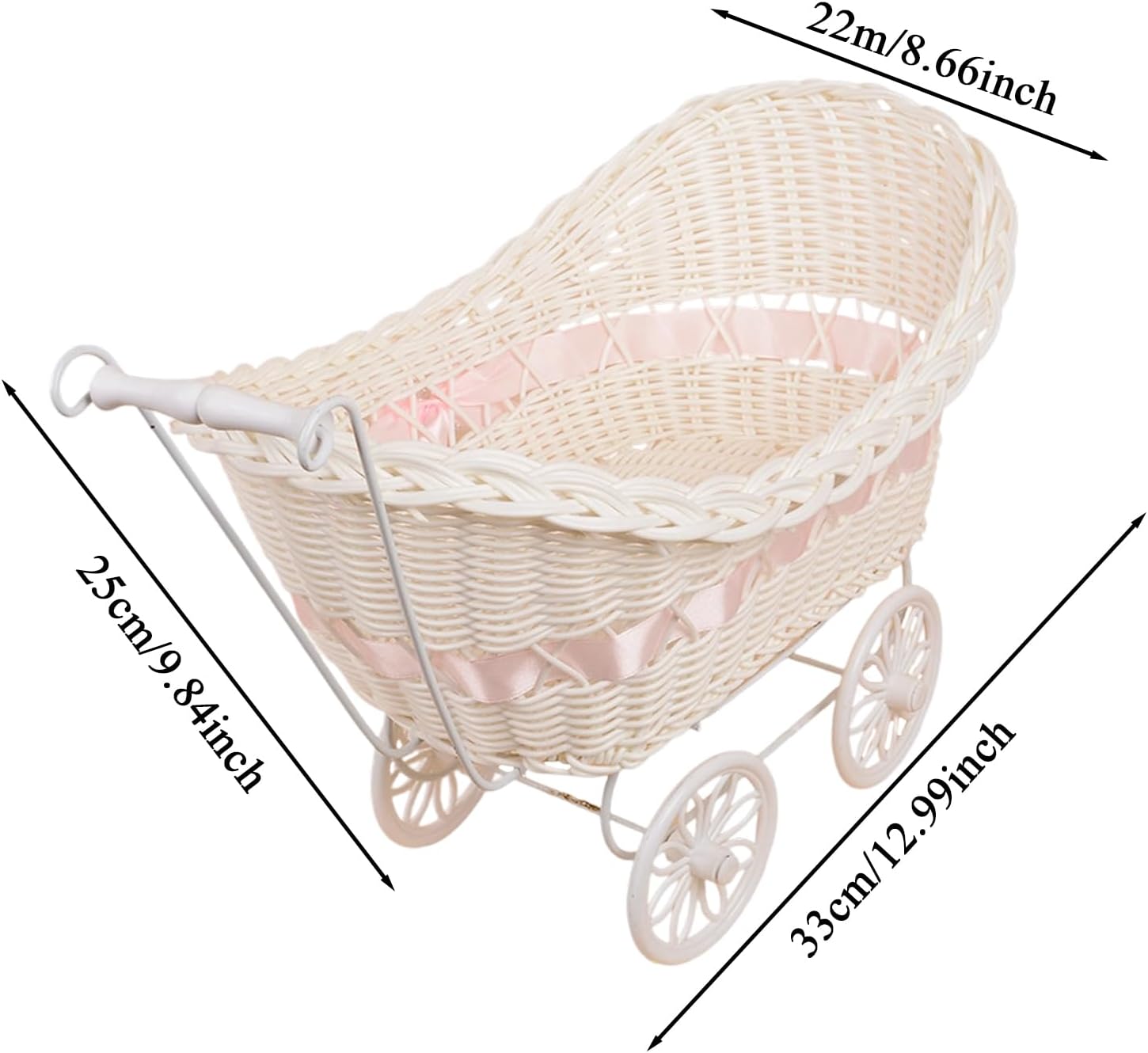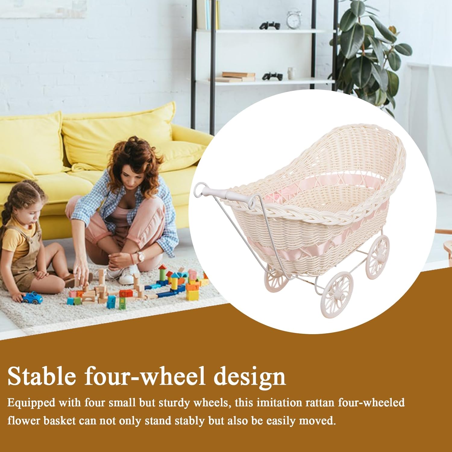 Robusto cestino: con quattro ruote per un movimento senza sforzo, questo robusto cestino è un pratico veicolo giocattolo e versatile accessorio per la casa. Combina funzionalità con un design accattivante per diverse esigenze domestiche come contenitore decorativo. Portavaso minimalista: ravviva gli spazi con questo versatile oggetto decorativo. Serve come un semplice portavasi con un tocco vintage che ricorda l'eleganza dei carrelli di fiori storici. Soluzione salvaspazio: funge da pratico accessorio per la casa per più stanze, funziona come cesto per piante compatto, carrello giocattolo giocoso e elemento decorativo per ottimizzare lo spazio abitativo Molteplici applicazioni: questa decorazione per passeggino combina utilità e stile come soluzione creativa, decorazione per matrimoni, carrello giocattolo fantasioso per giochi di ruolo per bambini e supporto decorativo per la casa per creare decorazioni accattivanti. Rattan sintetico intrecciato a mano: raggiungete un'eleganza senza tempo con un cesto intrecciato a mano in rattan sintetico che combina fascino estetico con pratico contenitore e valorizza qualsiasi spazio abitativo senza sforzo.