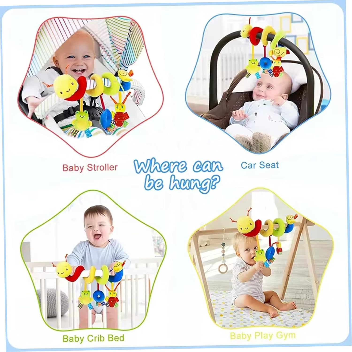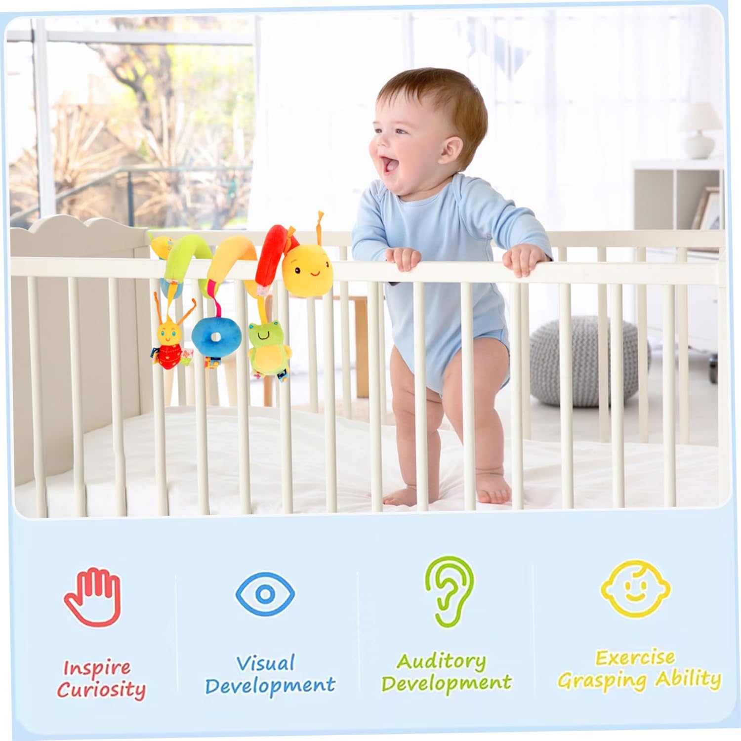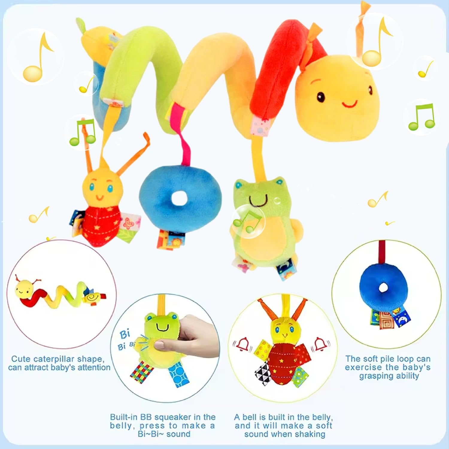 MATERIALI SICURI E ADATTI AI BAMBINI: Realizzati con tessuti atossici con cuciture rinforzate e parti fissate saldamente per ridurre al minimo il rischio di soffocamento; I componenti lavabili in superficie mantengono il giocattolo igienico per l'uso quotidiano come macchinina. Compagno di viaggio portatile: il design leggero e flessibile si inserisce nelle borse per pannolini e si appende facilmente per intrattenere. Un giocattolo per passeggino calmante e che attira l'attenzione e regali premurosi per calmare e coinvolgere i più piccoli durante le passeggiate. Varie clip e passanti: clip girevoli di fissaggio e regolazioni dei passanti regolabili per la maggior parte dei seggiolini auto, passeggini e culle per un attacco e una rimozione rapidi, rendendo questi giocattoli per seggiolini auto per neonati ideali per viaggi, giri in auto e passeggiate con passeggino senza problemi. Morbido peluche sensoriale: personaggi di peluche ultra morbidi con volti sorridenti luminosi, trame varie e colori ad alto contrasto stimolano il tracciamento visivo, l'esplorazione tattile e lo sviluppo sensoriale precoce, confortando il tuo bambino durante le uscite. Divertimento interattivo con la corda da tirare: il meccanismo di regolazione attiva movimenti delicati e sonagli morbidi per deliziare i bambini, promuovendo al contempo la coordinazione occhio-mano e tipi di apprendimento come giocattoli per auto per bambini e giocattoli da appendere al seggiolino per auto per i giochi del passeggino.