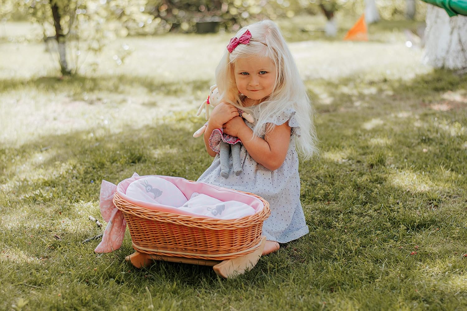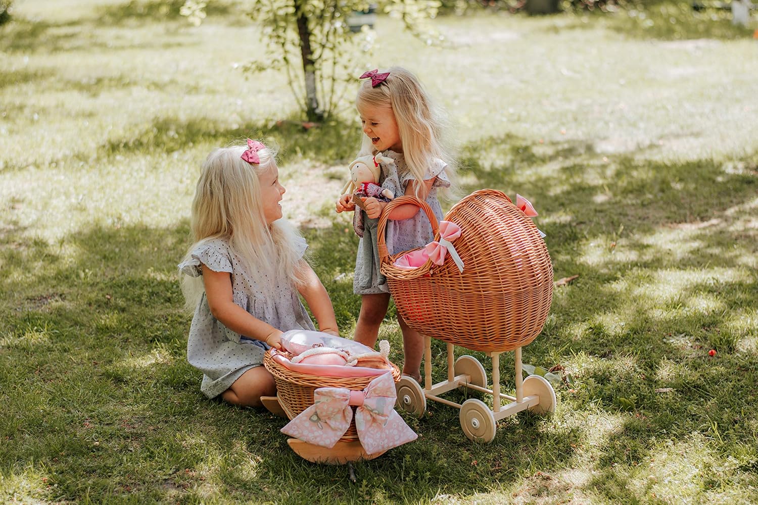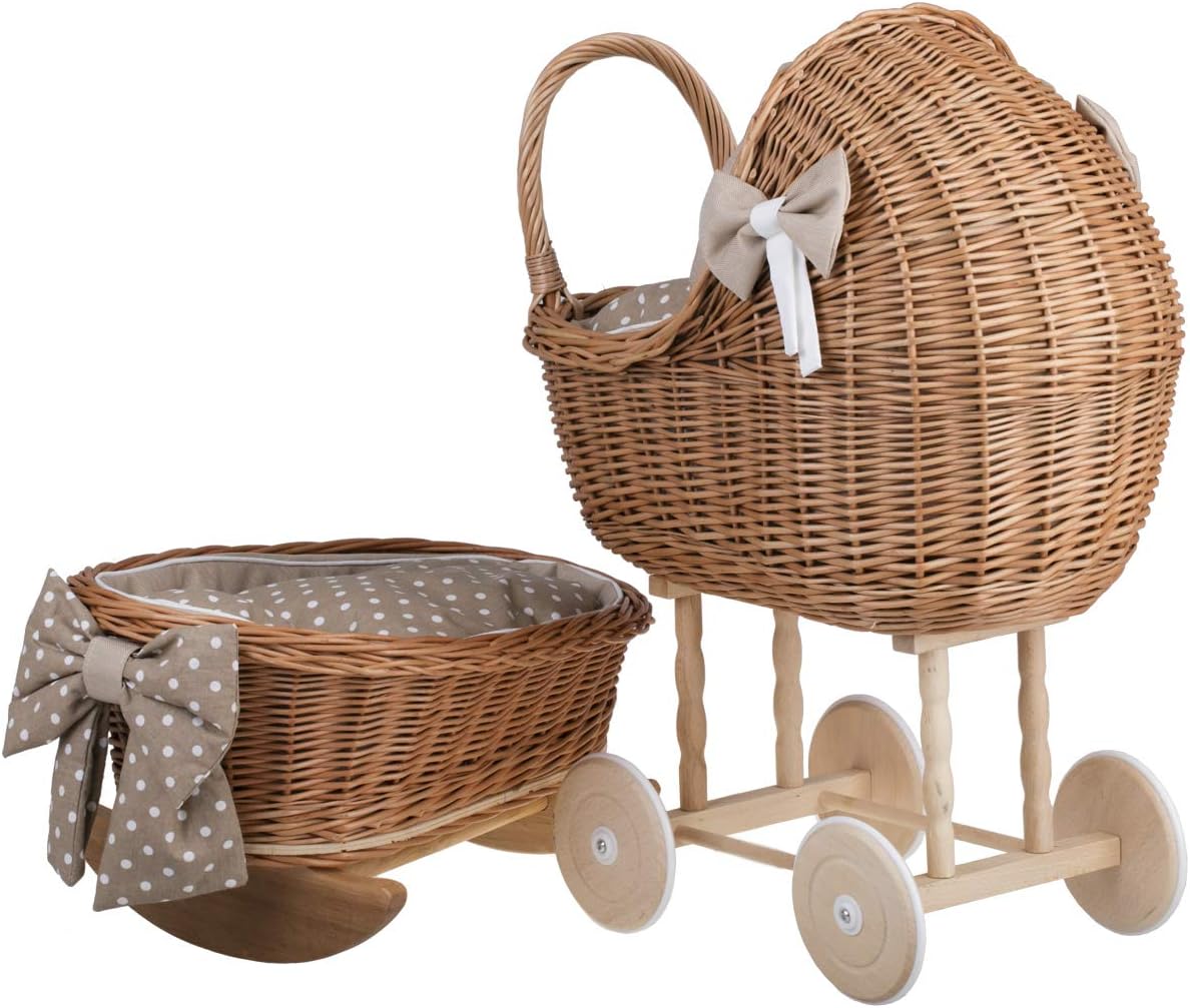 ✔ Passeggino per bambole e culla con biancheria da letto in beige ✔ Robusto e molto stabile, solida struttura in legno, ruote gommate ✔ In vimini (colore naturale) intrecciato a mano in Europa ✔ Un super regalo per la tua figlia o nipote ✔ Passeggino per bambole – 48 x 28 H60 – 46 x 32 H20