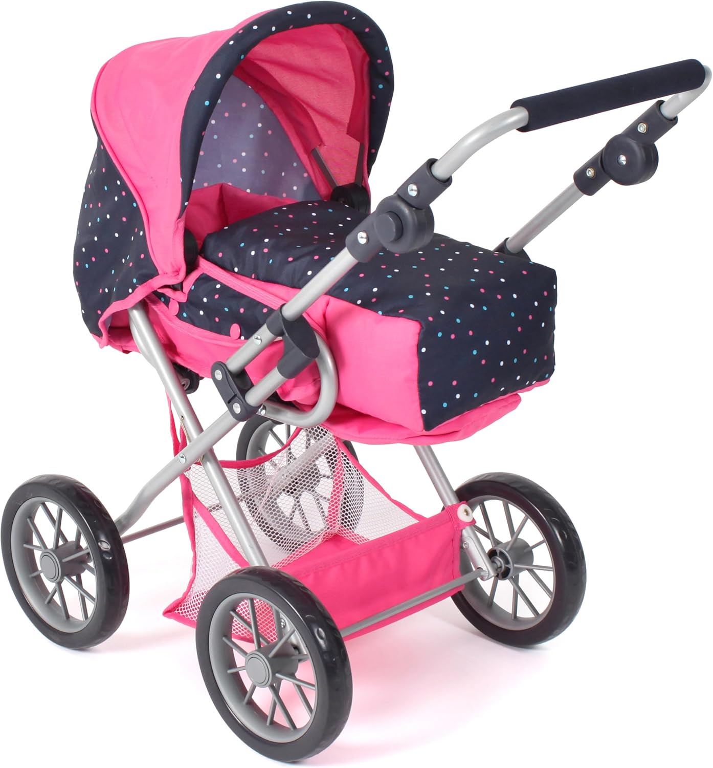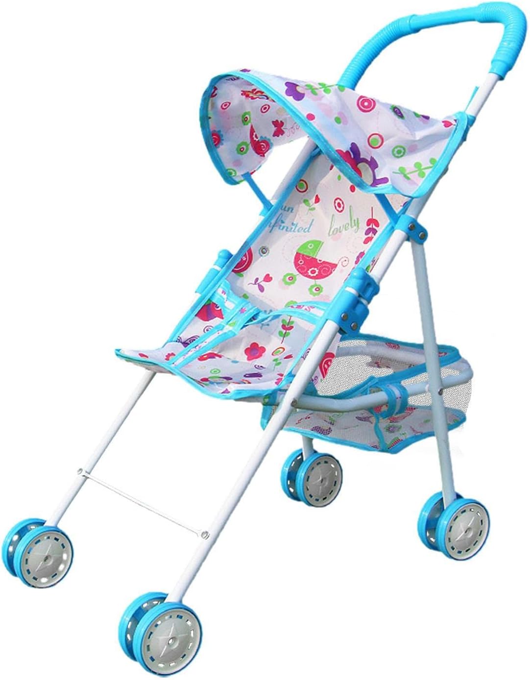 Passeggino per Bebè giocattolo con materasso speciale. Borsa e ombrello abbinati inclusi. Il passeggino è alto 60 cm, largo 38 cm e lungo 65 cm. Struttura pieghevole per un facile trasporto e stoccaggio. Peso leggero e disegno robusto.