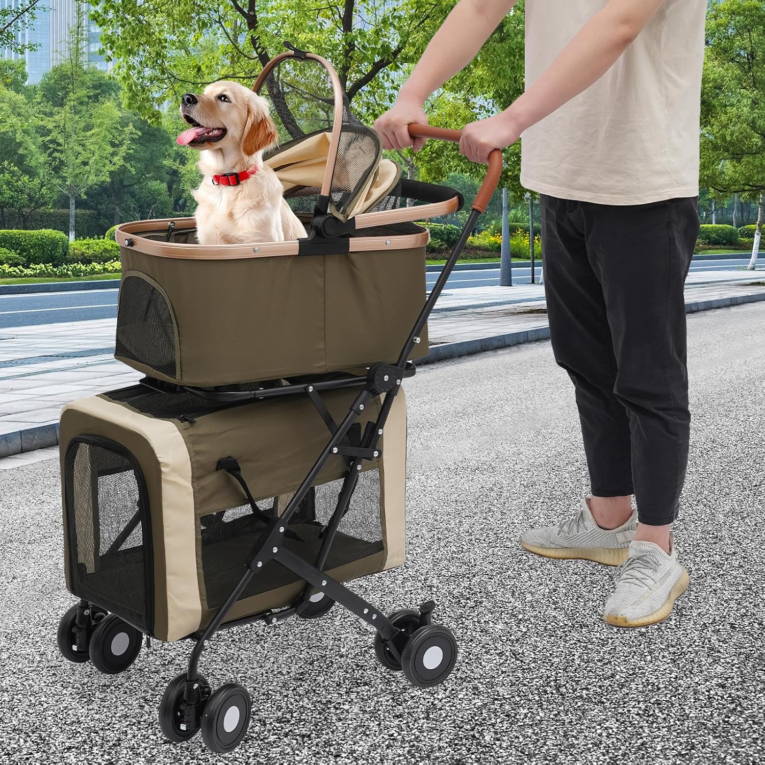 Descrizione Questo carrello per animali domestici a due piani è caratterizzato da un design elegante e una funzionalità completa. La struttura a due piani è sia ben ventilata che spaziosa, quindi è ideale per trasportare due amati animali domestici. È leggero e facile da piegare, dotato di quattro ruote flessibili per un movimento fluido e può facilmente gestire diverse condizioni stradali, consentendo ai vostri animali domestici di godere di un viaggio sicuro e confortevole. Caratteristiche principali: Materiali di alta qualità: questo passeggino è realizzato in resistente tessuto Oxford 300D e acciaio resistente, resistente agli strappi, durevole e resistente, garantendo affidabilità duratura. Design multifunzione 3 in 1: questo passeggino per animali domestici presenta una struttura unica a due piani, con sia il livello superiore che quello inferiore per fornire spazio per gli animali domestici. Può trasportare fino a 77 libbre in modo sicuro, rendendolo ideale per trasportare due cani o più gatti contemporaneamente, risparmiando spazio e semplificando la manipolazione. Traspirante e confortevole: il design a rete traspirante garantisce un'adeguata circolazione dell'aria all'interno del passeggino, prevenendo così l'aria soffocante. I morbidi cuscinetti interni assicurano che i vostri animali domestici si sentano a proprio agio durante la guida. La protezione solare fornisce ombra e protezione, garantendo il massimo comfort in qualsiasi condizione atmosferica. Pratico strumento di aiuto: questo prodotto include un passeggino e due scatole per il trasporto di animali domestici che possono essere combinati per trasportare comodamente più animali domestici. Le scatole per il trasporto di animali domestici possono anche essere rimosse e utilizzate come borse a mano o a tracolla, aumentando il comfort di viaggio. Facile da riporre e trasportare: il passeggino si ripiega facilmente, il che lo rende comodo da riporre e trasportare ed è particolarmente adatto per i proprietari di animali domestici che viaggiano frequentemente o fanno gite. Sicuro e affidabile: il design include una chiusura per il trasporto, una chiusura di base, un blocco di sicurezza per il corpo, un guinzaglio di sicurezza per la maniglia e una cerniera per garantire la sicurezza del tuo animale domestico durante il viaggio ed evitare che salti accidentalmente durante il viaggio. Facile da usare: il passeggino è dotato di ruote anteriori girevoli a 360°, che consentono uno sterzo flessibile, un efficace assorbimento degli urti e un movimento fluido, consentendo di scivolare facilmente su marciapiedi, parchi e terreni irregolari. Due freni facilitano inoltre la sicurezza del passeggino e garantiscono stabilità. Design elegante: il passeggino è caratterizzato da un design minimalista e moderno con combinazioni di colori eleganti e raffinate, che lo rendono non solo un pratico accessorio per gli animali domestici, ma anche un elemento di arredo elegante. Servizio clienti: ci impegniamo a fornire prodotti e servizi di alta qualità. Se avete problemi, non esitate a contattarci. Ti risponderemo al più presto e risolveremo il problema per te. Dettagli: Manico regolabile: la maniglia sulla parte superiore della borsa per animali domestici può essere regolata da 0 a 180 gradi, offrendo una maggiore flessibilità durante l'uso. Maniglione per passeggino: è ergonomico e comodo da tenere in mano, in modo che il passeggino possa essere facilmente spinto. Pratica borsa portaoggetti: offre spazio aggiuntivo per trasportare comodamente più accessori quando si viaggia con il vostro animale domestico. Utilizzo: Può trasportare in sicurezza fino a 77 libbre e può ospitare due cani di piccola e media taglia, più gatti o due piccoli animali domestici contemporaneamente. È ideale per viaggiare con animali domestici, shopping e avventure all'aria aperta. Come smontare e piegarli 1. Allentare i fermagli sulla piccola borsa per animali domestici e rimuoverli dal telaio. 2. Allentare le chiusure alla base e rimuovere la grande borsa per animali domestici dal telaio. 3. Aprire il blocco di sicurezza e premere il telaio verso il basso. 4. Conservare il telaio piegato in un luogo conveniente. Specifiche: Tipo di fissaggio: Libera installazione Montaggio richiesto: sì. Stile: moderno. Materiale: resistente tessuto Oxford 300D, acciaio resistente. Numero di livelli: 2 Portata totale: 35 kg/77 lbs Dimensione totale: 46 x 58 x 97 cm. Dimensioni da piegato: 25 x 56 cm (larghezza x altezza): 9,8 x 22 cm. Dimensioni della scatola di trasporto superiore: 33 x 56 x 43 cm. Altezza totale del trasportino superiore: 59 cm. Dimensioni del contenitore inferiore per il trasporto di animali domestici: 33 x 57 x 40 cm. Dimensioni confezione: 66 x 48 x 28 cm. Peso lordo: 8,45 kg/18,63 lbs Peso netto: 7,2 kg/15,87 lbs Contenuto della 1 carrello per animali domestici a due piani. 2 scatole per il trasporto di animali domestici. 2 cuscini. 1* Manuale utente inglese Avvertenze: 1. Si prega di verificare lo stile e le dimensioni prima dell'acquisto. 2. Si prega di leggere completamente il manuale di istruzioni prima dell'installazione e dell'utilizzo e in particolare di osservare le istruzioni di sicurezza in esso contenute. 3. Si prega di non superare la capacità massima di carico durante l'uso. 4. Si prega di notare che a causa della luce durante lo scatto fotografico, potrebbe esserci una leggera differenza di colore e potrebbe esserci una differenza di 1-3 cm dovuta alla misurazione manuale. Assicurati di essere d'accordo con questo prima di ordinare.