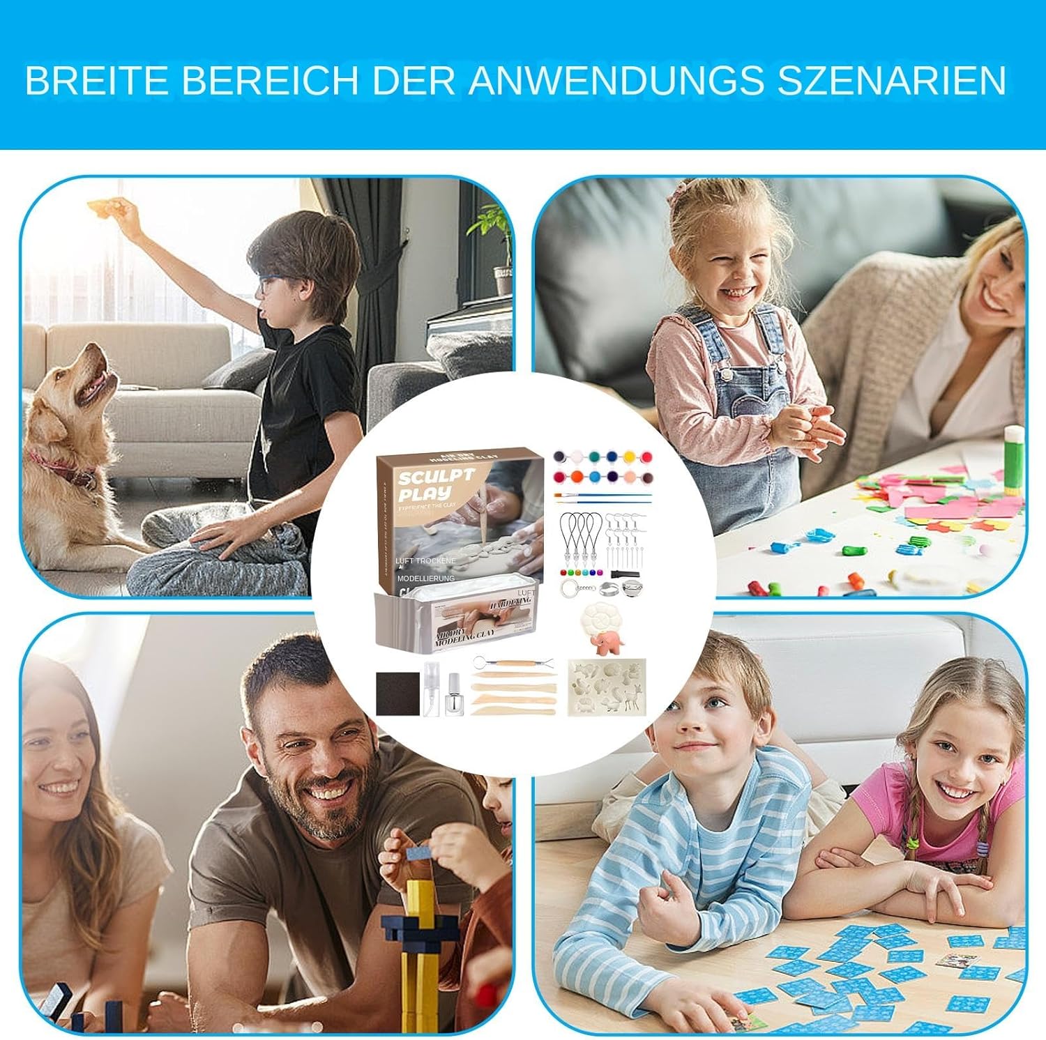 Ampio set creativo: questo set di pasta modellabile che asciuga all'aria con 12 colori acrilici, pennelli a doppia faccia, vernice di finitura, flacone spray e strumenti di modellazione garantisce un'ampia gamma di opzioni creative che i bambini possono scoprire giocosamente con gioia e facilità. Varietà di disegni di colori: disegni unici grazie ai colori automiscelati con un pennello piatto e appuntito, tecniche di texture migliorate per lavori artigianali eccezionali con una maneggevolezza a misura di bambino. Sicuro e stabile: grazie alla composizione adatta ai bambini e innocua, questa argilla che asciuga all'aria è assolutamente sicura. La texture morbida ed elastica si asciuga creando una superficie stabile e resistente alle crepe che protegge permanentemente le opere d'arte e garantisce creazioni di lunga durata. Usi multipli: esplorare tecniche 3D/2D, aiuti per l'apprendimento artistico, promuovere le capacità motorie, creare opportunità per progetti artigianali stagionali e divertimento in famiglia. Divertimento con i progetti con l'impasto: impasto che asciuga all'aria per bambini con pan di spagna e forme semplici - perfetto per idee artigianali veloci senza cottura, incoraggia la creatività con strumenti pratici