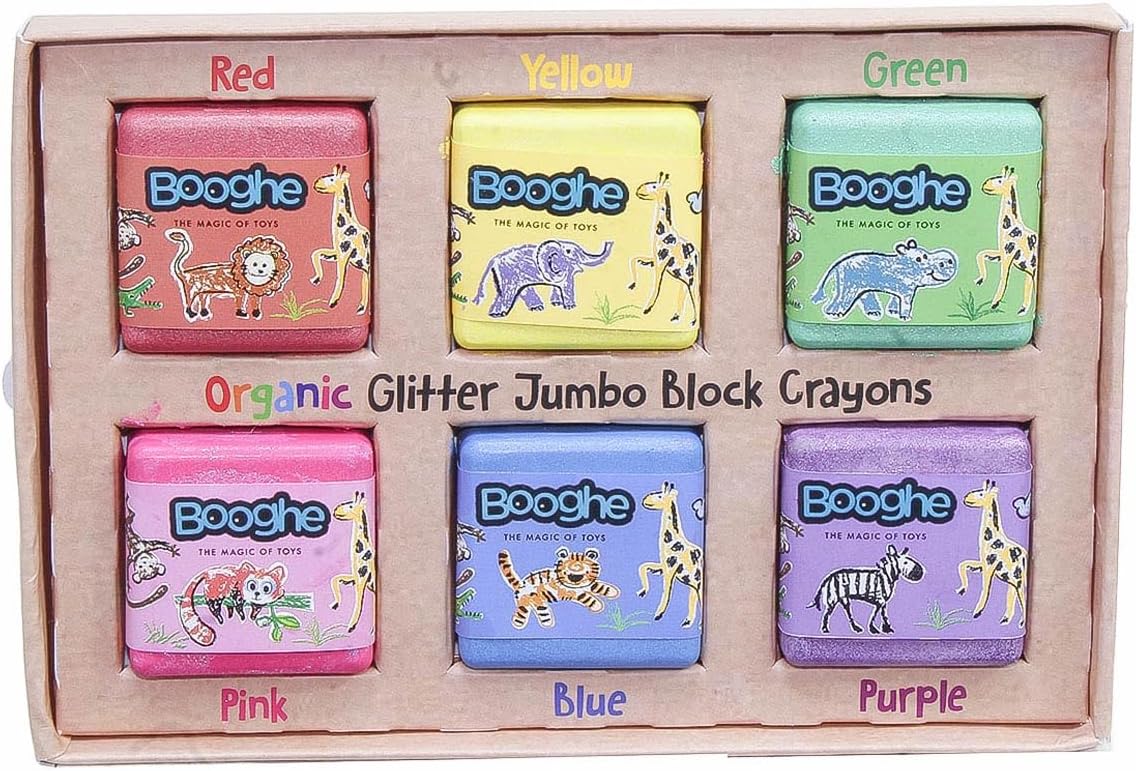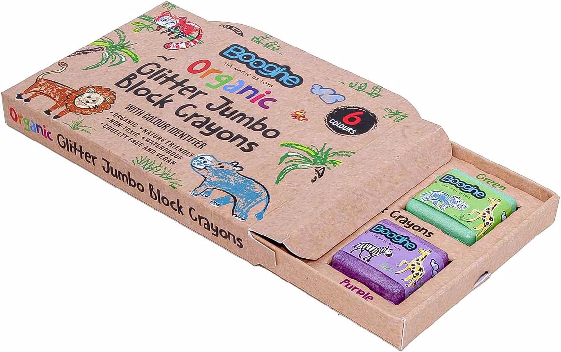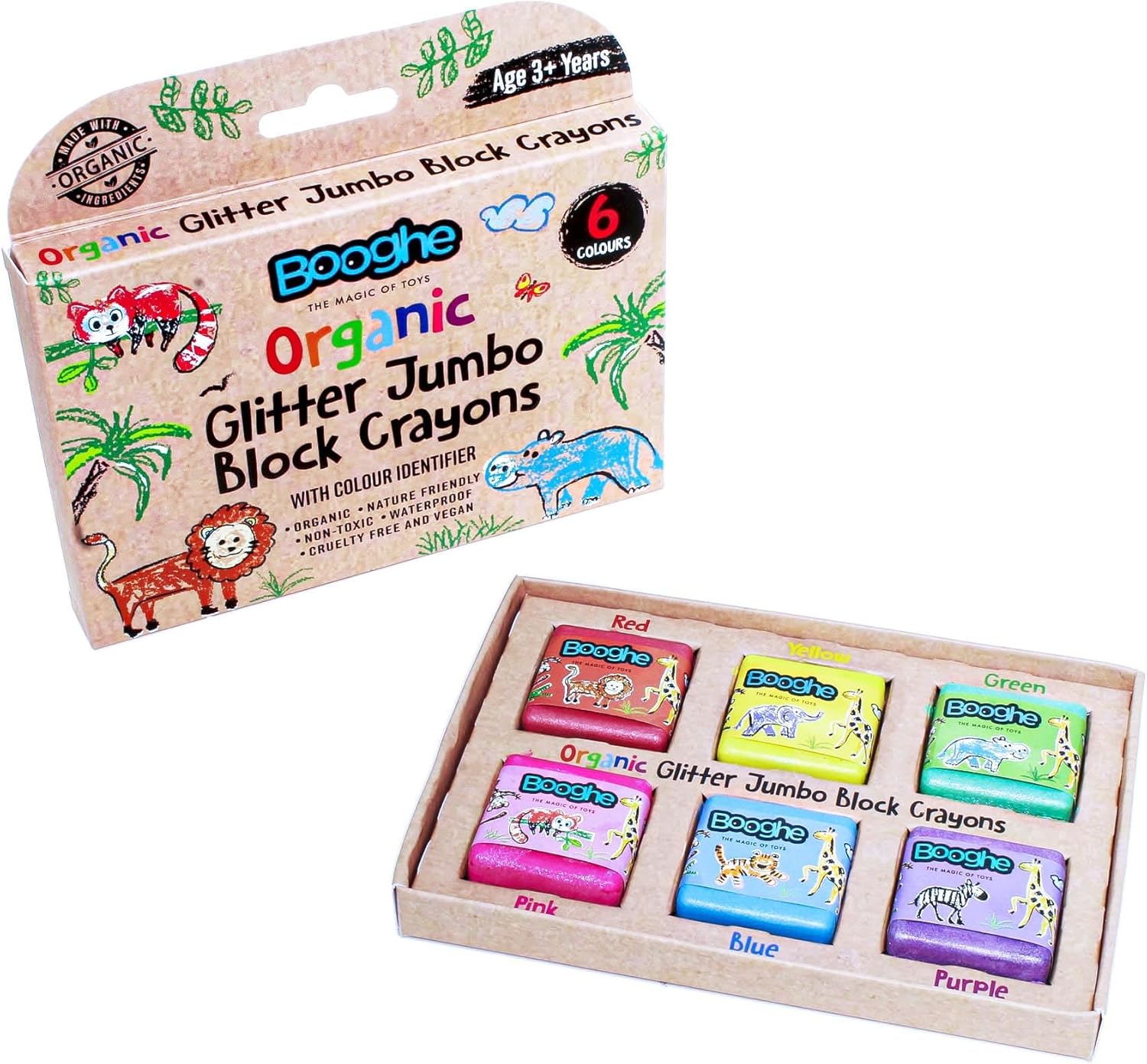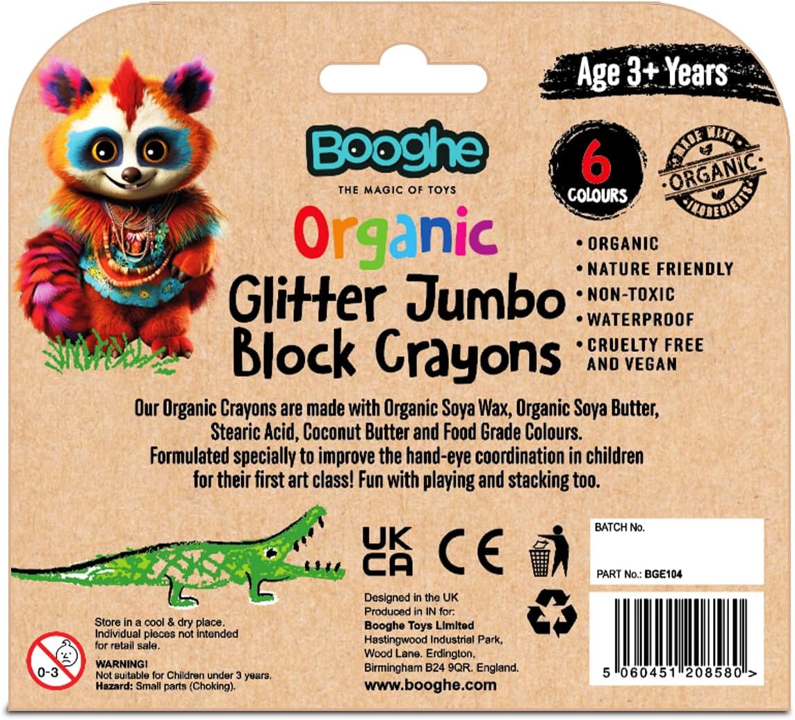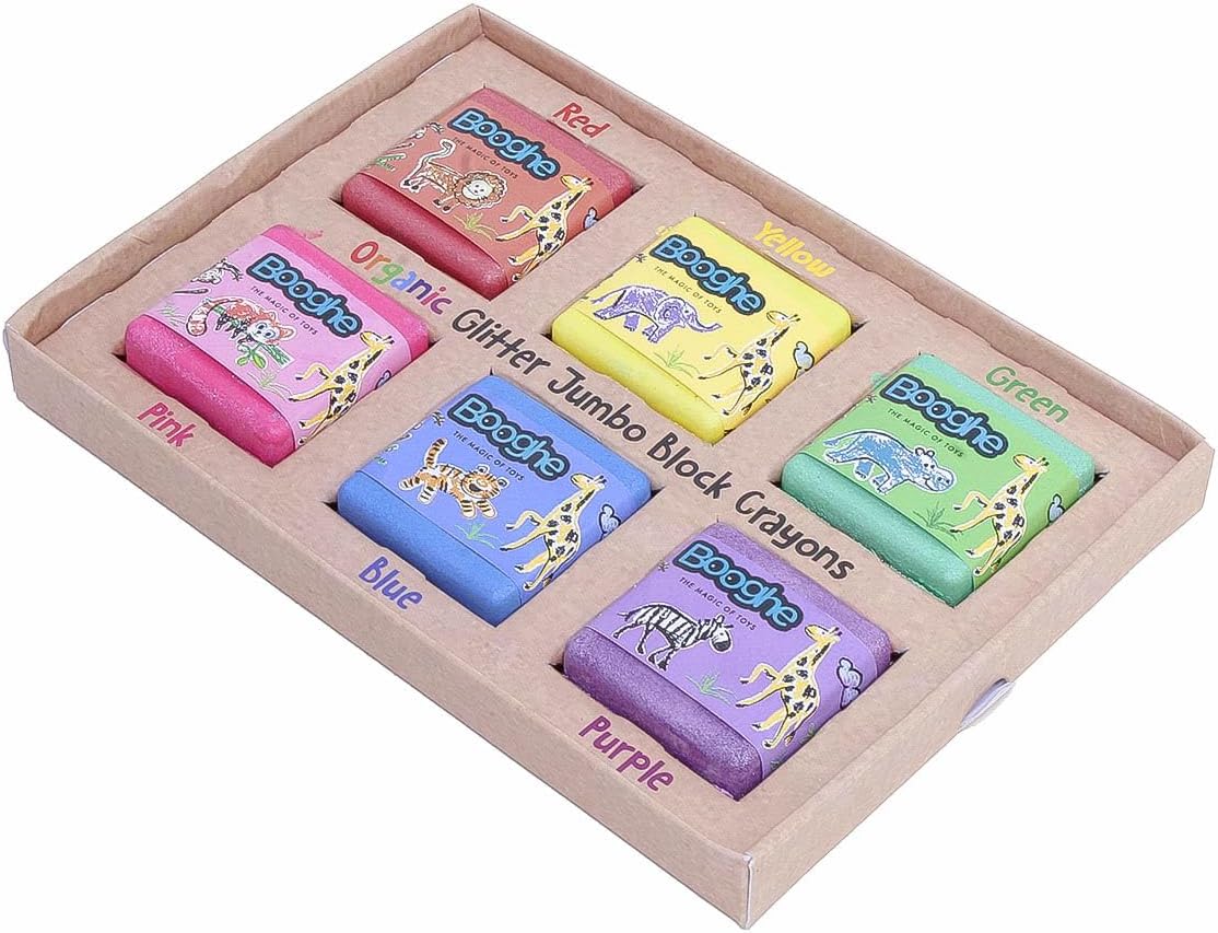BOOGHE Penne glitterate organiche: realizzate con ingredienti biologici come cera di soia biologica, burro di soia biologico, burro di cocco biologico e coloranti per alimenti. Codice colore: le nostre matite colorate jumbo sono codificate per colore: blu, rosa, verde, giallo, rosso, viola. Appositamente progettato per migliorare la coordinazione occhio-mano dei bambini durante le prime lezioni d'arte. Divertente da giocare e impilare. Matite colorate Jumbo a forma di blocco per una facile presa e tenuta: le penne a blocco jumbo glitterate contengono più pigmenti e colori ricchi aiutano i bambini a esprimere il loro artista interiore. Aderisce facilmente alla carta o al cartone e ha una lunga durata e qualità. Biologico, naturale, atossico, impermeabile, cruelty free e vegano. Ciò che distingue i gessetti Gliiter Jumbo Block di Booghe è il fatto che i nostri pastelli sono biologici, privi di sostanze chimiche e atossici. I bambini hanno l'abitudine di mettere tutto in bocca. Ecco perché abbiamo realizzato pastelli con cere biologiche di altissima qualità. Vengono utilizzati solo ingredienti vegetali naturali e mai testati sugli animali. Disponibile in varie forme di matite colorate: le matite colorate organiche Booghe sono disponibili anche in varie forme: matite colorate, matite a blocco, matite Jumbo Block. Ideale per l'uso a casa o a scuola e sono uno strumento creativo indispensabile per i bambini. Perfetto per progetti artistici e colorazione più fini e realizzato con gli stessi ingredienti biologici! ! SOSTENIBILI E SICURE Le nostre matite colorate sono certificate EN 71 e EN 72, UKCA, CE. Privo di petrolchimici e riempitivi, sicuro per bambini, ragazze, ragazzi e bambini. La nostra missione: l'obiettivo di Booghe è creare prodotti sicuri e sostenibili che i bambini adoreranno utilizzare. Usiamo ingredienti biologici, il che significa bene per i bambini e per il pianeta.