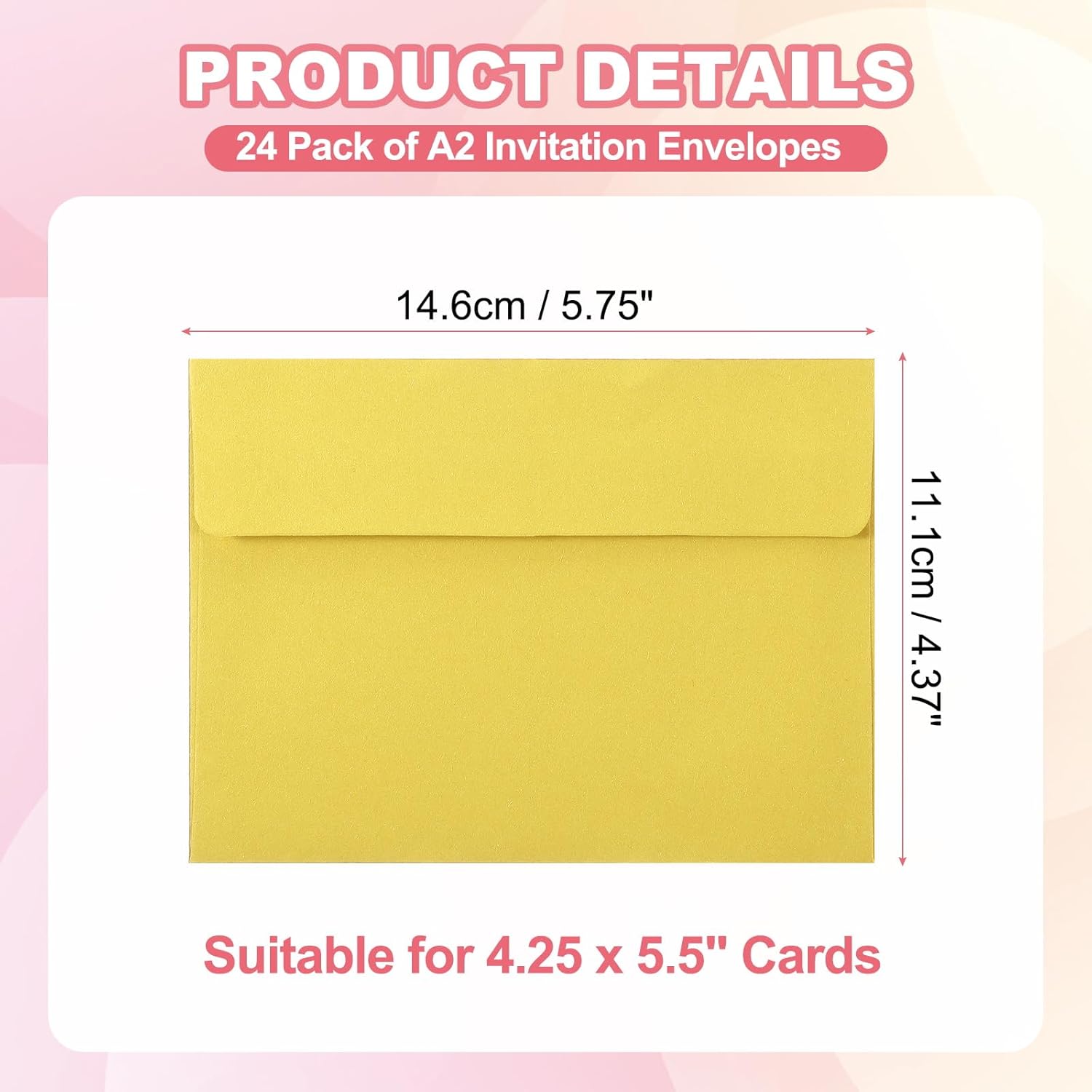 Materiale: Carta 110gsm; Colore: Giallo; Dimensioni: A2(11.1 x 14.6cm / 4.37 x 5.75pollici); Dimensioni Carte Compatibili: 4.25 x 5.5pollici; Lista Imballaggio: 24Pack di Buste Invito A2 Vantaggi: 1. Realizzate in carta di qualità elevata 110 GSM, queste buste per inviti misurano 4-3/8 x 5-3/4, spesse e resistenti per garantire che i contenuti rimangano confidenziali e protetti durante il trasporto. 2. Ogni busta adotta un comodo design autosigillante che non richiede colla o nastro, risparmiando tempo. 3. Queste buste A2 possono essere stampate utilizzando una stampante, permettendo di personalizzare liberamente le copertine delle buste Istruzioni: La busta autosigillante A2 presenta un lembo classico quadrato. Dopo aver inserito le carte, è possibile chiudere la busta strappando l'adesivo pronto all'uso sul lembo Applicazione: Queste buste formato A2 hanno un aspetto semplice e classico e sono disponibili in diversi colori per diverse occasioni, tra cui inviti, matrimoni, lauree, feste pre-matrimonio, affari, banchetti, compleanni, feste natalizie, Ringraziamento, ecc. Sono progettate appositamente per adattarsi a carte di dimensioni 4x5 pollici per garantire una perfetta corrispondenza. Nota: A causa delle differenze nei monitor, potrebbe esserci una leggera variazione nel colore di queste buste