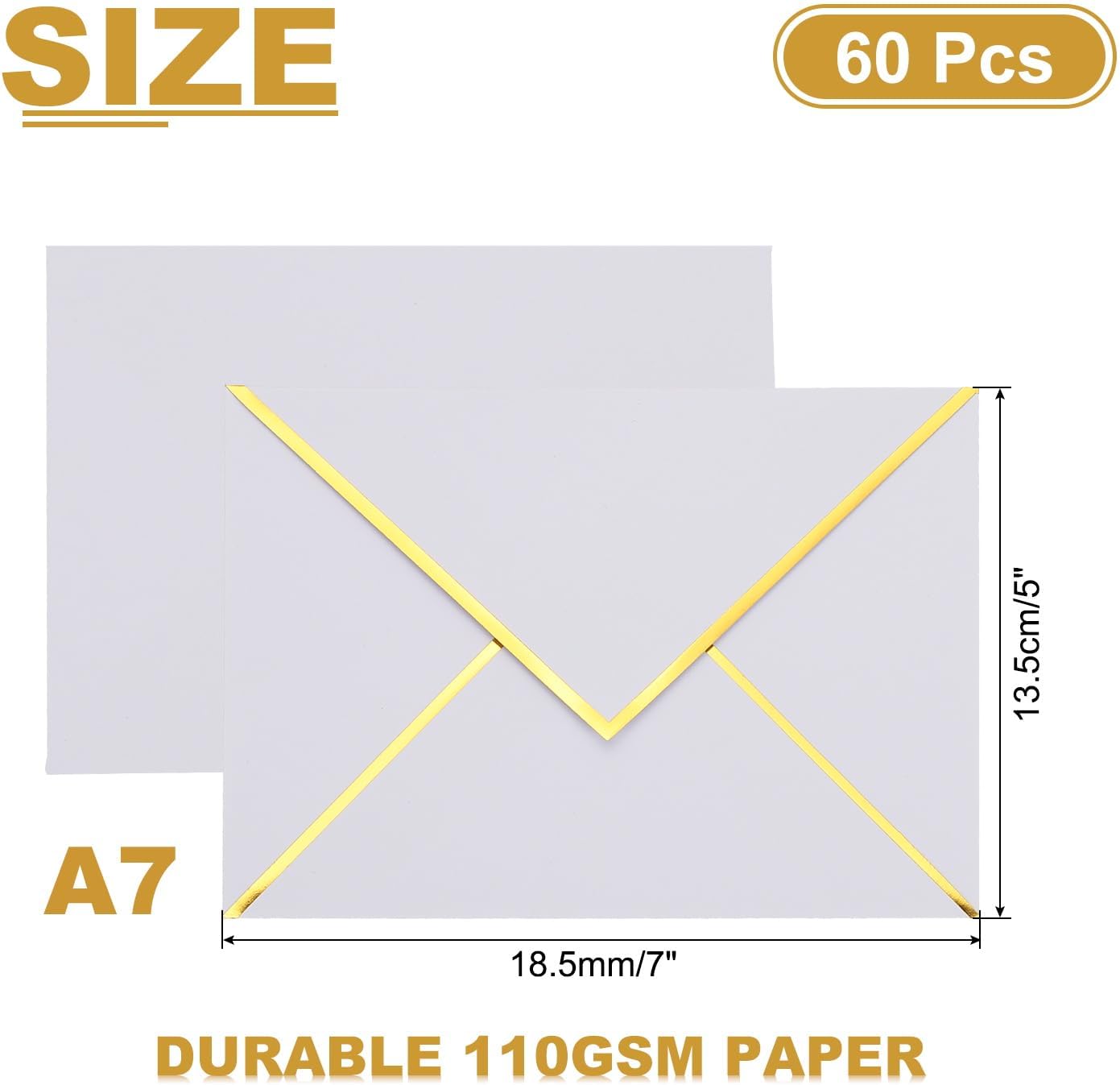 Materiale Carta Resistente 110gsm: Le nostre buste 5x7 hanno una superficie liscia e un colore vivace per attirare l'attenzione e aggiungere eleganza, oltre ad essere più spesse, robuste e durevoli. Riceverai 60 pezzi di buste per diversi usi, come inviti o spedizioni. BORDO ORO LUSSURIOSO - Il bordo in foglia oro sulle nostre buste è davvero qualcosa di cui parlare. Il design V Flap aggiunge un tocco di fascino e sofisticatezza a ogni evento, facendo risaltare i tuoi inviti. Che tu stia inviando inviti di nozze o corrispondenza aziendale, queste buste lasceranno un'impressione duratura. Sigillatura Forte: Il bordo ha un design a lembo gommato. Aggiungi un po' d'acqua al bordo gommato, premi per alcuni secondi e le buste saranno perfettamente sigillate per proteggere la tua privacy. Progetti Fai Da Te: Scegli il motivo che preferisci, stampalo sulla busta con una stampante o decorala con fiori secchi, adesivi e francobolli per personalizzare una busta unica e personale. Applicazione: Aspetto raffinato e buona qualità, le nostre buste si distinguono. Ampiamente utilizzate per biglietti di auguri, inviti di nozze, inviti per feste di compleanno, laurea, cartoline, foto, lettere, spedizioni, ecc. Ideali per esprimere i tuoi ringraziamenti o inviti a feste, come Natale, Ringraziamento e altre festività.