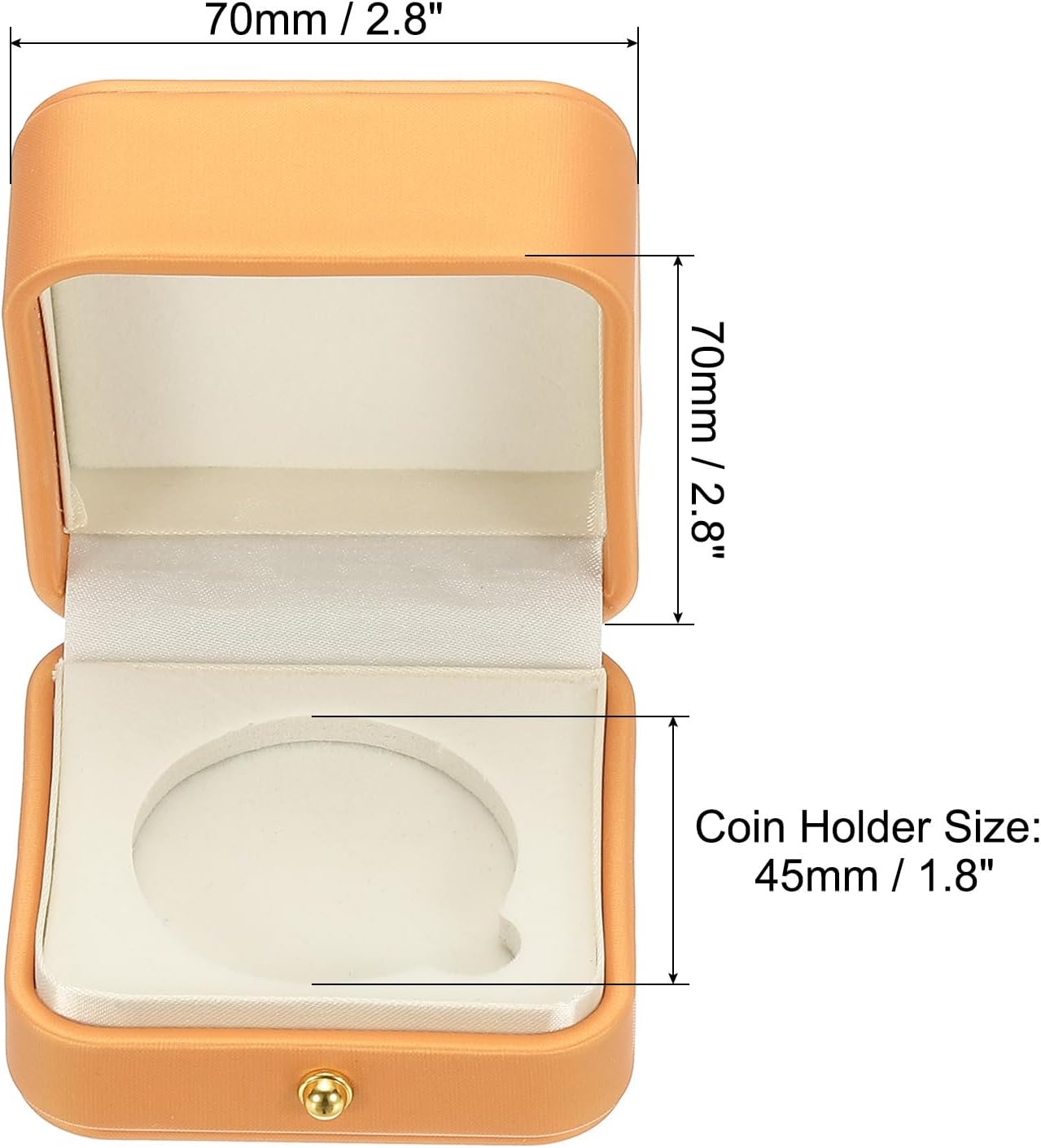 Colore: arancione; Materiale: pelle PU; Dimensioni del portamonete: 45 mm / 1,8 pollici; Dimensioni della scatola: 70 x 70 x 47 mm / 2,8 x 2,8 x 1,9 pollici (L*P*A); Lista di imballaggio: 1 x portamonete quadrato da collezione Vantaggio: il supporto per la raccolta di monete fornisce una cornice sicura e protettiva per le tue monete per proteggerle da graffi, polvere e altri possibili danni. Con il suo design trasparente, questo salvamonete consente una chiara visibilità e una facile identificazione della moneta all'interno. Il portamonete presenta un design elegante e raffinato, adatto a musei, collezioni e decorazioni. Istruzioni: il meccanismo di bloccaggio facilita l'inserimento e la rimozione delle monete e offre comodità ai collezionisti. Metti semplicemente le monete nella scatola. Applicazione: questa scatola per esposizione di monete è una soluzione versatile e affidabile per proteggere ed esporre la tua preziosa collezione di monete. Il deposito delle monete può esporre monete commemorative, campioni, francobolli, gioielli e altri piccoli oggetti. Il portamonete è adatto per collezionisti e decorazioni per la casa. Nota: controllare attentamente le dimensioni prima dell'acquisto.