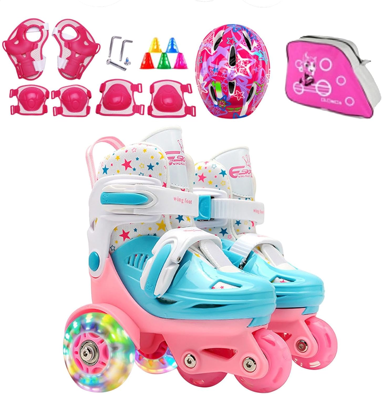 Maggiore stabilità I pattini a pois offrono una facile scorrevolezza che rende il pattinaggio senza sforzo per i principianti. Con il design a punto stabilizzato e il design a doppia frenata sulla ruota posteriore, rallentare o arrestare è un gioco da ragazzi. Robusti e affidabili: i pattini a pois sono dotati di un robusto guscio in PP che può resistere a lunghe ore di pattinaggio. Con una fodera interna confortevole e traspirante, il tuo bambino si divertirà molto a rotolare su questi pattini senza alcun fastidio. Lavorazione sofisticata: sapientemente progettati per durare a lungo, questi pattini a rotelle per bambini sono dotati di ruote in gomma PU ad alta elasticità, che forniscono una scorrevolezza senza cuciture su qualsiasi superficie. Migliora l'esperienza di pattinaggio: divertiti all'aperto con questi pattini regolabili e la custodia inclusa. Goditi le attività all'aperto con maggiore sicurezza grazie alle ginocchiere, alle gomitiere e ai caschi inclusi. Ampiamente usato: per coloro che cercano di imparare a pattinare, questi pattini a pois sono adatti per molteplici scenari come parco, palestra, parco giochi o pista di pattinaggio, fornendo un versatile e .