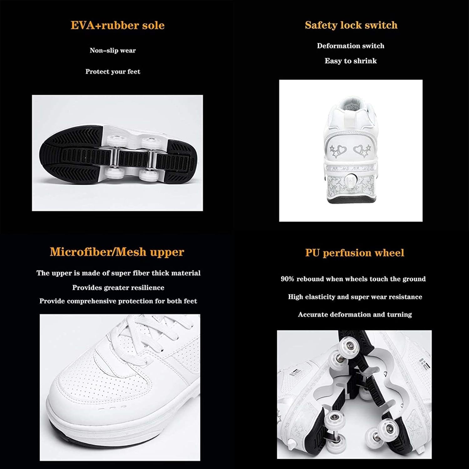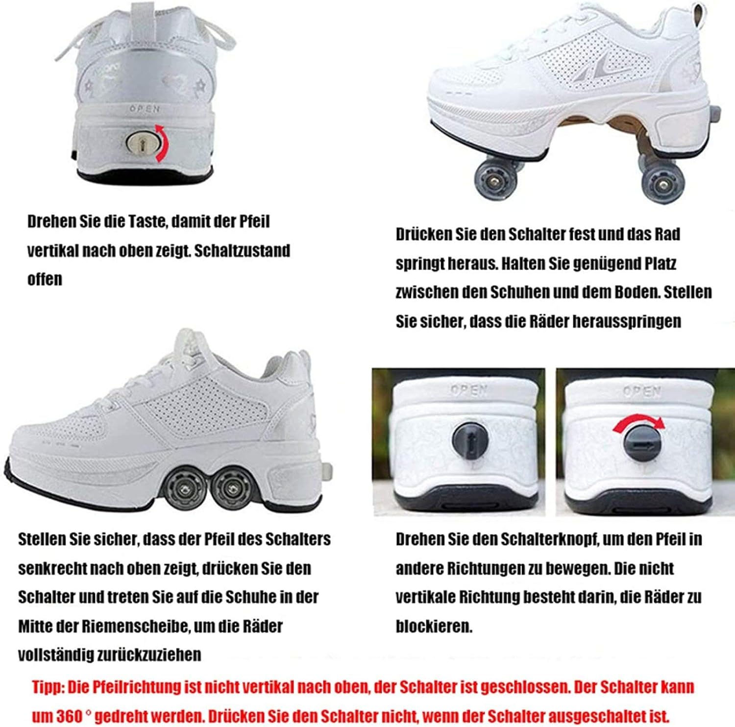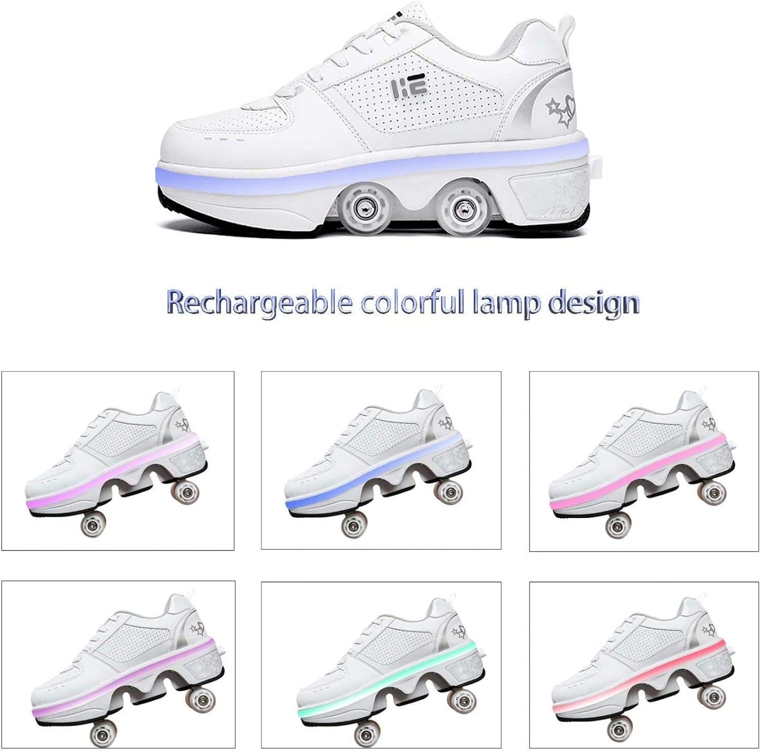 ★ Pattini A Rotelle Due In Uno: I Pattini Multiuso Regolabili Sono Diversi Dai Pattini A Rotelle Tradizionali Sul Mercato. Le Ruote Nascoste Possono Essere Nascoste Come Normali Scarpe Da Ginnastica, Quindi Puoi Regolare I Pattini A Rotelle, Che Non Solo Possono Pattinare Ma Anche Correre. ★ Deform Wheel Roller Shoes Materiale: I Pattini A Rotelle Regolabili Multifunzionali Sono Realizzati In Microfibra, Suola In Gomma Ed EVA. Non Dobbiamo Solo Prestare Attenzione Alla Capacità Portante Della Ruota, Ma Anche Prestare Attenzione Alla Selezione Del Materiale Della Tomaia Per Produrre Pattini A Rotelle Di Alta Qualità. ★ Protezione Del Piede: Scarpe Da Pattinaggio Di Deformazione Con Lacci Tradizionali. Come Con Le Scarpe Da Ginnastica, Puoi Regolare I Lacci Per Una Sensazione Più Confortevole. Design Unico Del Pulsante Invisibile Per Prevenire L'apertura Accidentale: C'è Un Pulsante Sul Retro Della Scarpa, Premilo E La Ruota Si Aprirà. Tenere Premuto Il Pulsante Per Spingere Il Rullo Nella Piastra Inferiore E Rilasciarlo. ★ Design Luminoso Unico: I Nostri Pattini A Rotelle Sono Diversi Dalle Altre Scarpe, 7 Luci LED A Colori Disponibili E USB Ricaricabile, La Porta Di Ricarica USB E L'interruttore Sono Nascosti All'interno Della Scarpa. Sembra Bello, Non è Vero? ★ Regali Speciali: I Pattini A Rotelle Regolabili Multifunzionali Sono Adatti Per Amici Di Tutte Le Età E Sport Unisex. Il Rullo è Anche Uno Degli Sport Per Il Tempo Libero Più Tradizionali E Puoi Giocare Con I Tuoi Amici O Bambini Nei Fine Settimana O Regalarli Come Regalo Di Natale.
